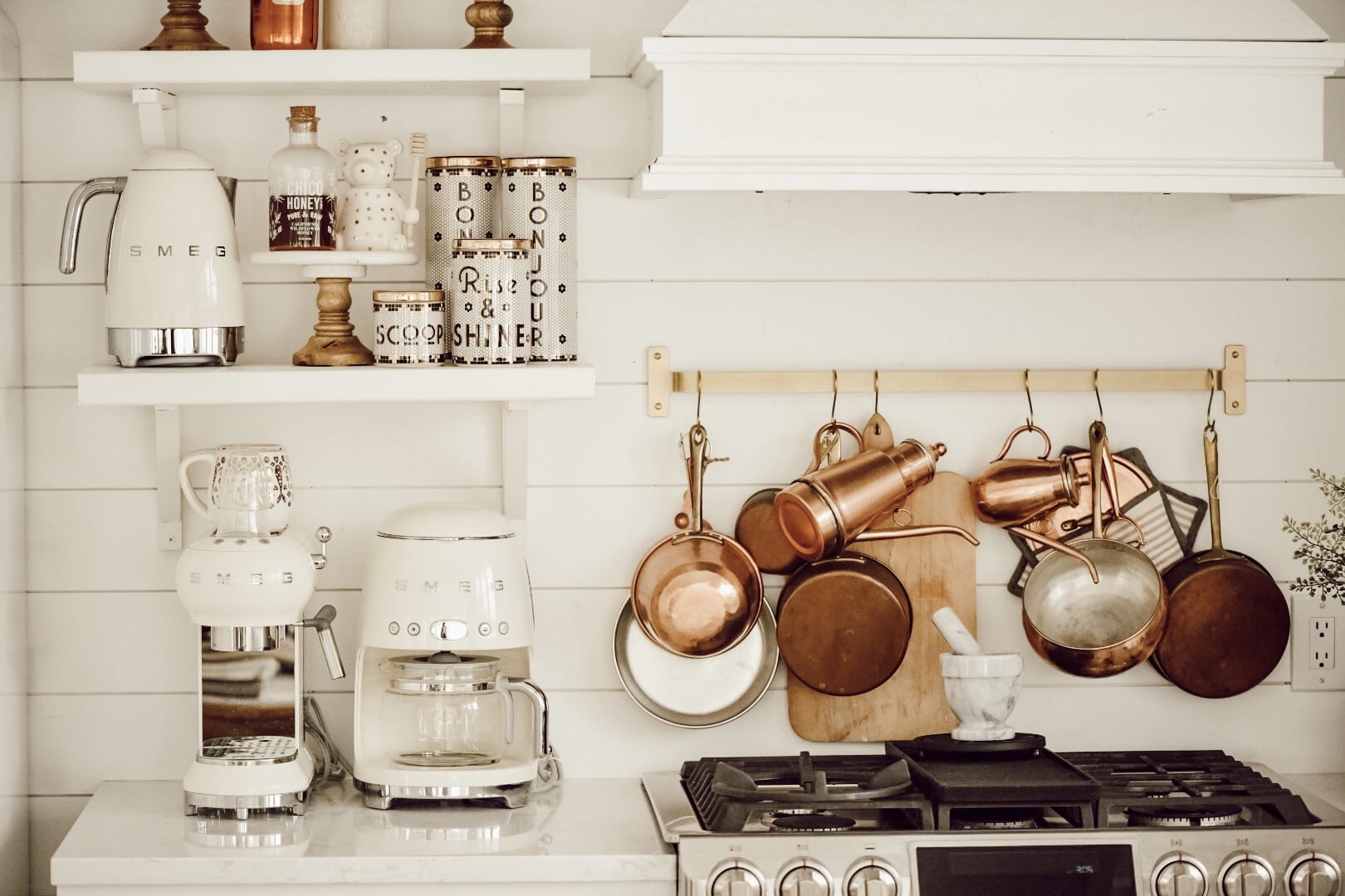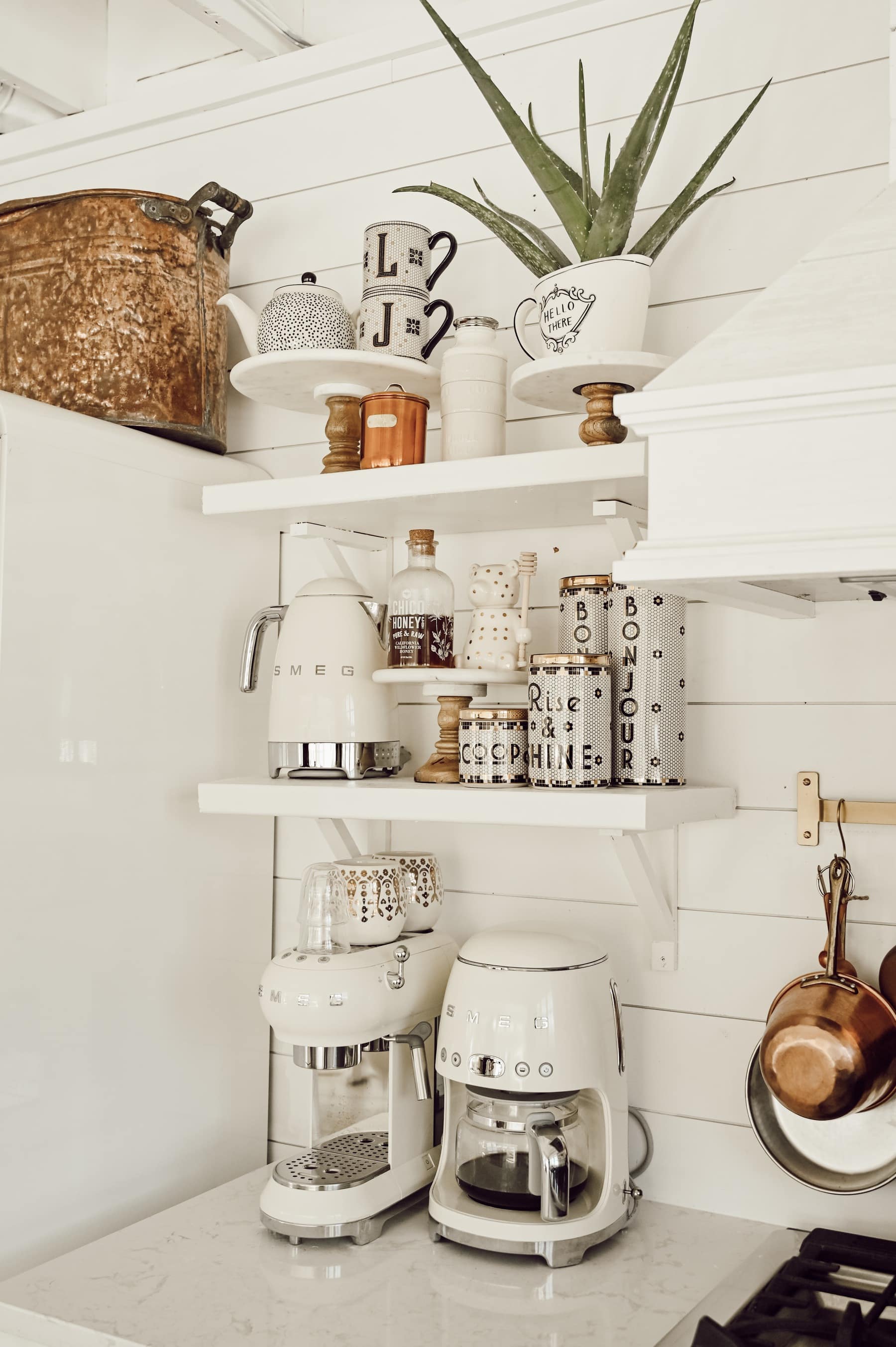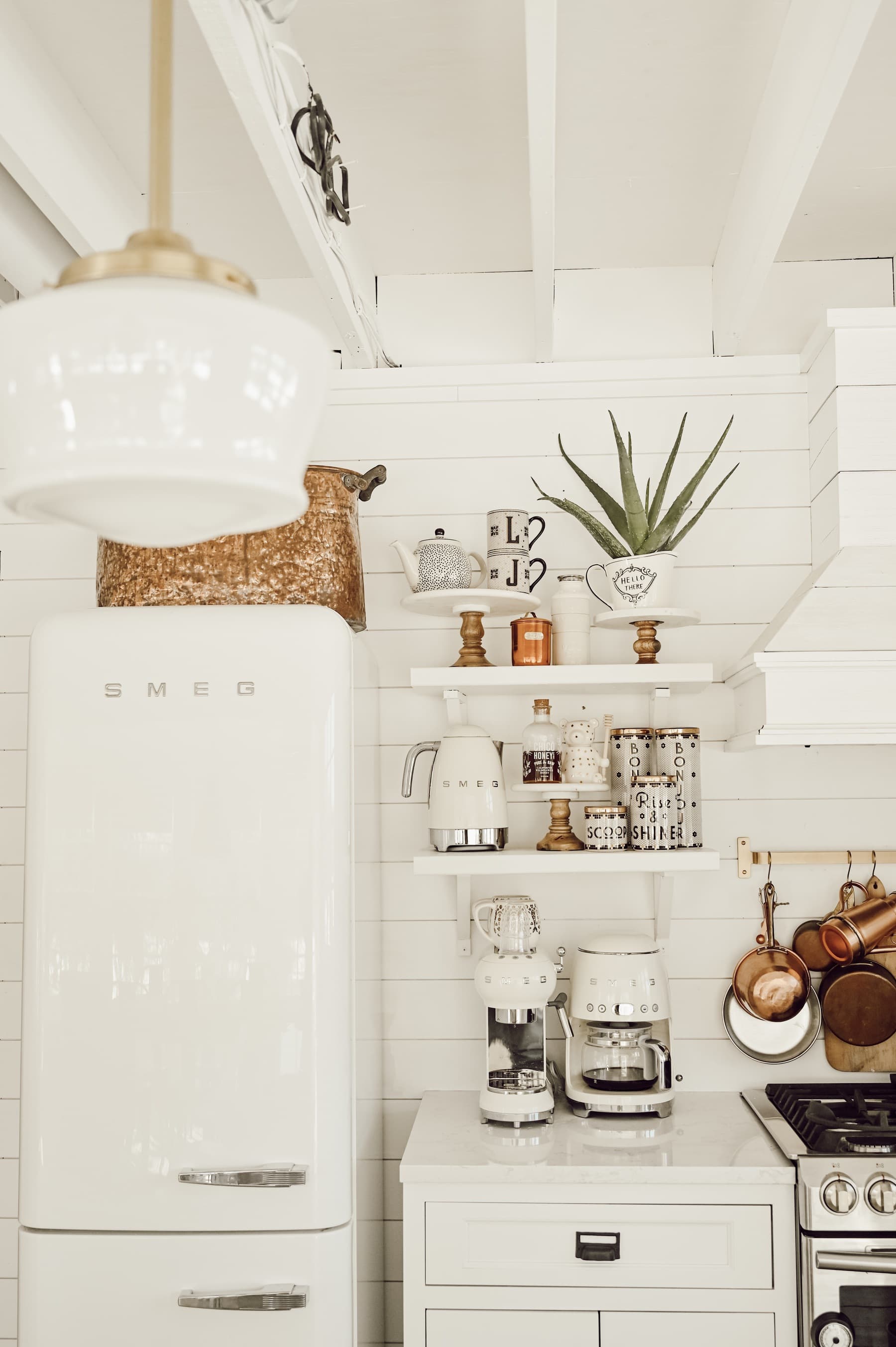 Open shelving is a design choice that can be not only cost saving but a great way to show of some style within your kitchen. Like the rest of my house, I have shuffled around my shelf decor and displays through adding small Smeg appliances to displaying vintage stoneware. You could easily use your open shelving to show some splashes of color through unique kitchenware or kitchen tools. I am so in love with our shelves and their versatility, and they keep me honest and tidy by forcing me to keep our plates clean and organized.