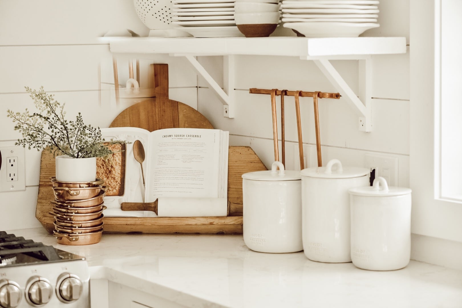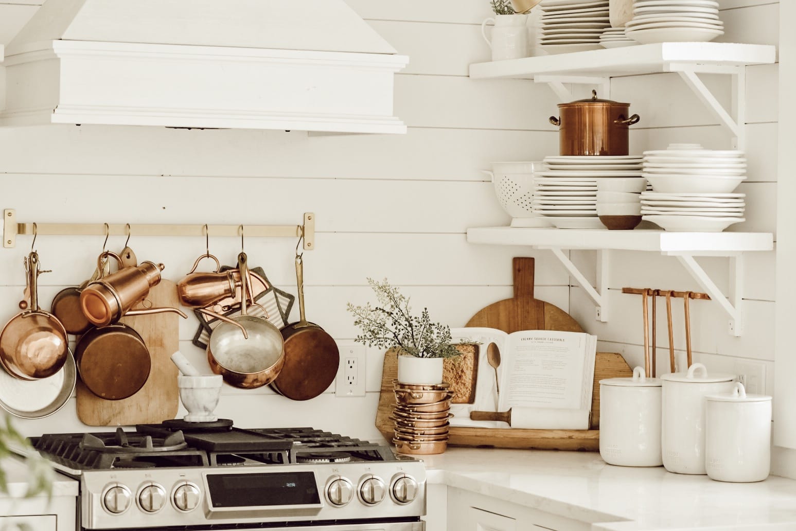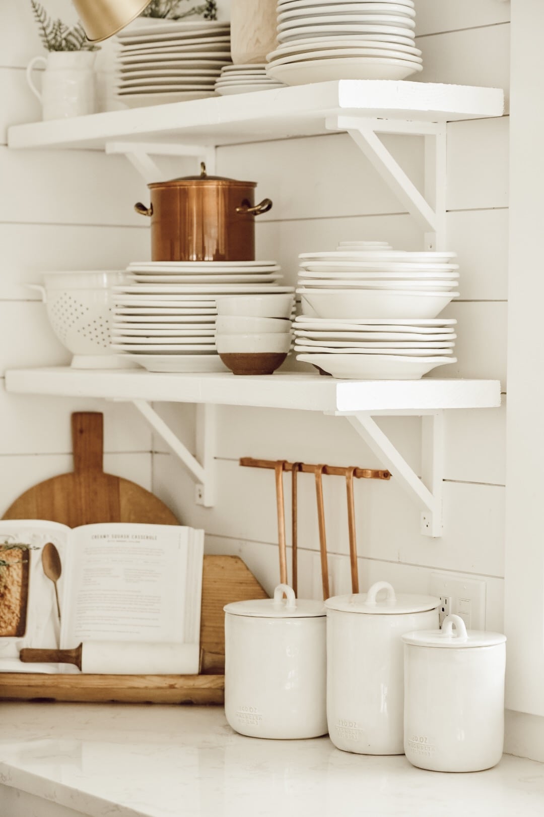 Open shelving is a design choice that can be not only cost saving but a great way to show of some style within your kitchen. Like the rest of my house, I have shuffled around my shelf decor and displays through adding small Smeg appliances to displaying vintage stoneware. You could easily use your open shelving to show some splashes of color through unique kitchenware or kitchen tools. I am so in love with our shelves and their versatility, and they keep me honest and tidy by forcing me to keep our plates clean and organized.