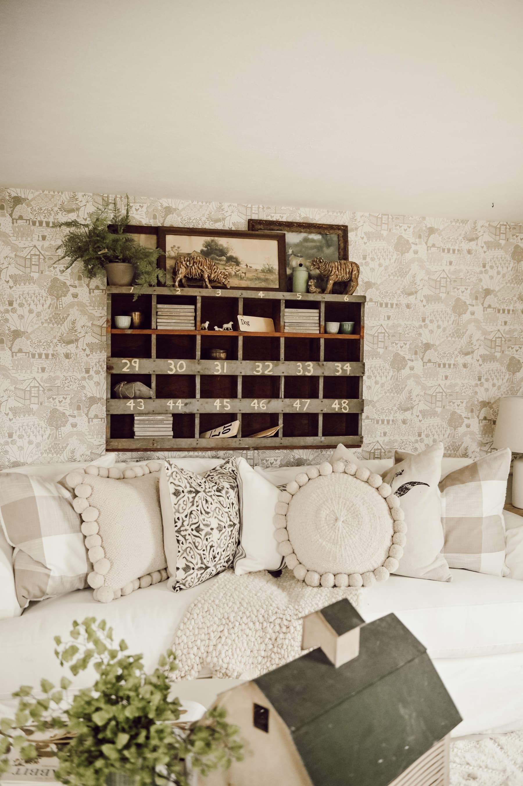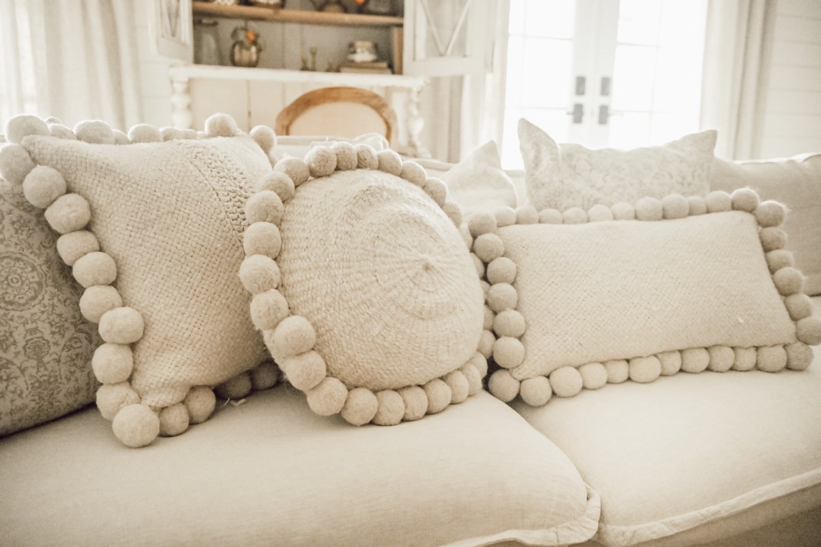 Liz, as usual your styling is just lovely! But, for me to spend over $100 on one pillow would be irresponsible with my budget….sooo, I am going to try to make a sort of ‘knock-off’ with drop cloth, a matching color of yarn, and a pom pom maker – wish me luck! And I t Laurindahank you for sharing your beautiful home!!
