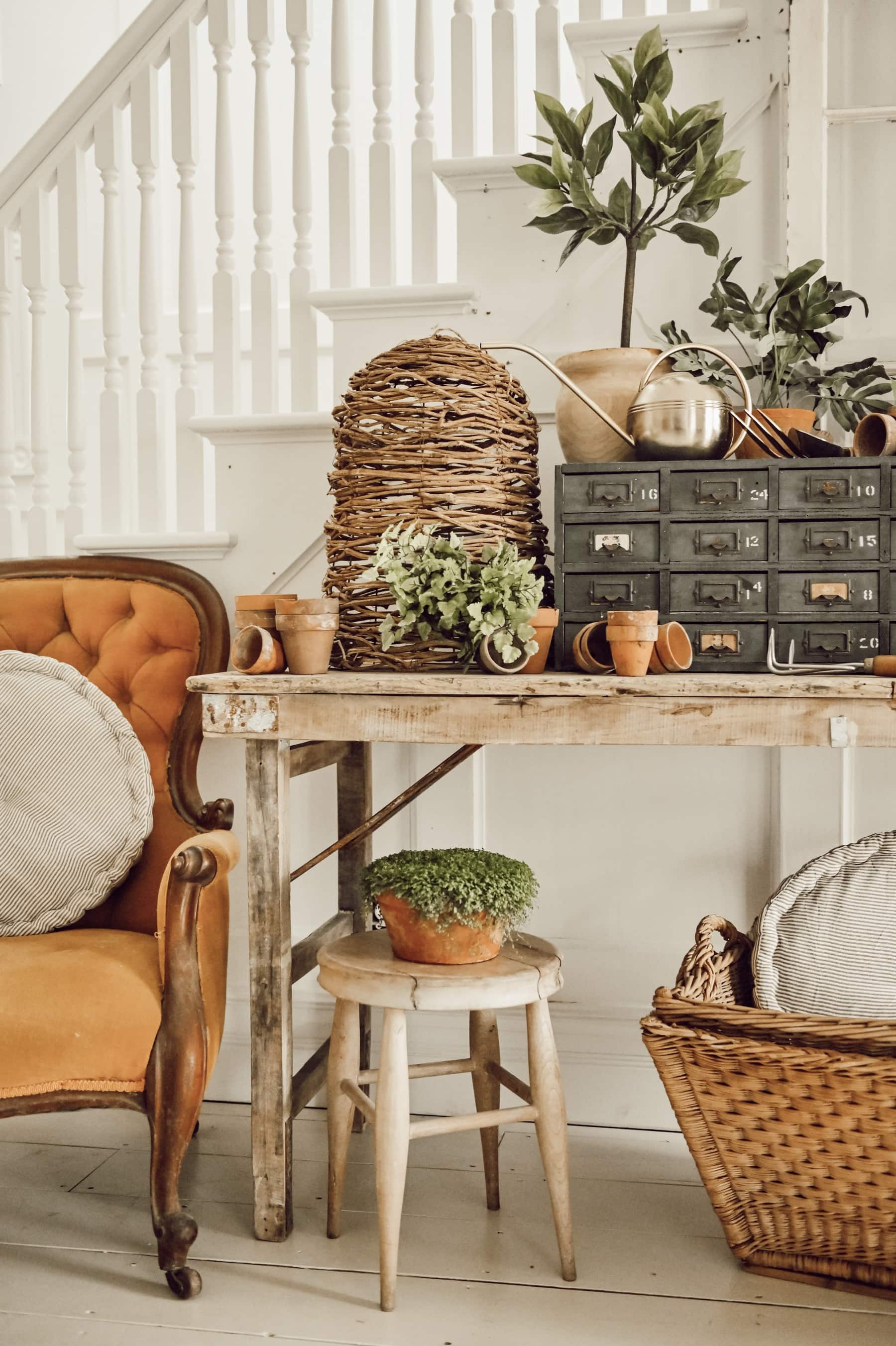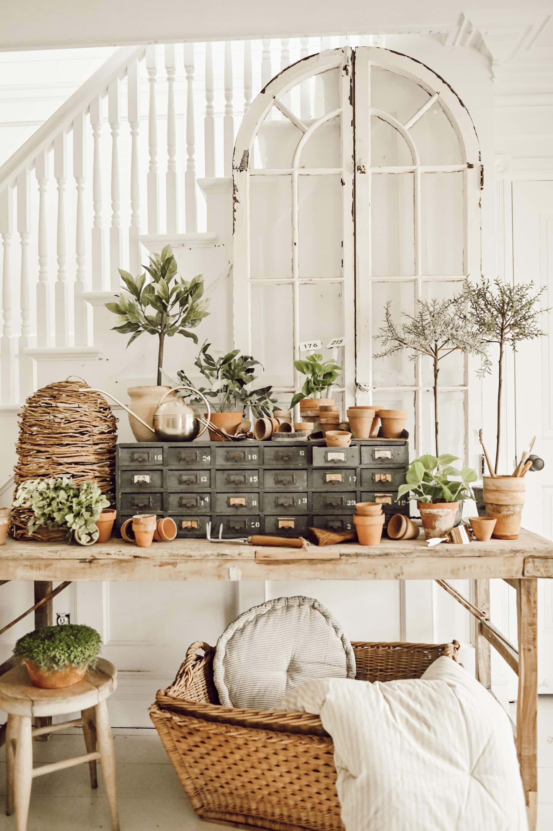 It was lovely, but you know that I always want to try new things & once I get a new idea I have to see what it will look like & then I share it here on the blog in my decorating ramblings in hopes that it will inspire you guys in some way or another. For this one I hope it inspires you on ways to decorate for spring, ways to decorate with windows, & ways to decorate with antique garden finds… so much in such a small space! Here is what it’s looking like today…