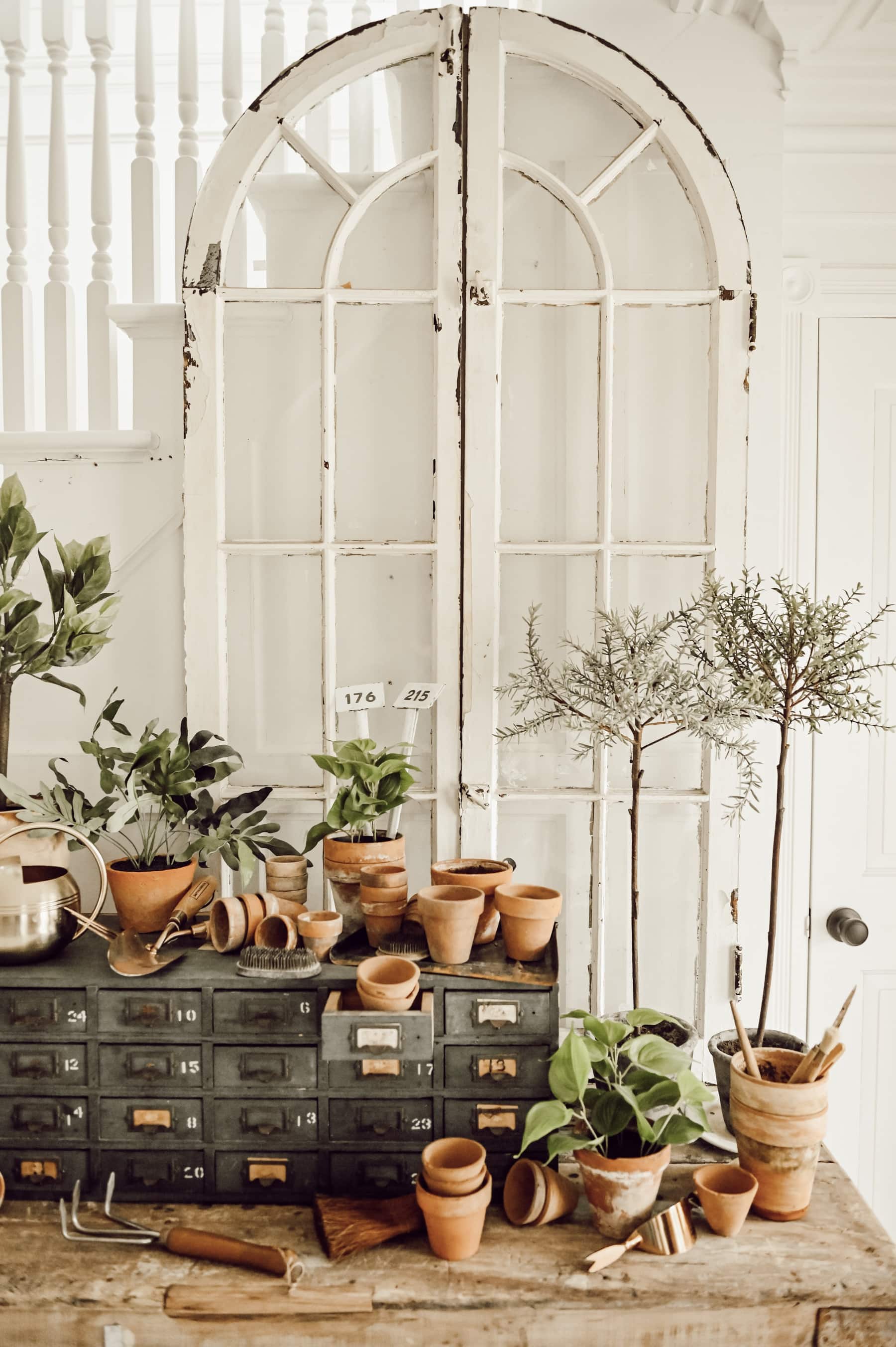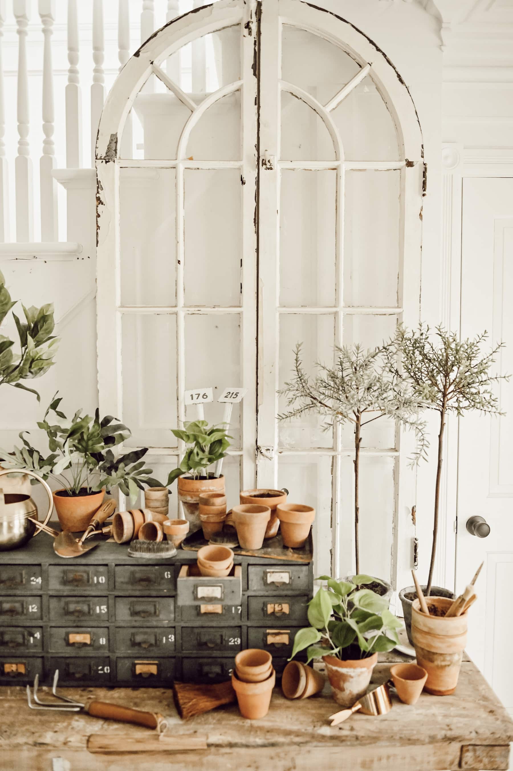 Having a greenhouse is in my bucket list! This is so beautiful and has great character! Beautiful windows and I love this little drawer chest-awesome piece!
