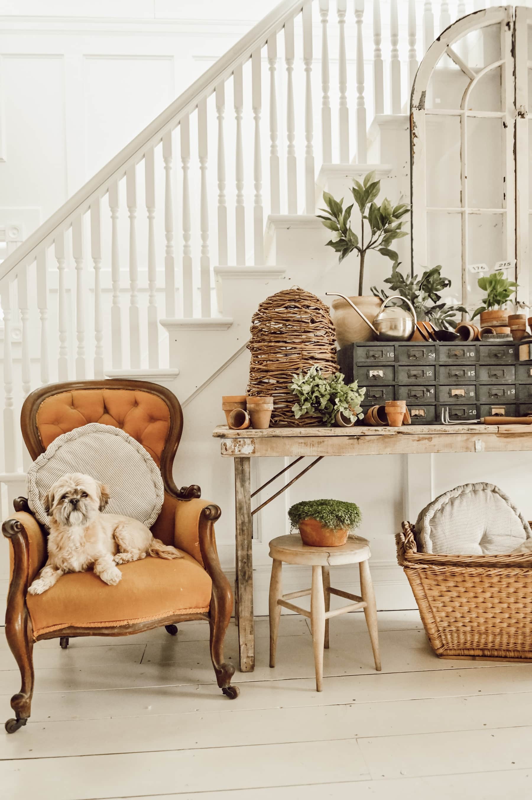 The big change? THOSE WINDOWS! I find those on an antique excursion the other day & I instantly knew I wanted to try them in this greenhouse spring vignette in our entryway… you know, the one that I blogged [HERE]. So I took down the huge gallery wall [don’t worry all things are saved & I can pop the wall back up at any time thanks to command strips!] Don’t panic! I never do.. I love changes & I love trying new things. I’ve said it before, but our house is my canvas. Like another artist uses a paint brushes and a canvas… I use our home to show and share ideas from my brain. Of course there are some other little changes like that antique chair next to the table that I’m going to deconstruct [tutorial coming soon], but I wanted to share it with the old fabric on it first because I thought it was bright and happy. I’ve been really feeling the “fallish” colors for spring this year & I’m not sure why, but let’s roll with it. Those round pillows? They are from my girl tailored haven’s collection over at Painted Fox & most of everything else that’s added are antique items, but I hope this inspires you to look for these things the next time you are out antiquing!