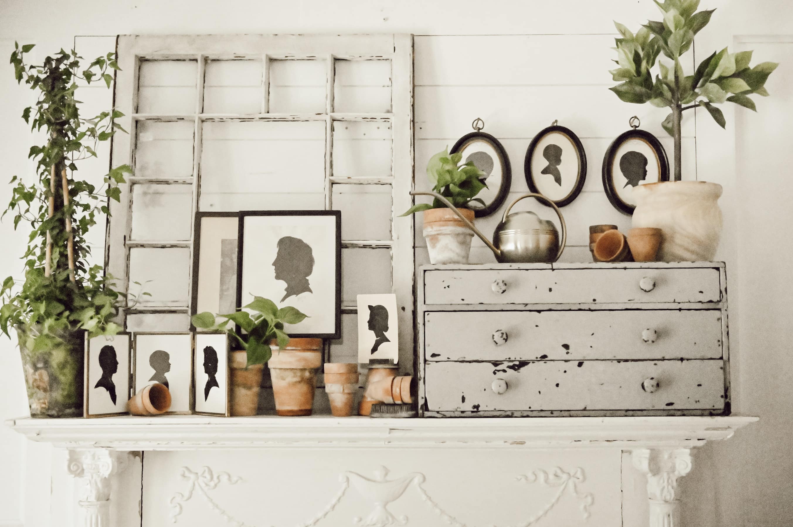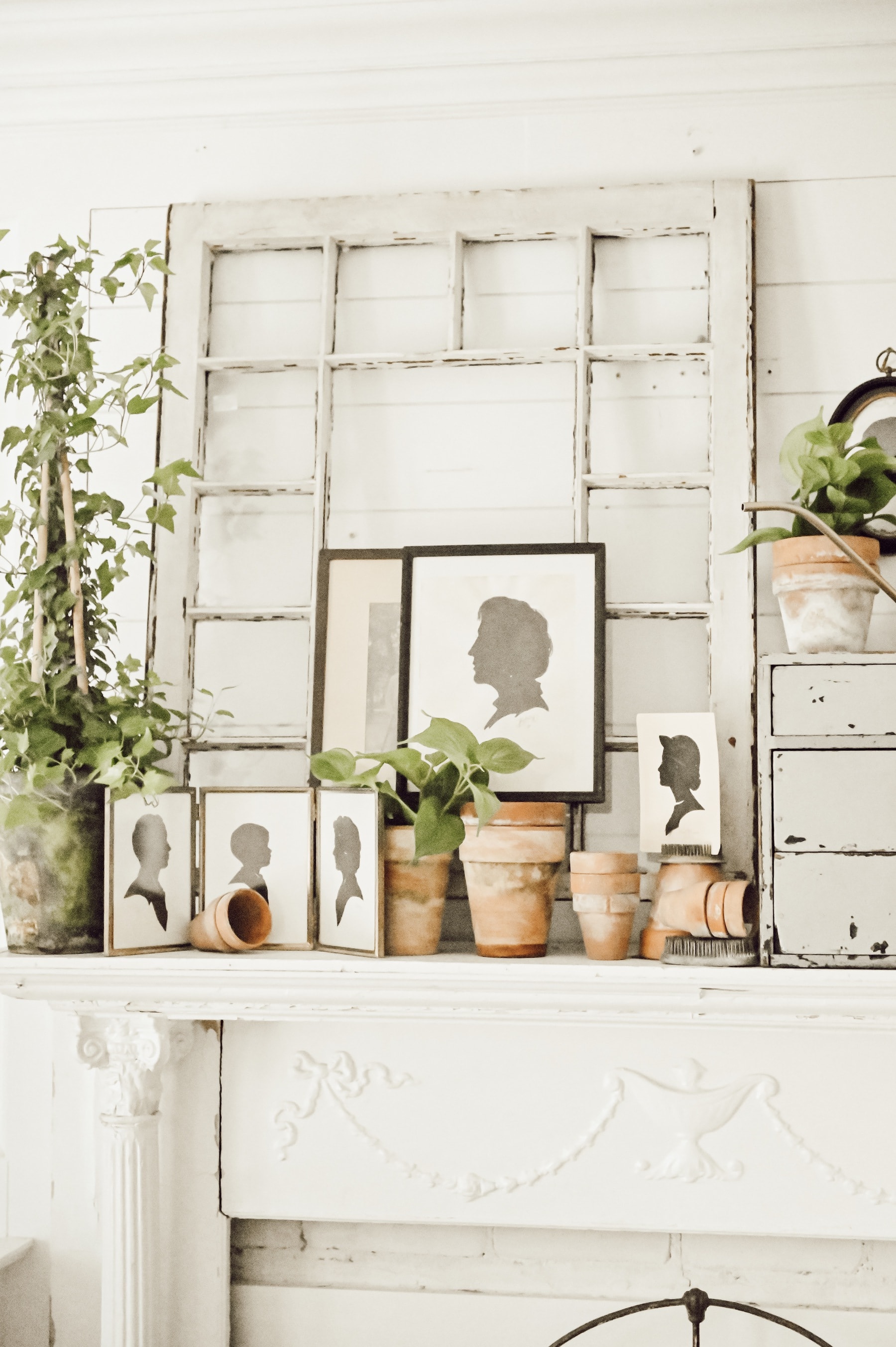 A fun spin on my cottage greenhouse mantel [HERE] I did a few weeks ago huh? I love doing things like this where I show a space styled in two different ways to hopefully inspire you and show you what some small tweaks can do to a space. For this look, I hung some of my silhouette prints and layered some on the mantel with some of the items I used in the last mantel look like that antique window, terra-cotta pots, & of course some greenery. This is another great example of layering decor which I blogged about this week [HERE]. All the layers make this look super cozy & really interesting.
