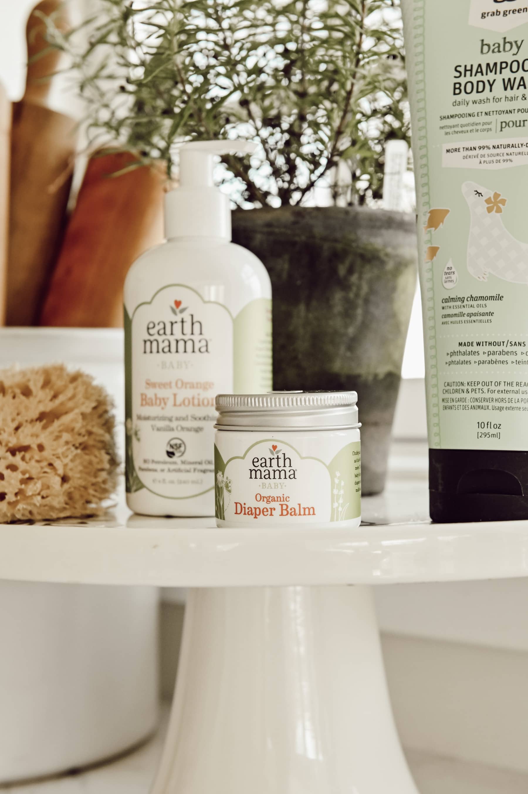 1.) Grab Green Baby Shampoo & Body Wash – The Chamomile scent is our favorite! 2.) Mrs. Meyer’s baby laundry detergent – You know I already LOVE Mrs. Meyer’s so we were super excited to see they also made items for baby to that work amazing! 3.) Earth Mama Diaper Balm – For the baby bootie :)4.) Earth Mama Baby Lotion– For the baby tummy :)5.) Seventh Generation Baby Wipes – Best thing for the baby bootie also 🙂