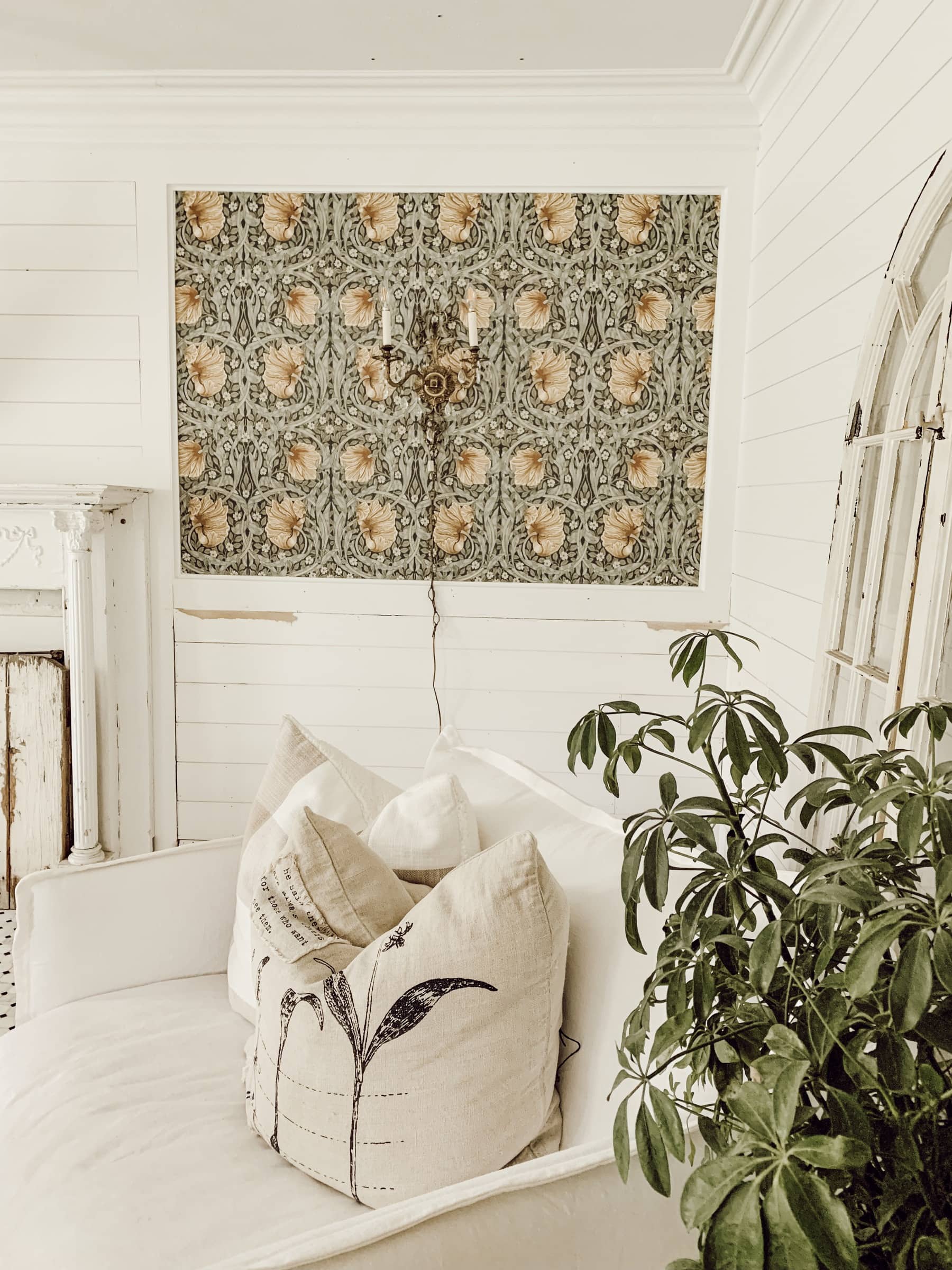 We wanted to give either side of the fireplace a makeover so we I ordered some wallpaper from Wall Paper Direct & Jose hung it like a pro! It’s even the real deal wallpaper so I was extra proud. In these photos I have wall sconces hanging in the middle, but they won’t be there I was just testing some things out in the spot. We ripped out the bookcases that were on either side of the fireplace & Jose put shiplap under the wallpaper section as well. I wanted to bring some pretty interest to this back wall as it can sometimes get lost in the mix. I found this gorgeous wallpaper months ago & fell in love but didn’t have a spot for it. It’s a little much for our house in an entire room so we decided to put it in these pre-trimmed area and it worked out perfect!