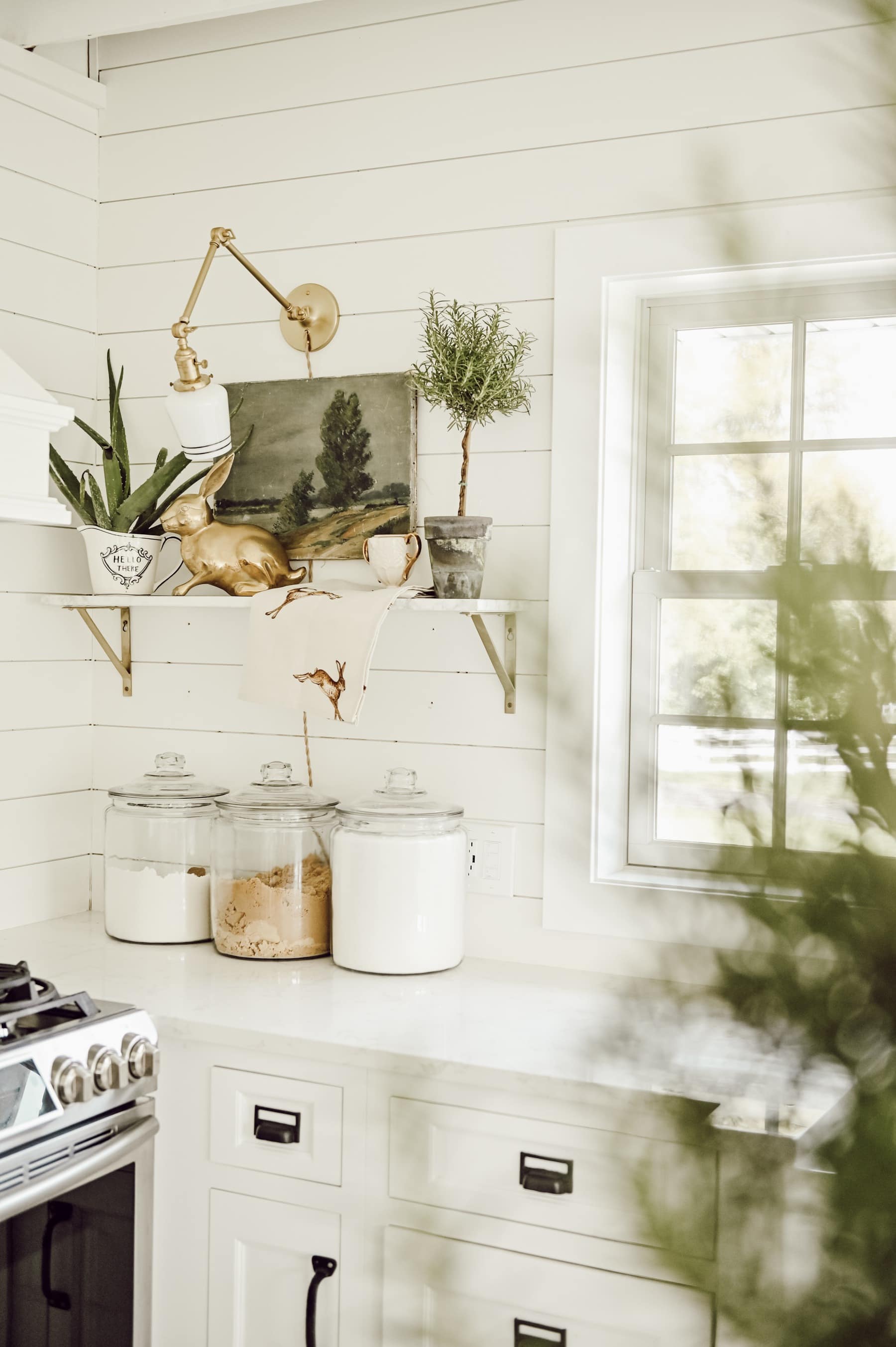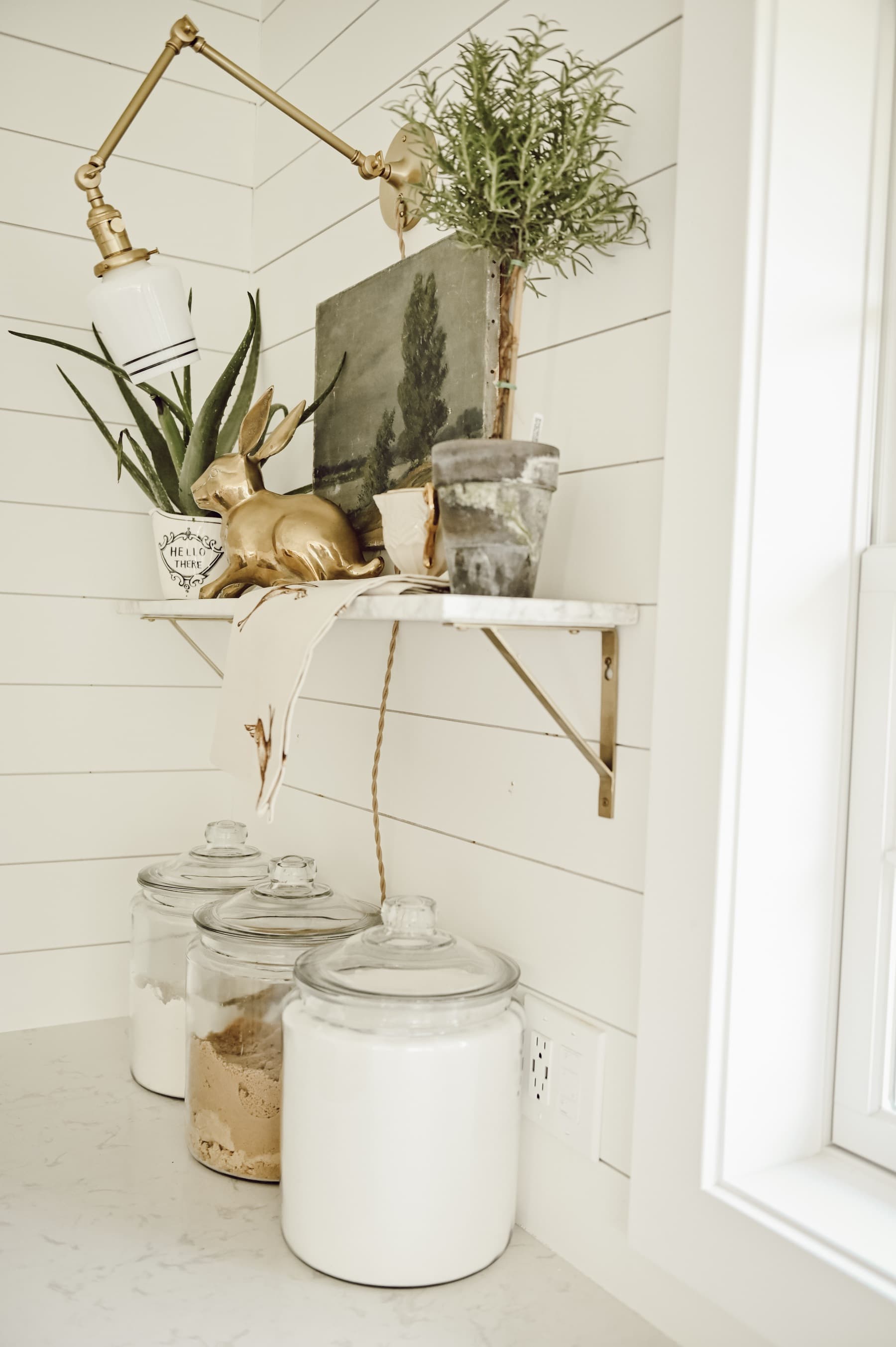 Love this shelf styling with the bunnies, and the painting!