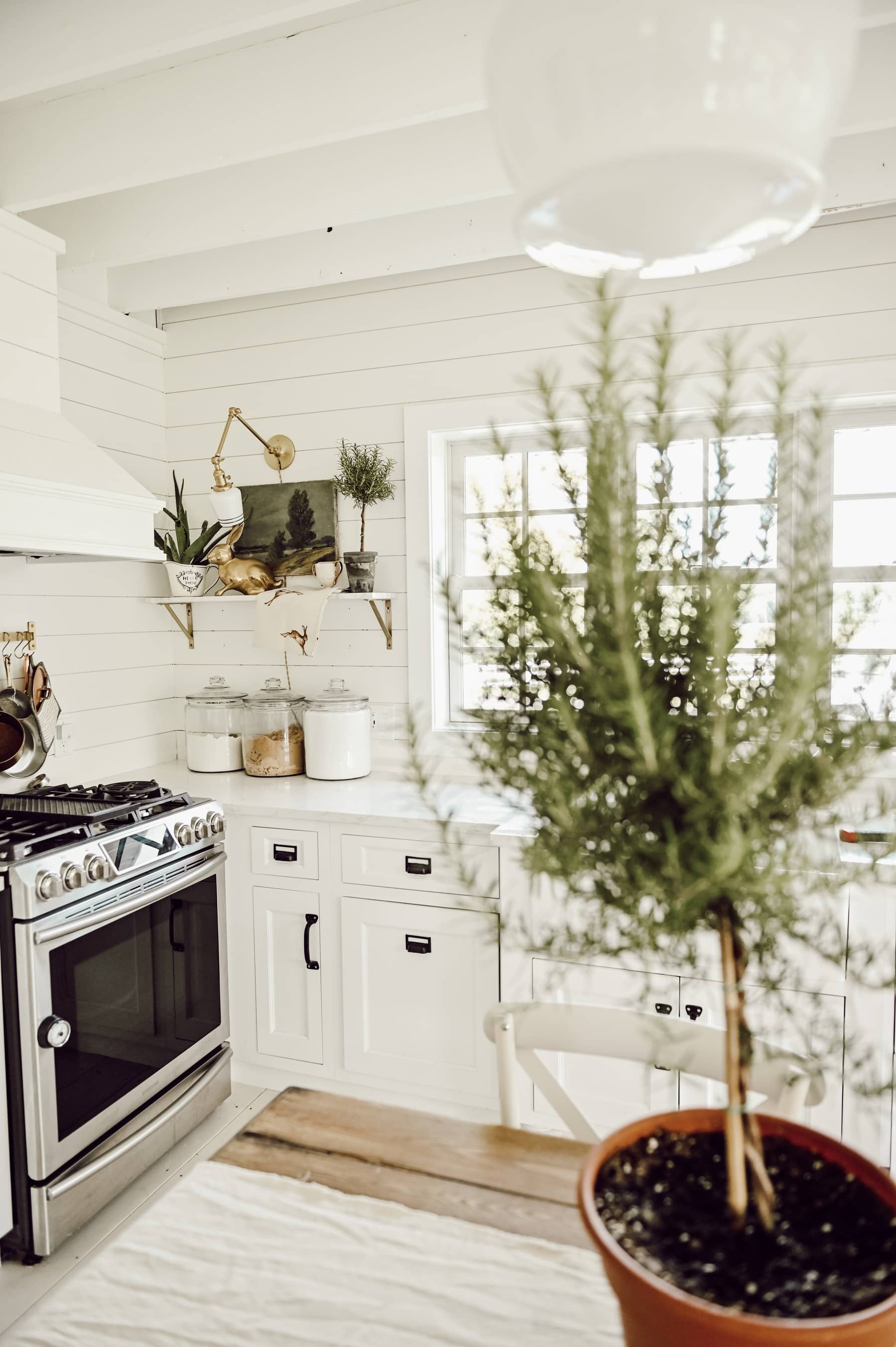 For this shelf, starting from left to right (as you read), you eye starts high with the oversized Aloe plant. And is breezes over to the center of the shelf, it comes down to the rabbit and the landscape painting. The rabbit apron provides texture to space by breaking up the line of the shelf, and then the eye travels back up to the top of the topiary.