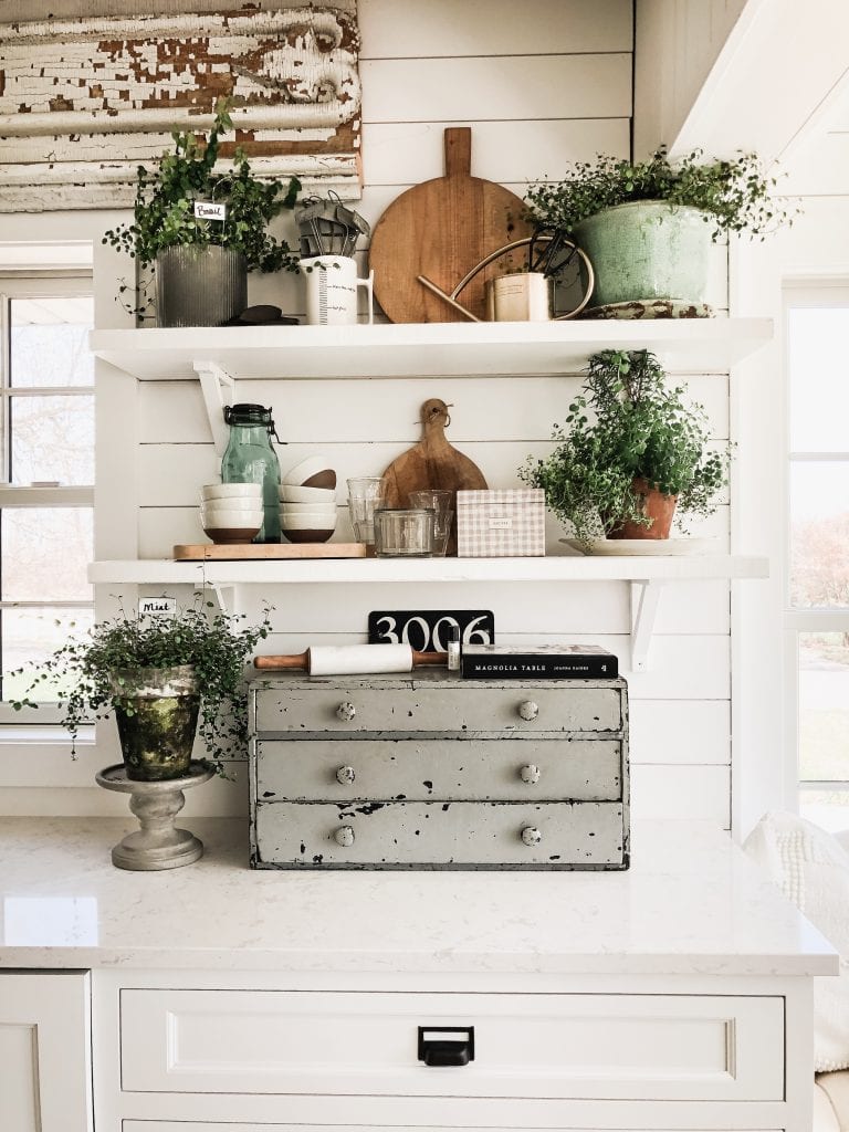 Everything I do at our home tends to give those antique farmhouse vibes so it’s no surprise here, but adding in antique elements to your open shelves can still make them functional but yet extra charming at the same time. Chippy architectural salvage, worn wood tones, & functional vintage pieces like those drawers make these kitchen shelves inviting and useful at the same time. My FAVORITE way to style open shelves in the kitchen is displaying antique finds among the items we use daily.