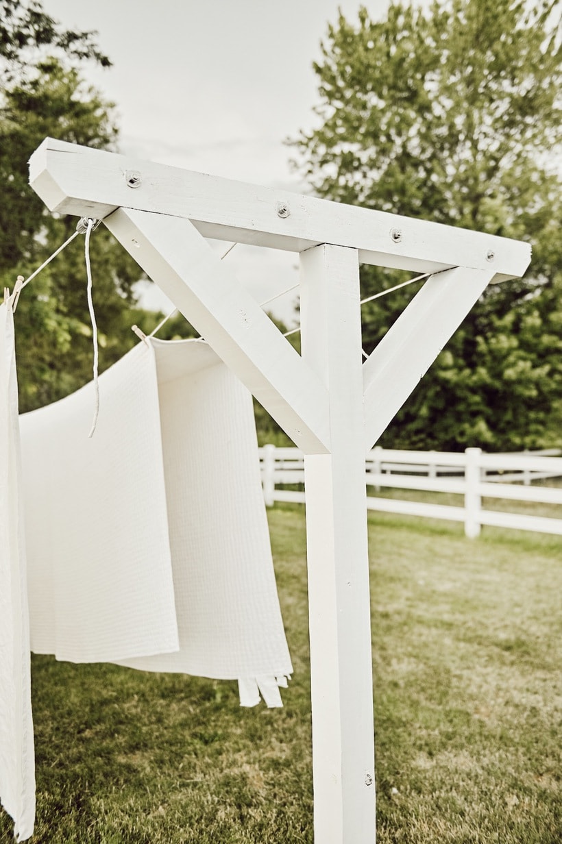 One of the biggest reasons I wanted a DIY clothesline is because I hate using our dryer in the house. It just doesn’t dry our clothes like a good old fashioned clothes line does… & doesn’t every farm need a clothesline? I agree!