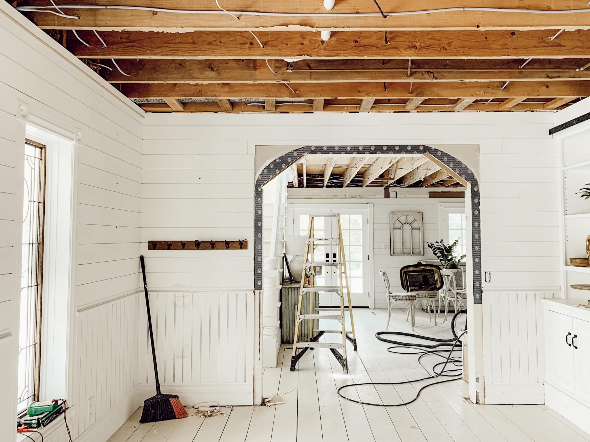 So we made some major moves in our home the past few weeks. After falling in love with opening up our ceiling in our kitchen… we finally pulled that design choice into the rest of the house, yes we tore out our ceilings throughout the entire main floor.
