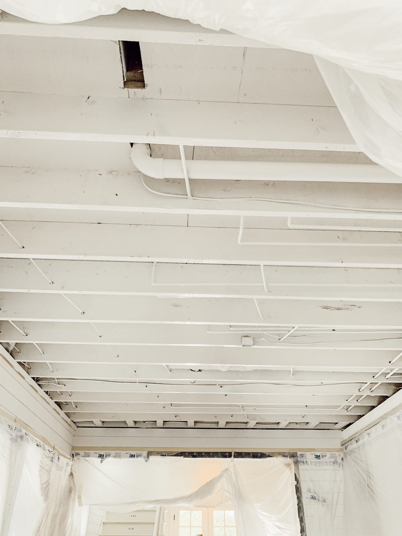 This is organically by design and not part of the plan. We haven’t made any remodels to our bathrooms upstairs, still flipping and flopping with design. Nonetheless, we can see all of the plumbing from below, making our remodel very accessible and easier to see what we are able to do. We have already added/moved lighting electrical boxes too. We did get asked if the sound has changed… can we hear more upstairs or downstairs? No, in fact Cope’s bedroom is right above the sunroom where we spend most of our time and movie night. And being in his room, you cannot hear anything from his room.