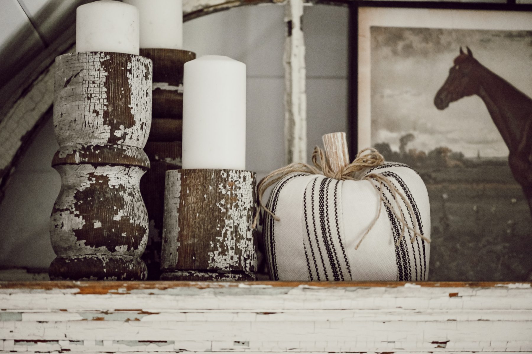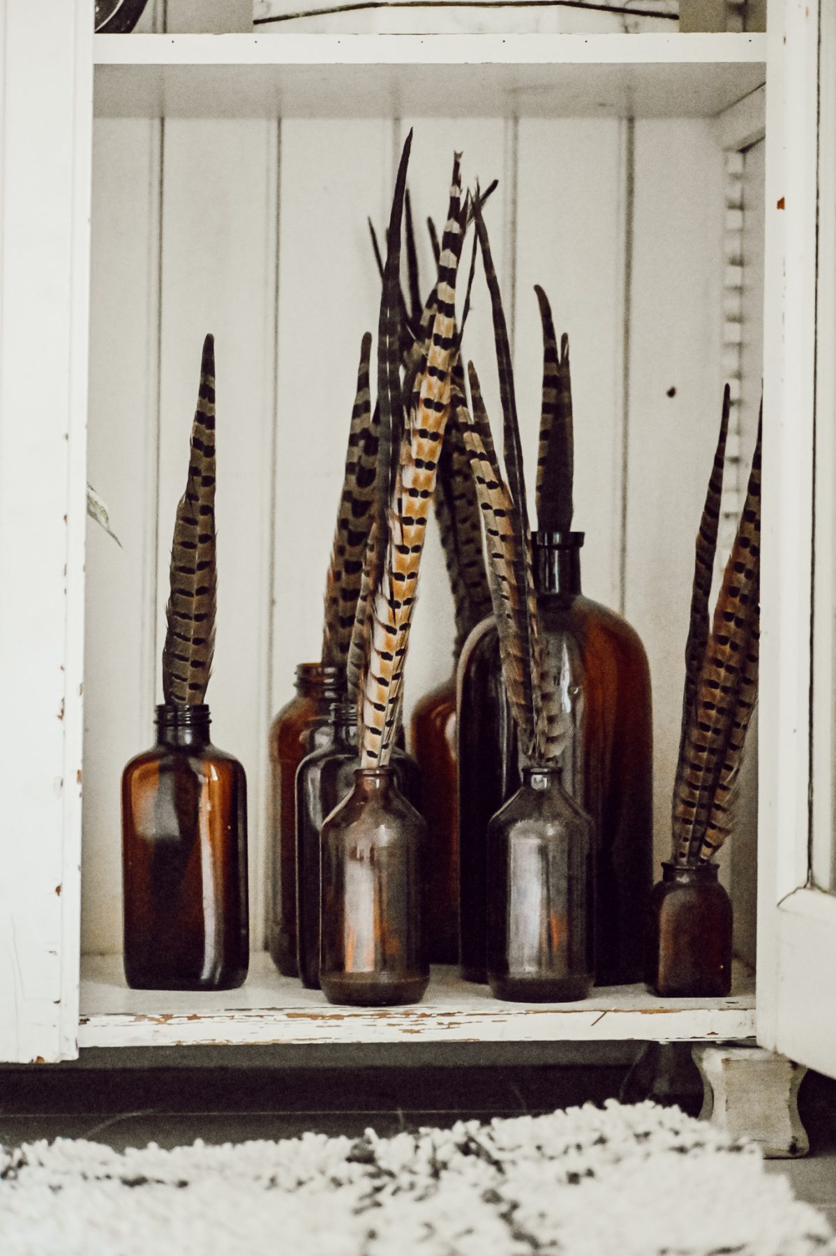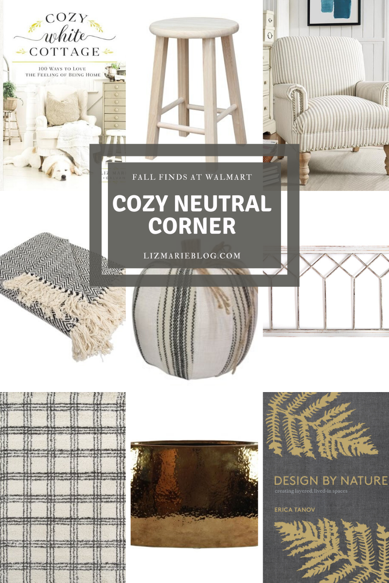 First of all, can we talk about this rug? IT’S FROM WALMART! RUN & GET YOU ONE [HERE]. It is so cozy and so cute!! I knew it looked good online, but it’s even better in person. I can’t tell you how many times I’ve found myself laying on the rug with Cope & with Winnie… we’ve all been enjoying it. I chose to set it in from of this cabinet in our under-the-stairs-nook & I love the combo of the chippy piece with the rug. In the cabinet I styled a lot of my favorite collections including some books, antiques, & even a few blankets to cuddle up with in this chair from Walmart [HERE]. A few of the blankets are actually wool antique finds, but I got this blanket [HERE] from Walmart as well. For a little fall touch I added these cloth pumpkins [HERE] which were a fun take on fall decor. I wanted this space to be one you could grab a book & blanket out of the cabinet & sit on the chair & get cozy while putting your feet on the comfy rug… a perfect cozy corner with Walmart!