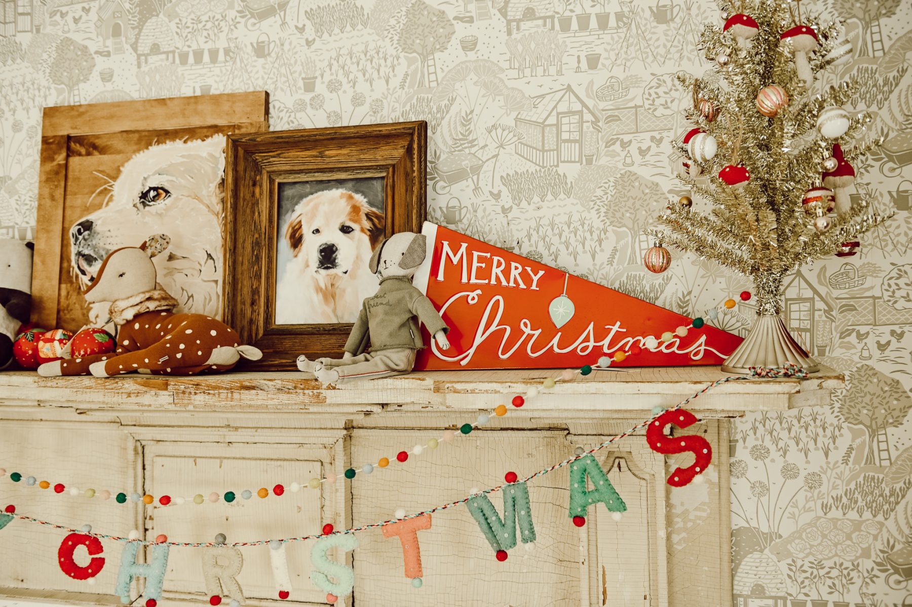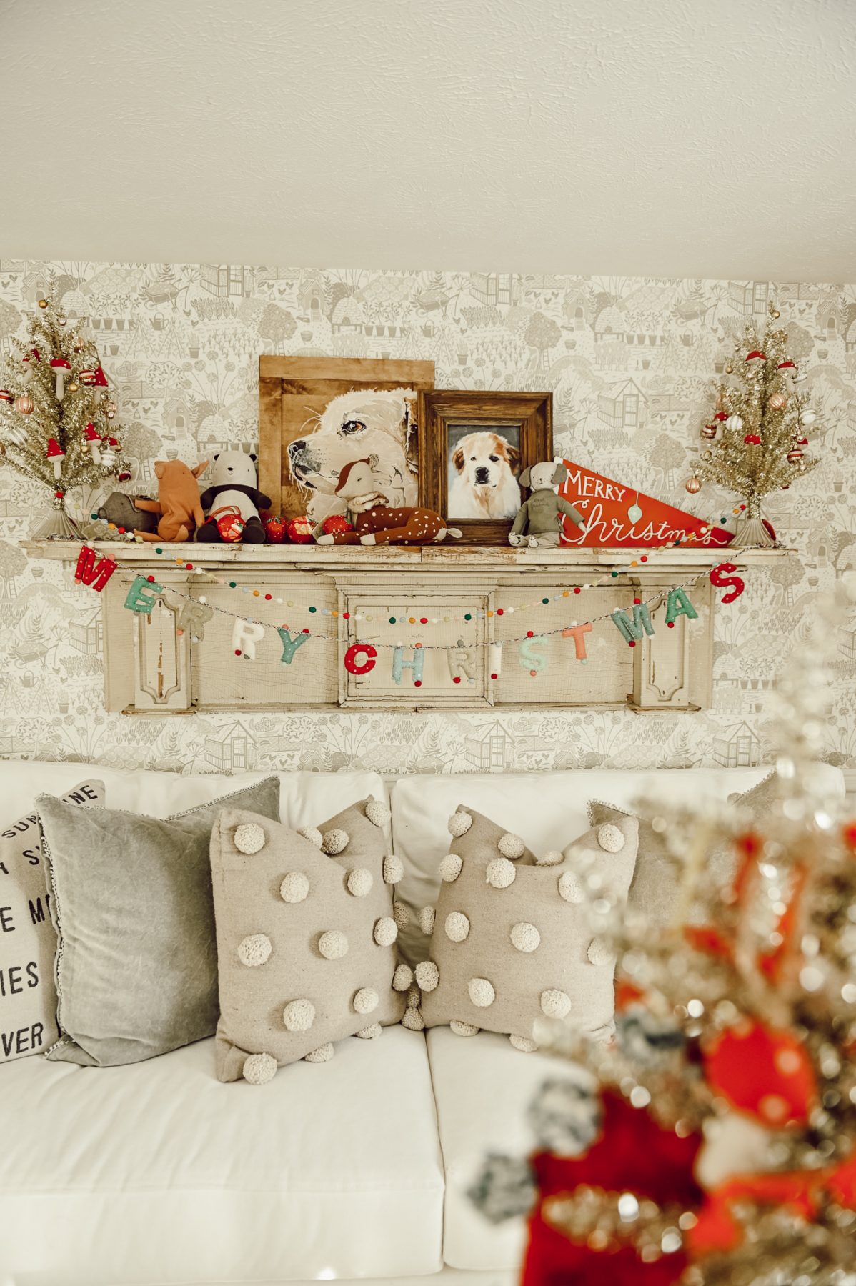 I changed out the piece above the sofa, from an old cubby to this shelf. We have received a few paintings of Winnie over the years, and this was the perfect place to display Cope’s puppy. Each side of the paintings I added a few smaller Christmas elements to carry the festive charm throughout the space.