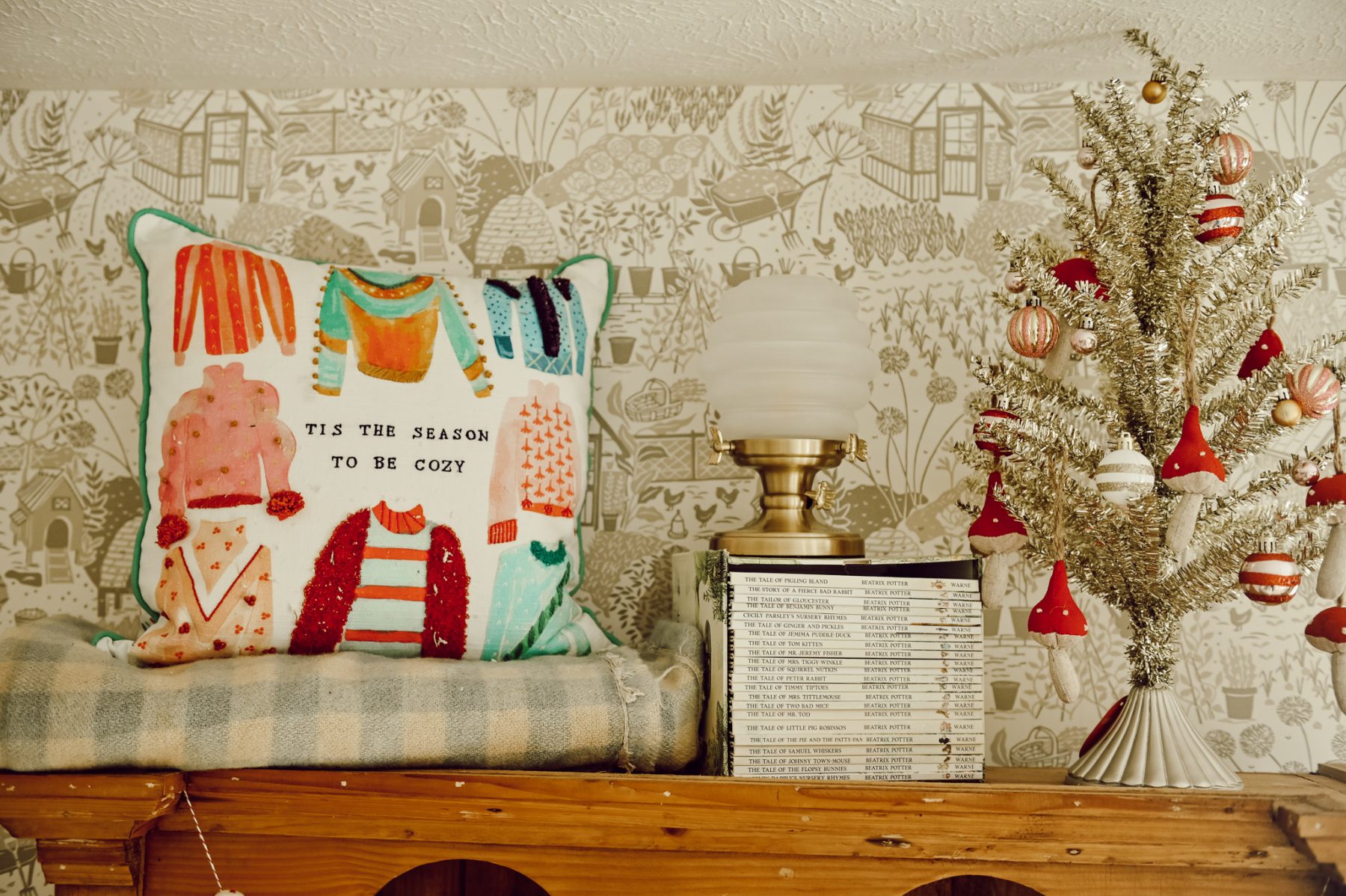 Next this cute pine bookshelf I bought from one of my favorite antique shops in Grand Rapids. This space displays another fun splash of christmas with a small tree and soft felt ornaments, simliar to the tree on the coffee table.