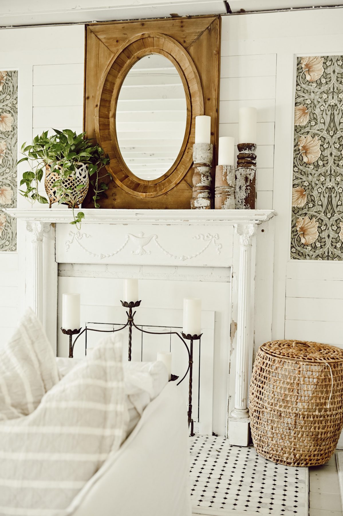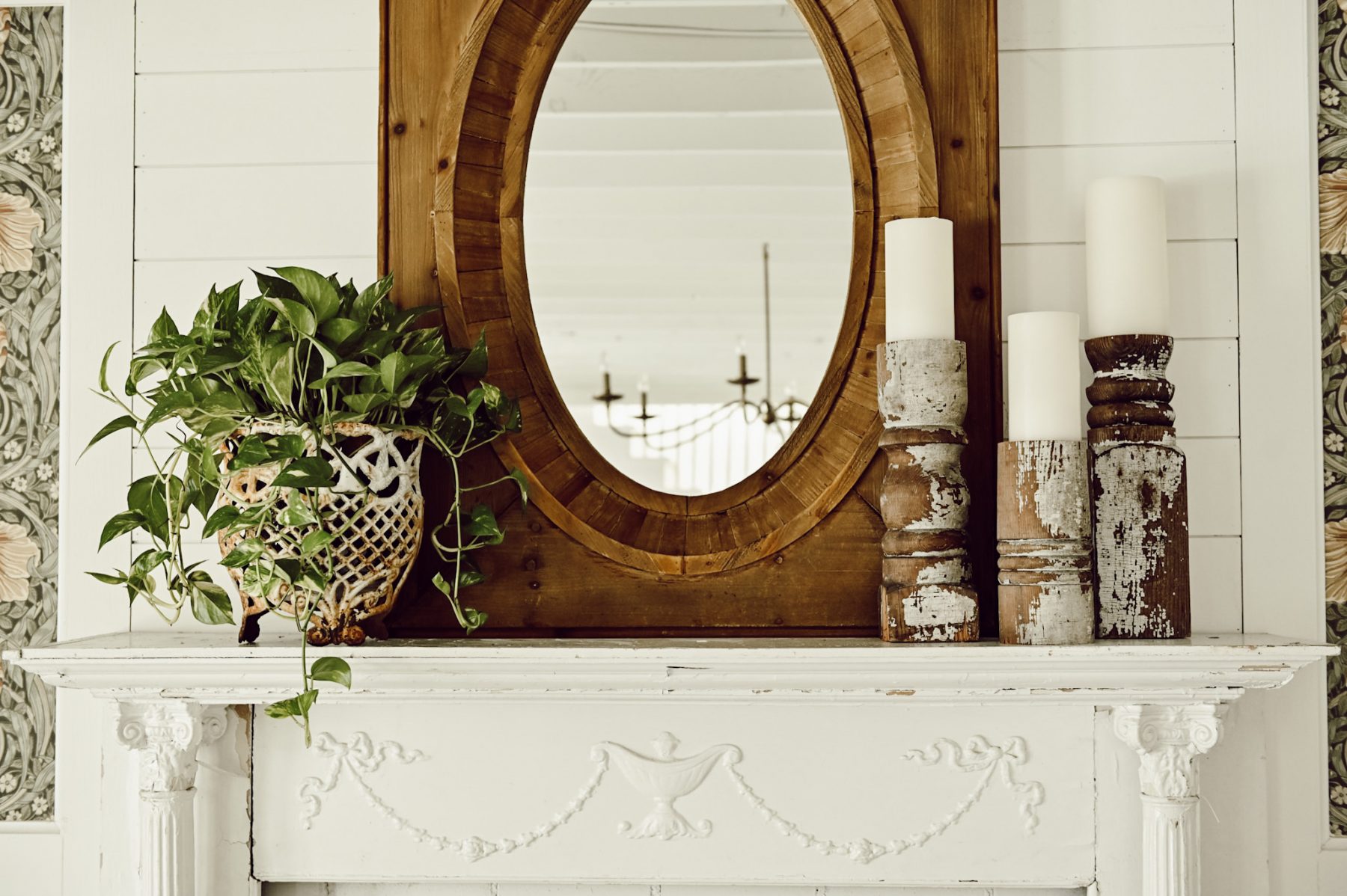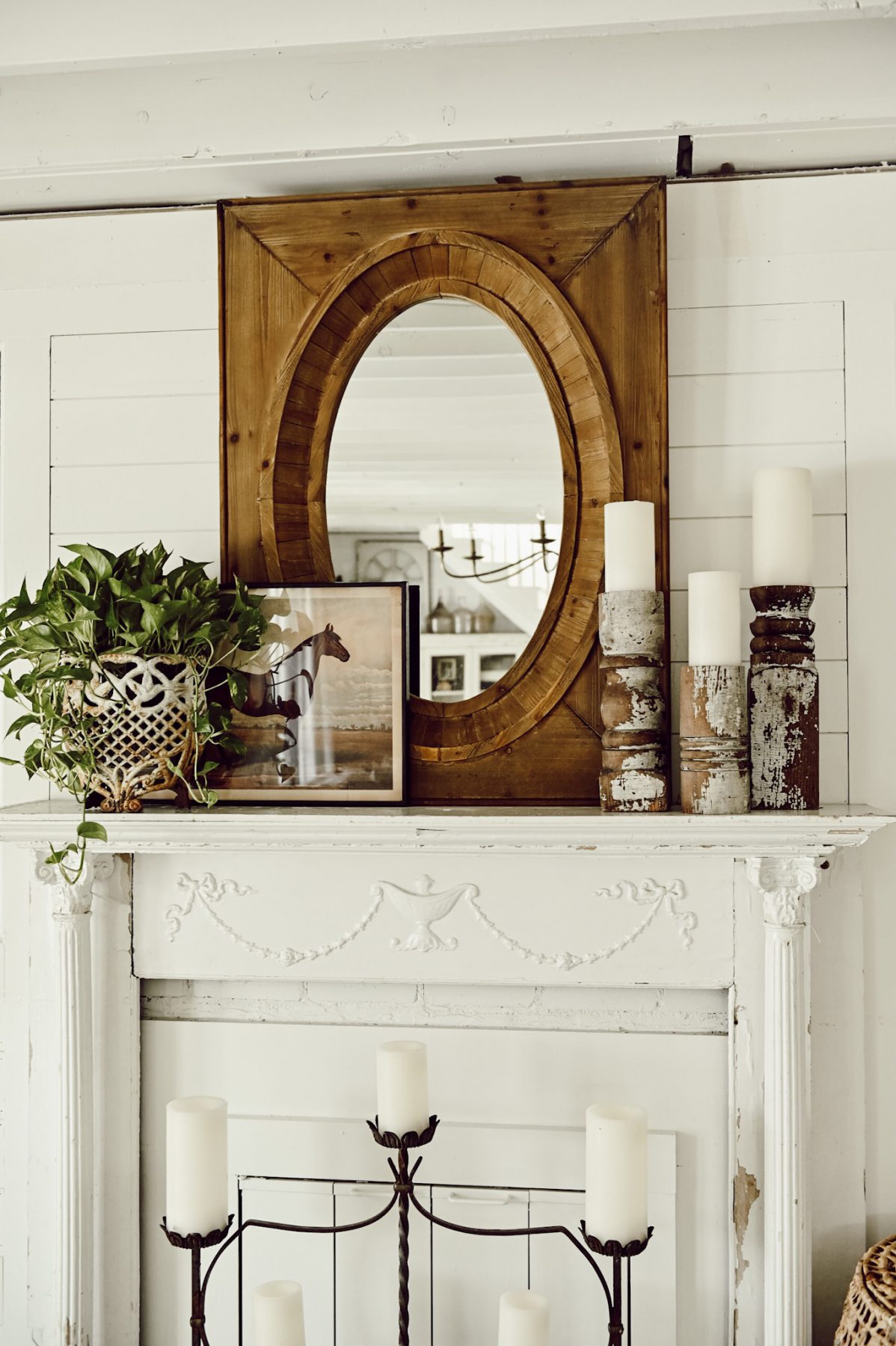 This mantel in our front living room is one of the spaces that is going to be getting a HUGE makeover. Hint: windows, new fireplace, & a whole new look. Before we do that I’m craving a fresh look on this simple mantel of ours. To achieve that look I got back to get basics with a few simple things that I love: My oversized wood mirror that I got at our store, a fresh plant that I picked up at our local greenhouse that I placed in an antique planter, & some chippy old architectural salvage candlesticks. It’s minimal, but oh so cozy because of the texture, wood tones, & the pop of fresh greenery. It needs to be nothing more or nothing less. Mirror + greenery + candles = the perfect mantel styling.