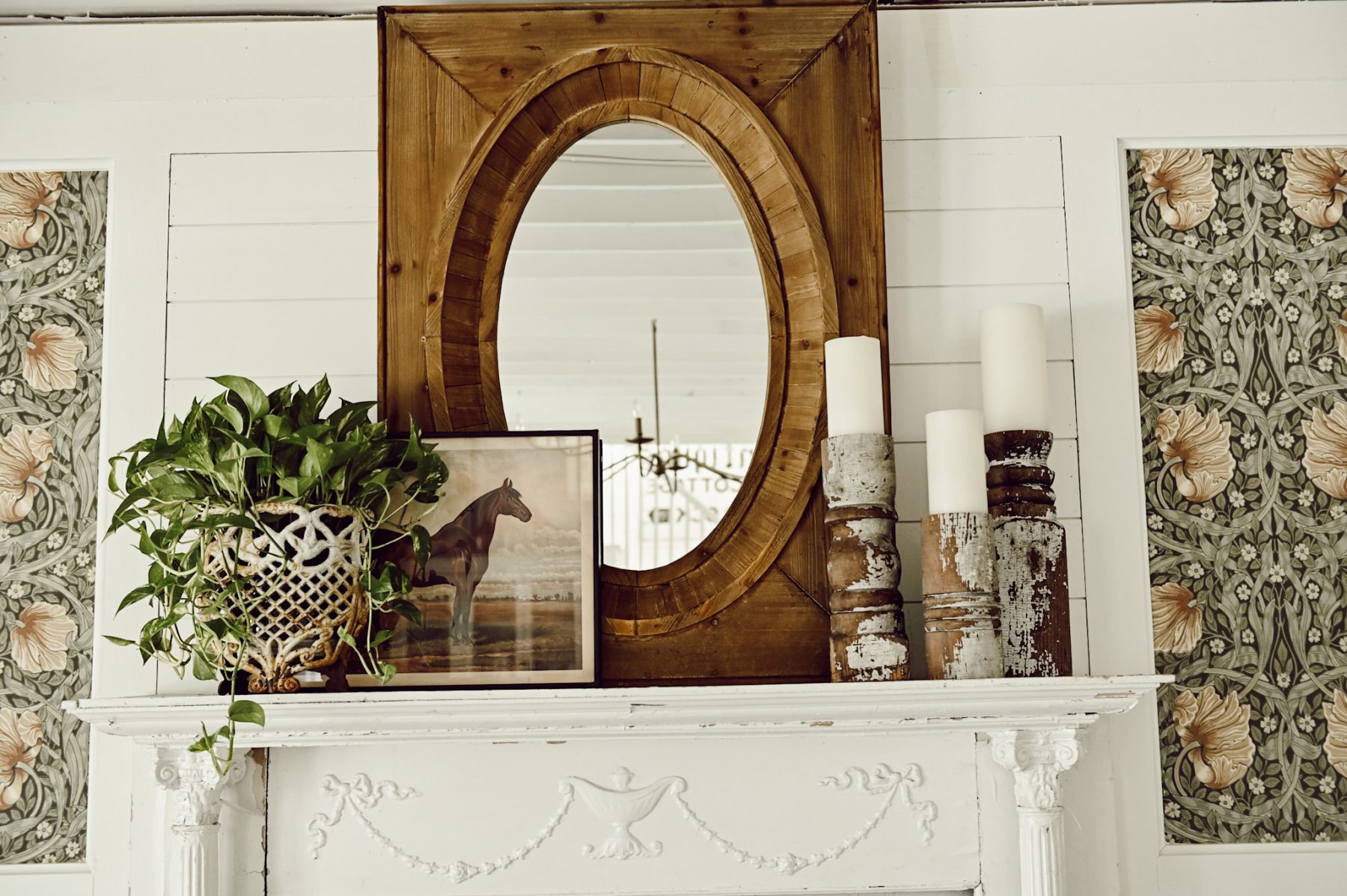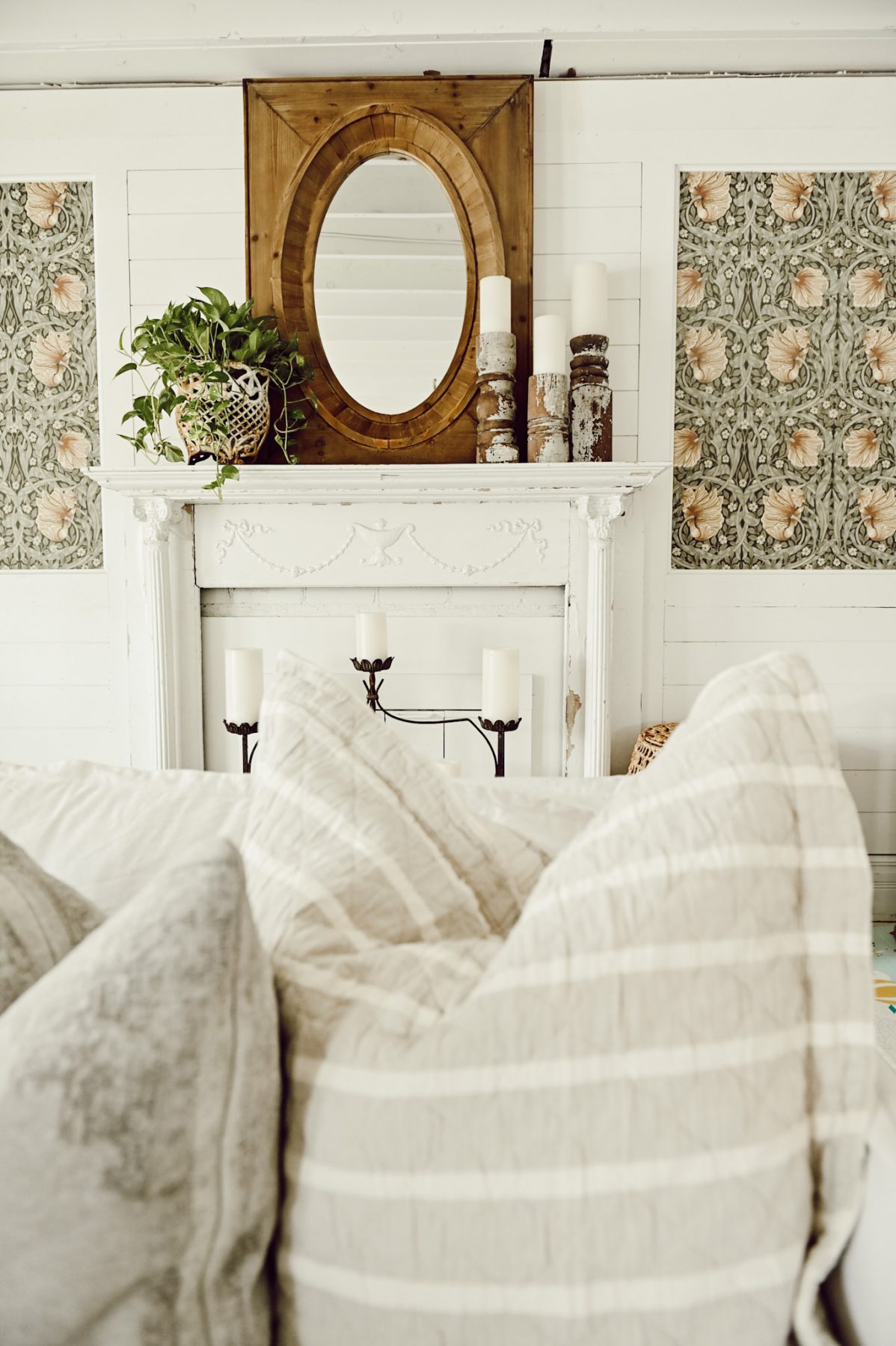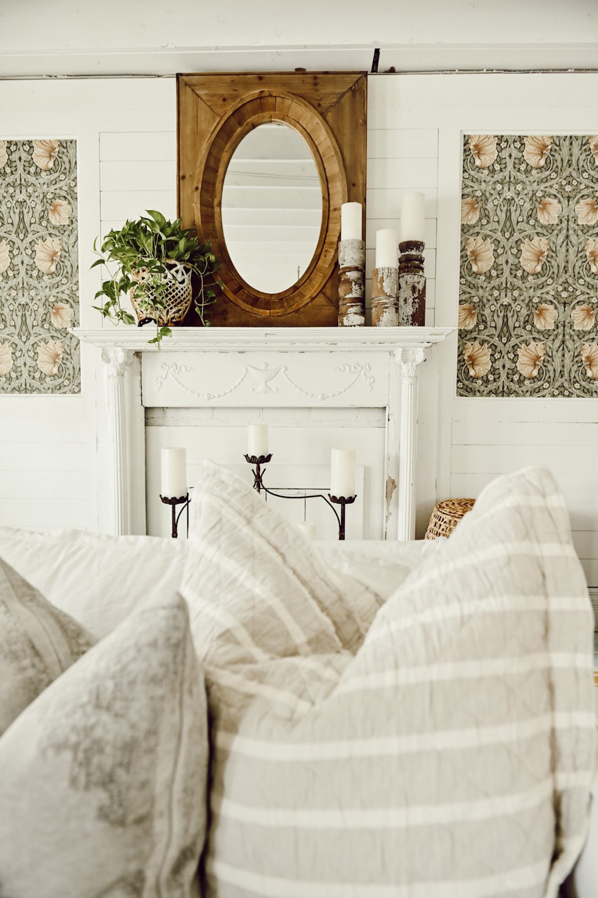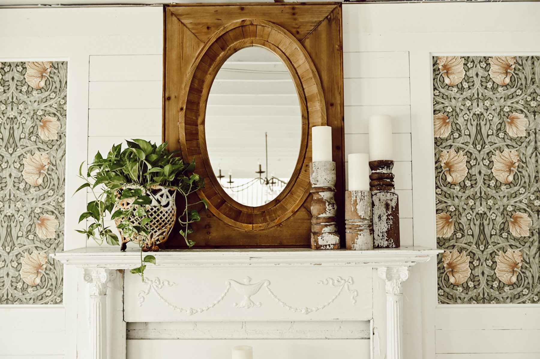 This mantel in our front living room is one of the spaces that is going to be getting a HUGE makeover. Hint: windows, new fireplace, & a whole new look. Before we do that I’m craving a fresh look on this simple mantel of ours. To achieve that look I got back to get basics with a few simple things that I love: My oversized wood mirror that I got at our store, a fresh plant that I picked up at our local greenhouse that I placed in an antique planter, & some chippy old architectural salvage candlesticks. It’s minimal, but oh so cozy because of the texture, wood tones, & the pop of fresh greenery. It needs to be nothing more or nothing less. Mirror + greenery + candles = the perfect mantel styling.
