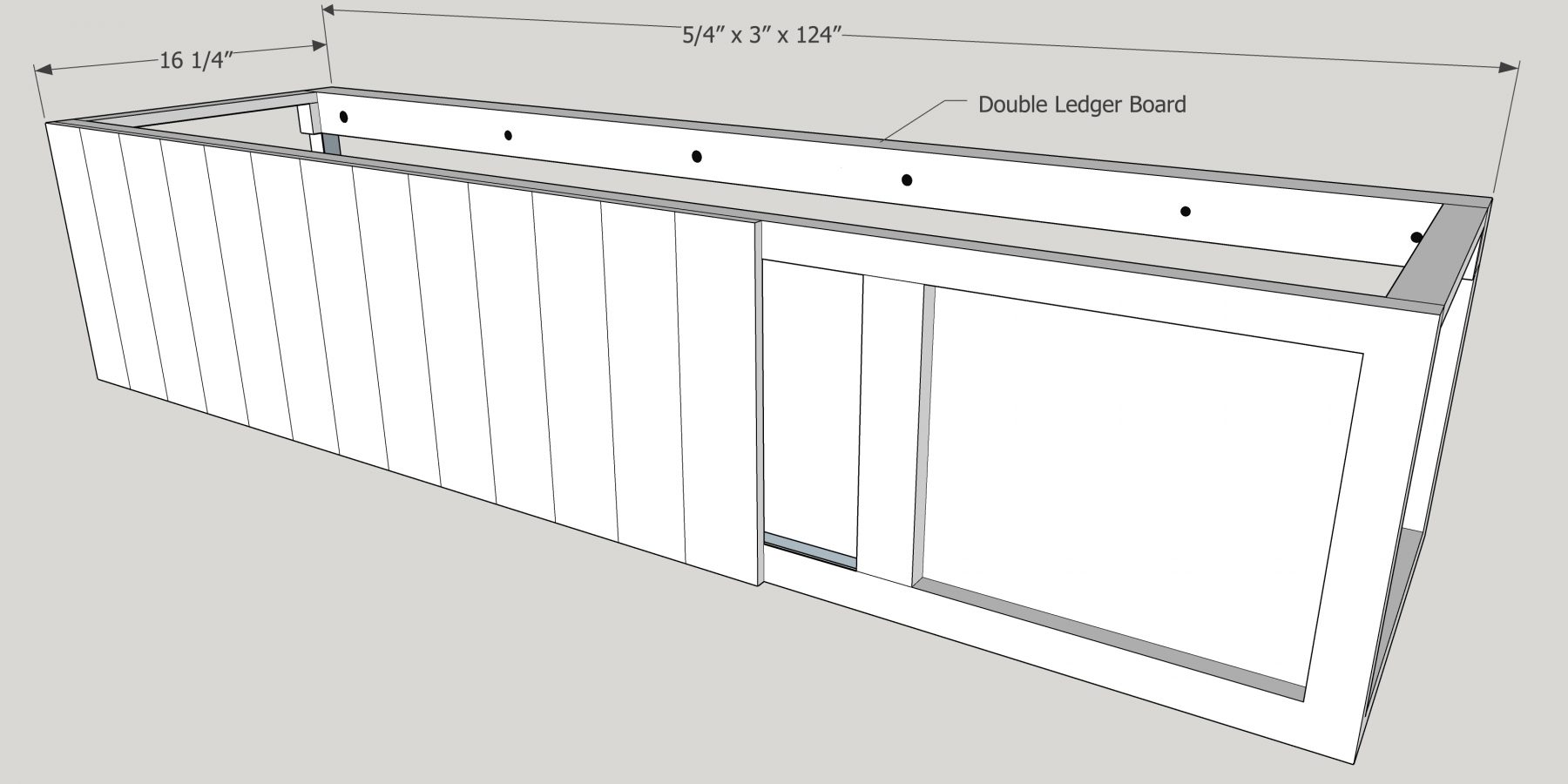 Step 1. Install the double ledger board level across the wall. I used a double ledger board style because we wanted a strong base to drill too as well provide a platform for the back hinge board.