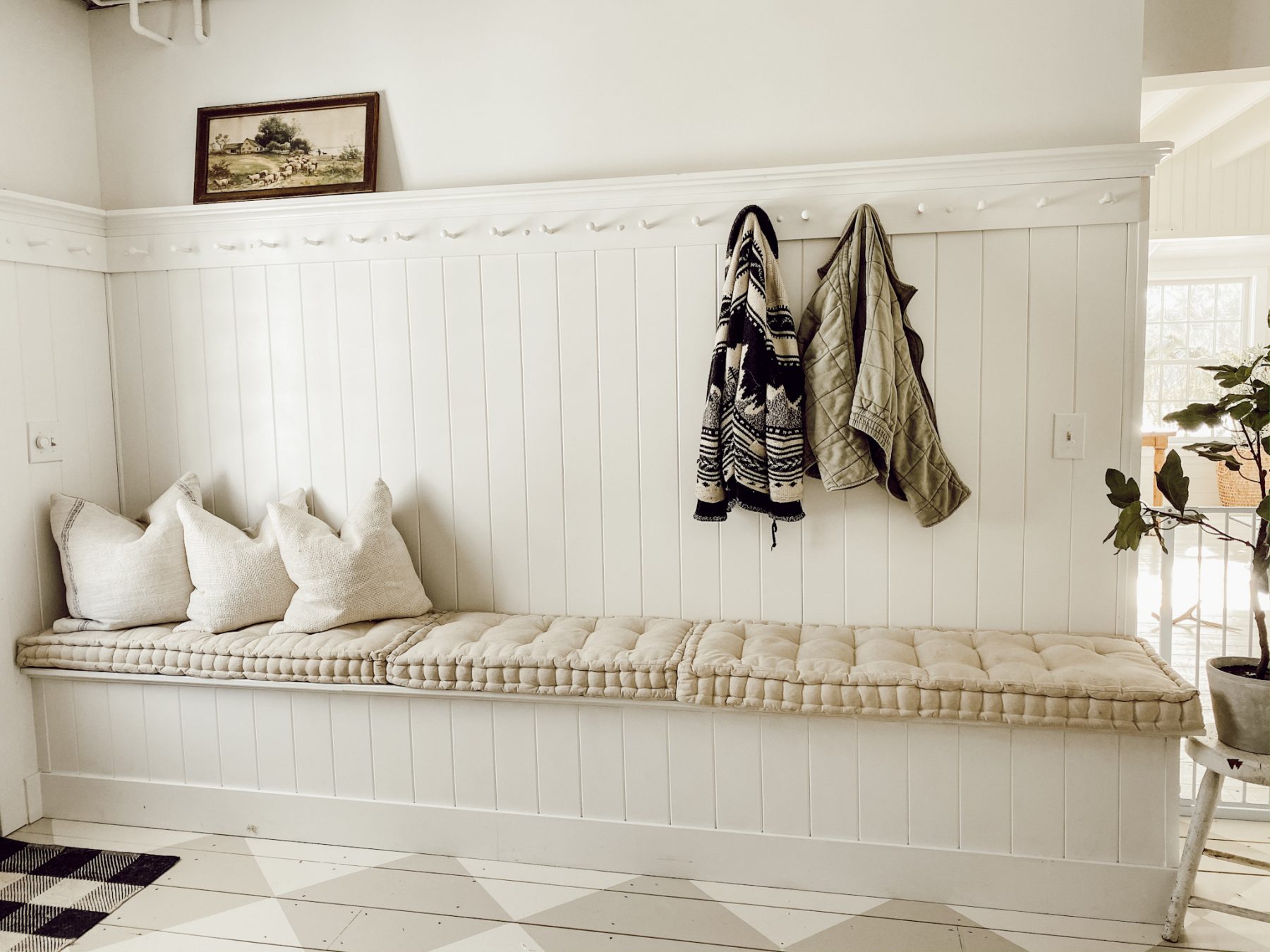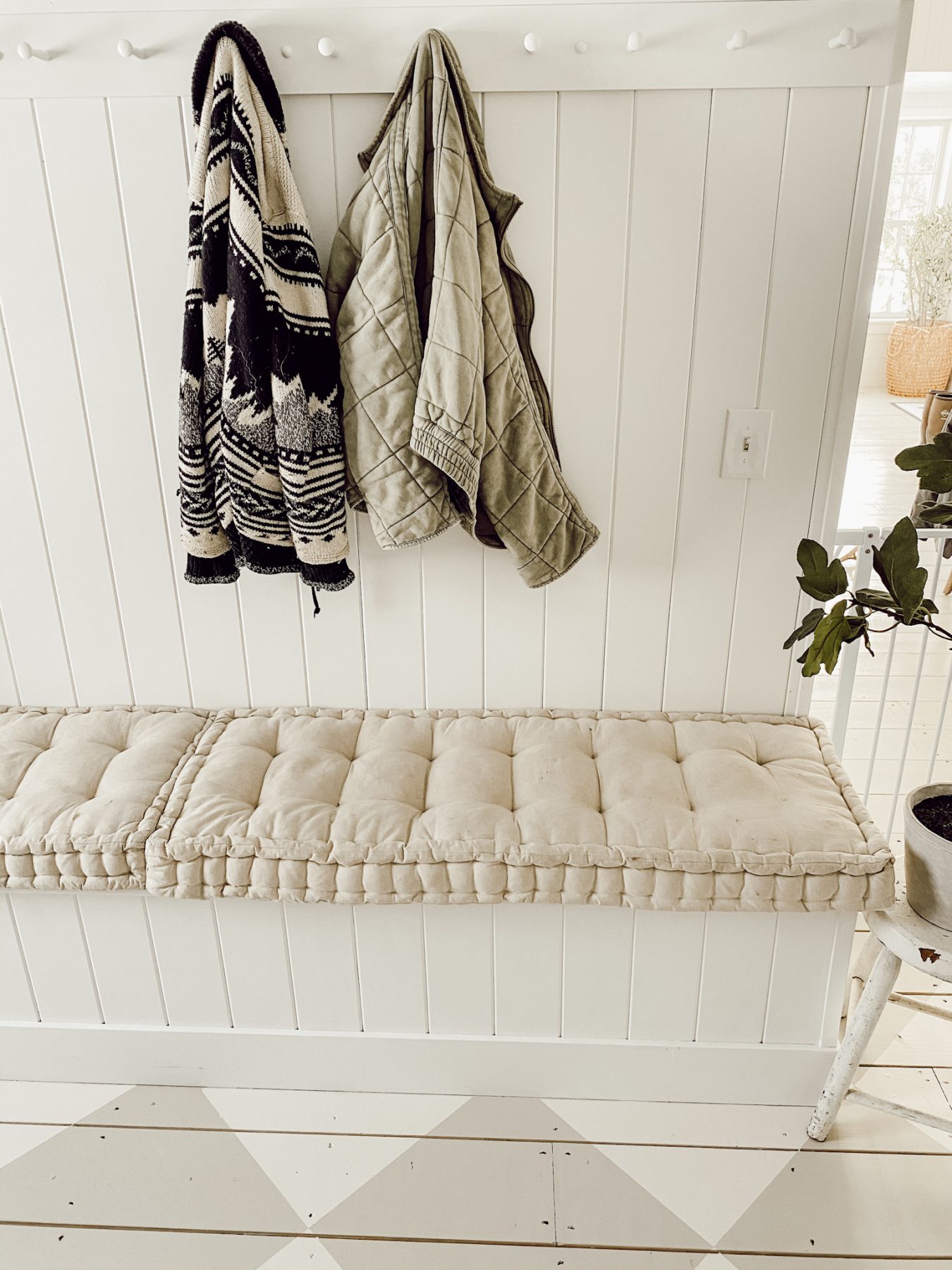 I love the cushions on the bench! Where did you find them? My hubs is currently working on a bench thing for our kids school stuff, backpacks, shoes etc.