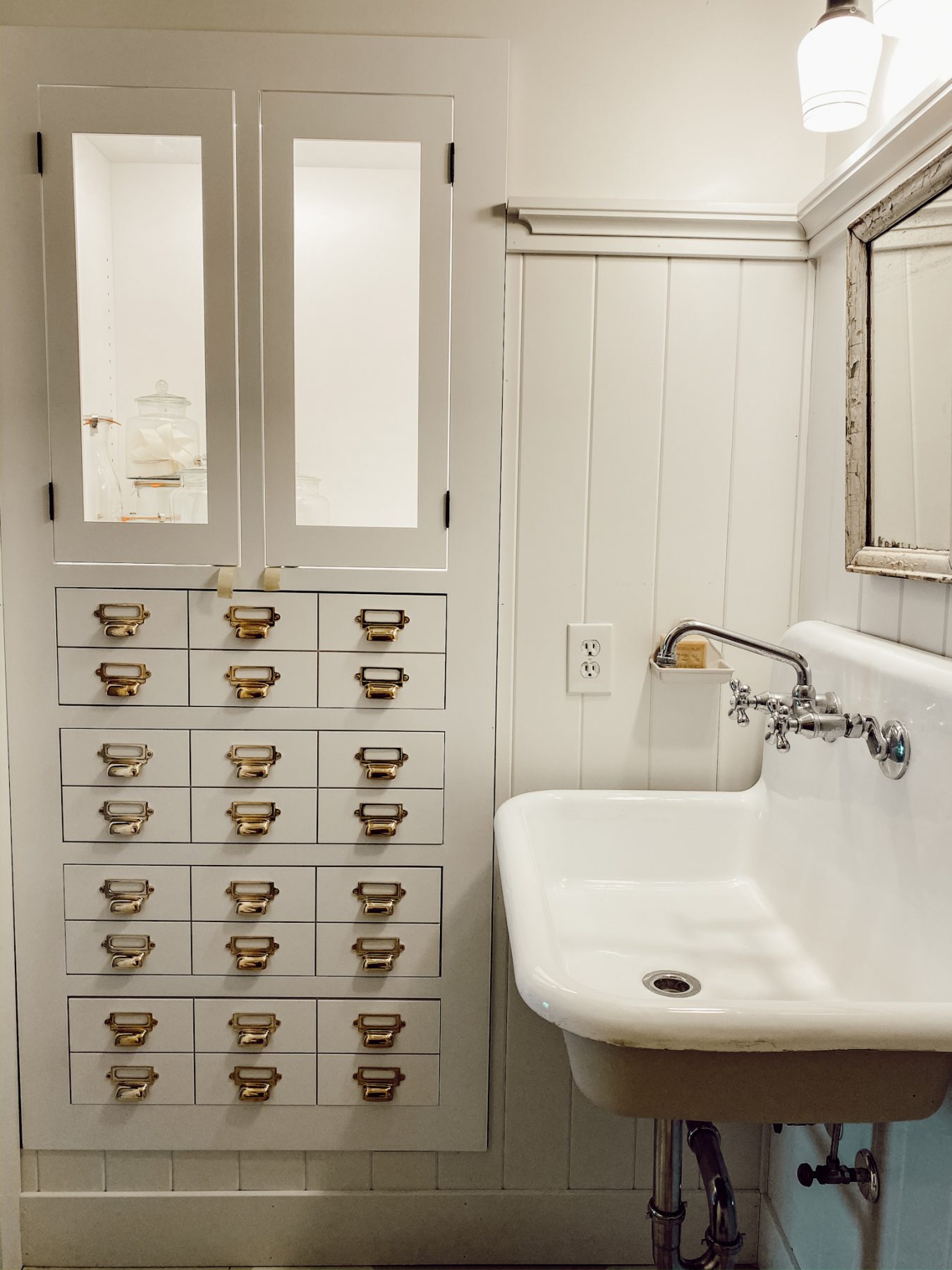 I wanted to start with the guest bathroom because I want everyone to always feel welcome at our home & not having a nice cozy bathroom isn’t very welcoming! This bathroom used to be super small, there really wasn’t much space between the sink and the toilet. We expanded the guest bathroom by 4 feet recently, replaced the floors [they were the old brick seen here], & included some extra storage space! The bathroom is now able to hold a cabinet, built-in storage, and we finally added some space between the sink & the toilet so you don’t bump it while doing your business. We added the same wall treatment and painted floors that we did in the mudroom which ties in nicely since they are connected. This was all recently done by our contractor while we have been in an out of town. When life is busy we decide to ask for help & I’m so thankful we did. We still have a long way to go in this room, but progress is looking pretty good!