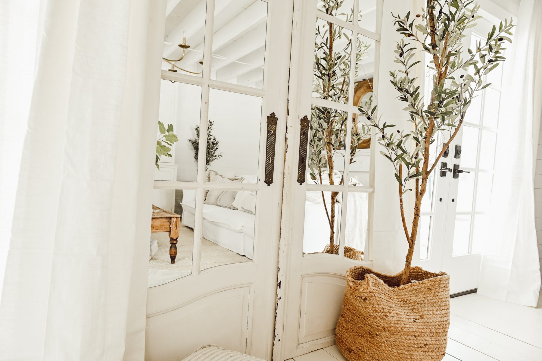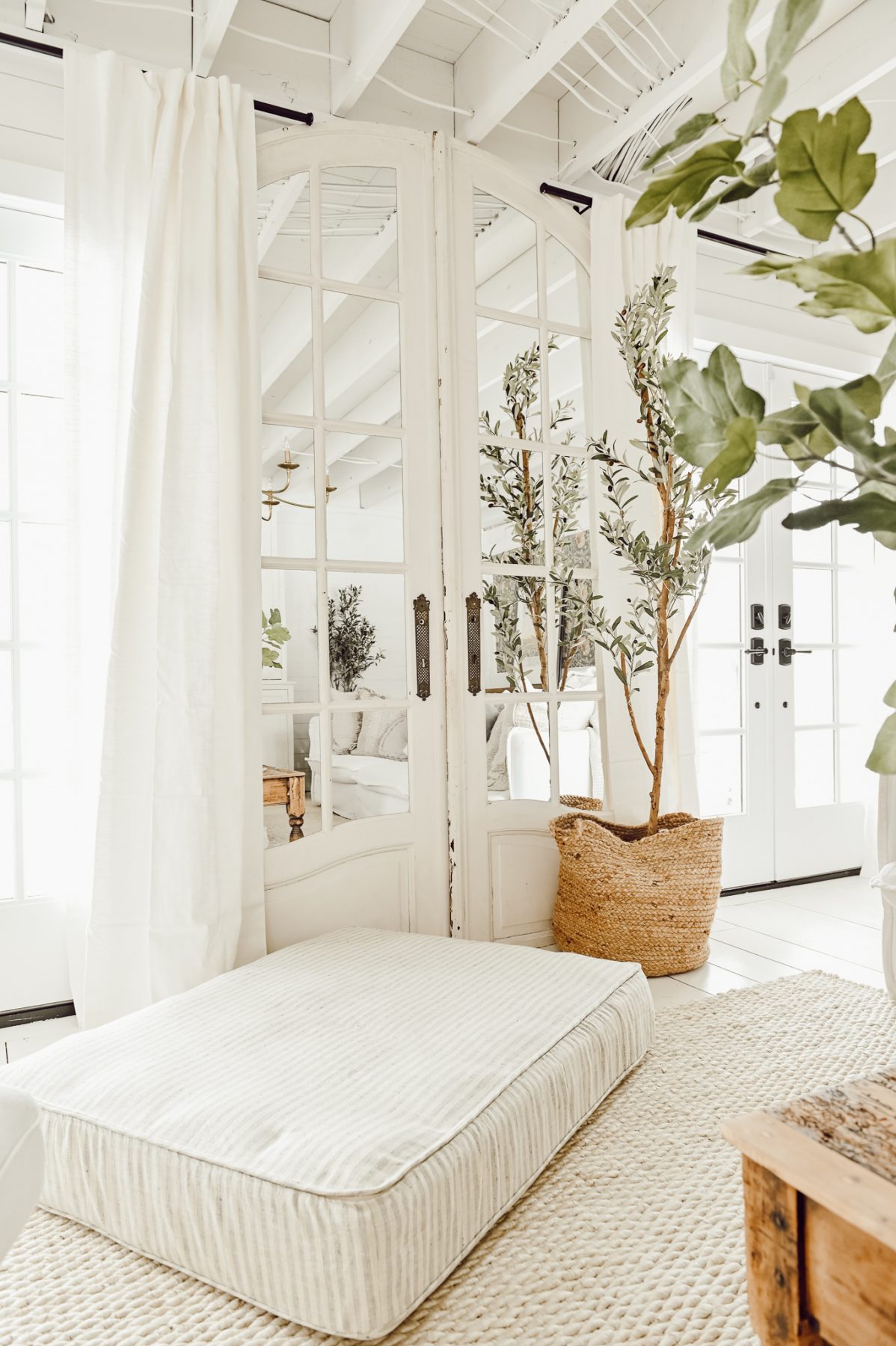 I love the idea of using architectural salvage for a different purpose, which is why we decided to just use these doors as mirrors. They truly brighten up the entire room by reflecting all the natural light in the day and the lamp light at night. I love using mirrors in rooms that are a little bit darker or smaller because it helps enhance the entire room by reflecting all the light and making the space look bigger. Soon we’ll have even more windows in our living room (future project coming soon) and these mirrored doors will help to make the space feel even brighter after that!