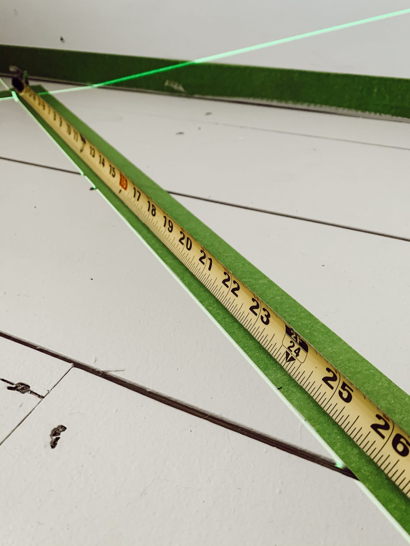 We used a tape measure to spot check to make sure our measurements stayed consistent through out the entire process. With the laser on and a line projected on the floor, we would place painters tape along side the line. Once we had one direction, we changed sides and did the opposite side of the diamond or harlequin. Repeat these steps down through the room until you have all of your diamonds placed on the floor.
