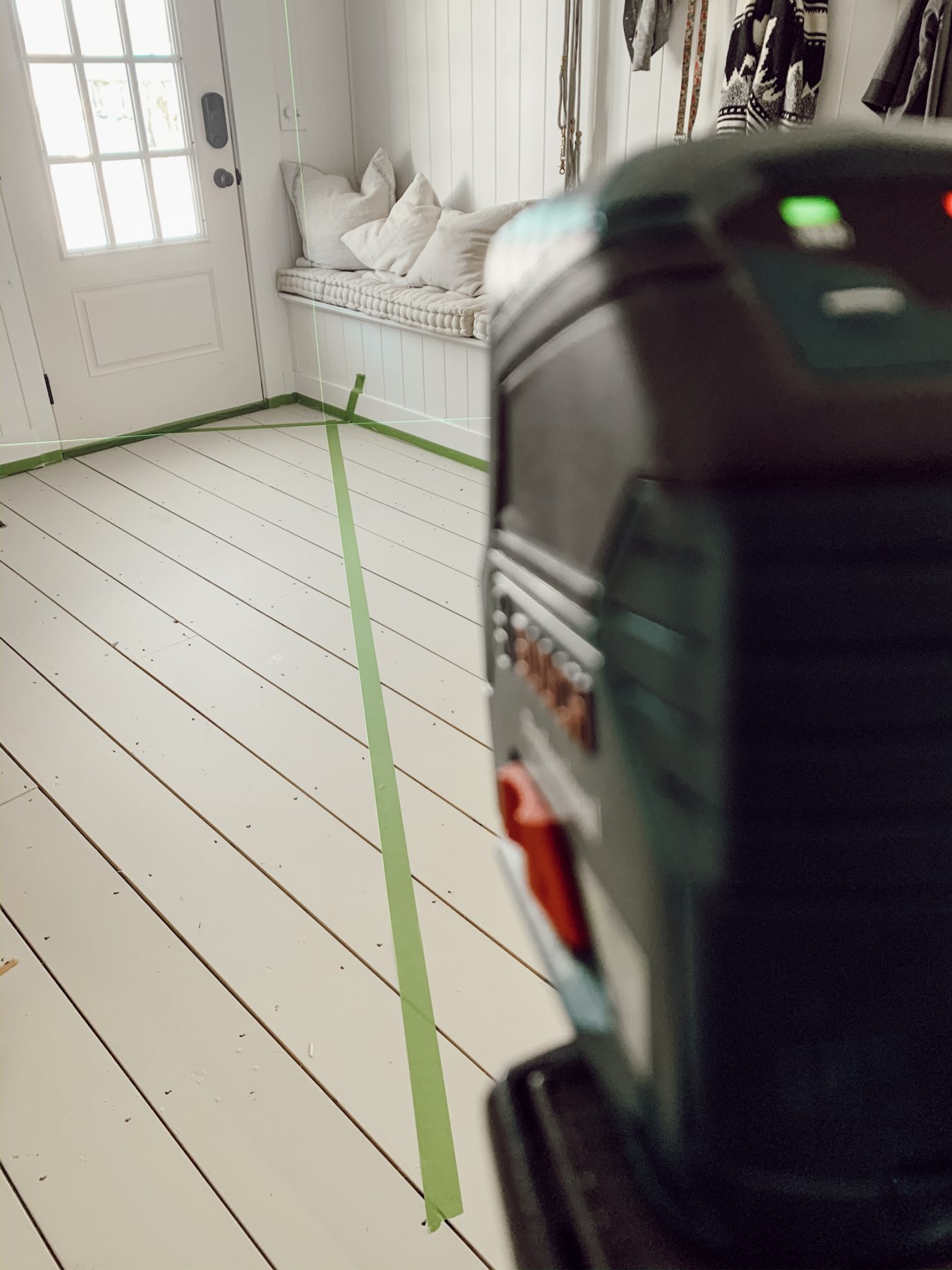 Obviously every room size, and square preference will be different, but taping with the laser was super accurate and the biggest time spent was on the taping and the prep work. But again, you could make a stencil out of cardboard or another stiff material and it could go a lot quicker. There are so many different methods to do this floor, but this was ours.