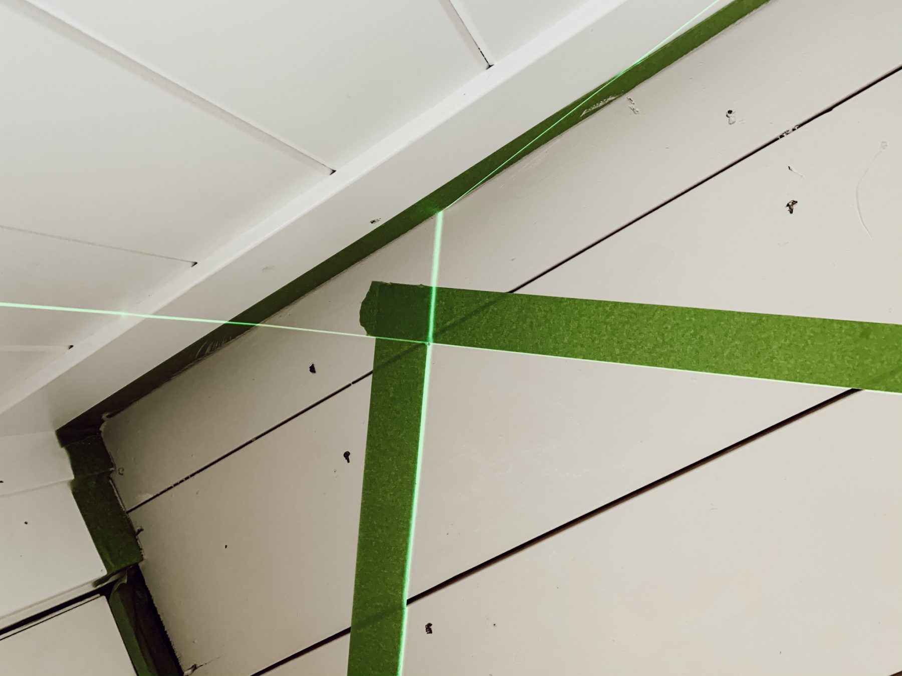 Before I talk about the process of getting these squares on the floor, if I were to do it again, I would build a template to make the process go a lot faster. We ended up tapping the squares, and once you got in the groove of it, it did not go too bad. Taping ensured that the lines were crisp and we were able to lay out the squares by using a laser level and other tools we listed below: