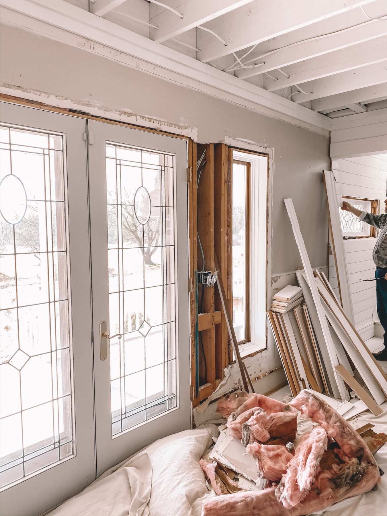 We never used these French doors & they were so drafty that sitting in this space was always cold and not so cozy. We knew we wanted more light so we decided on three windows [we purchased ours from Andersen windows like the rest of our house as we replace them.] We chose the same panes as we did in the sunroom since this room is right next to that room the windows continue on from the sunroom which also looks beautiful from the outside. I’ll share more on this later as we work on this space, but you can already see a difference in this space so I really wanted to share!