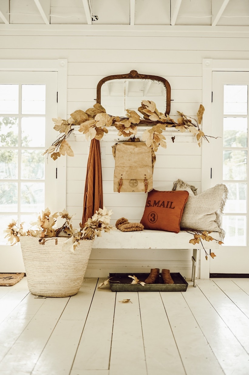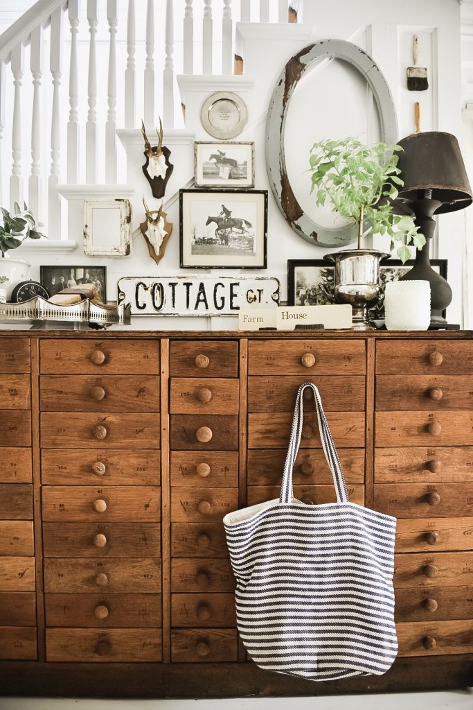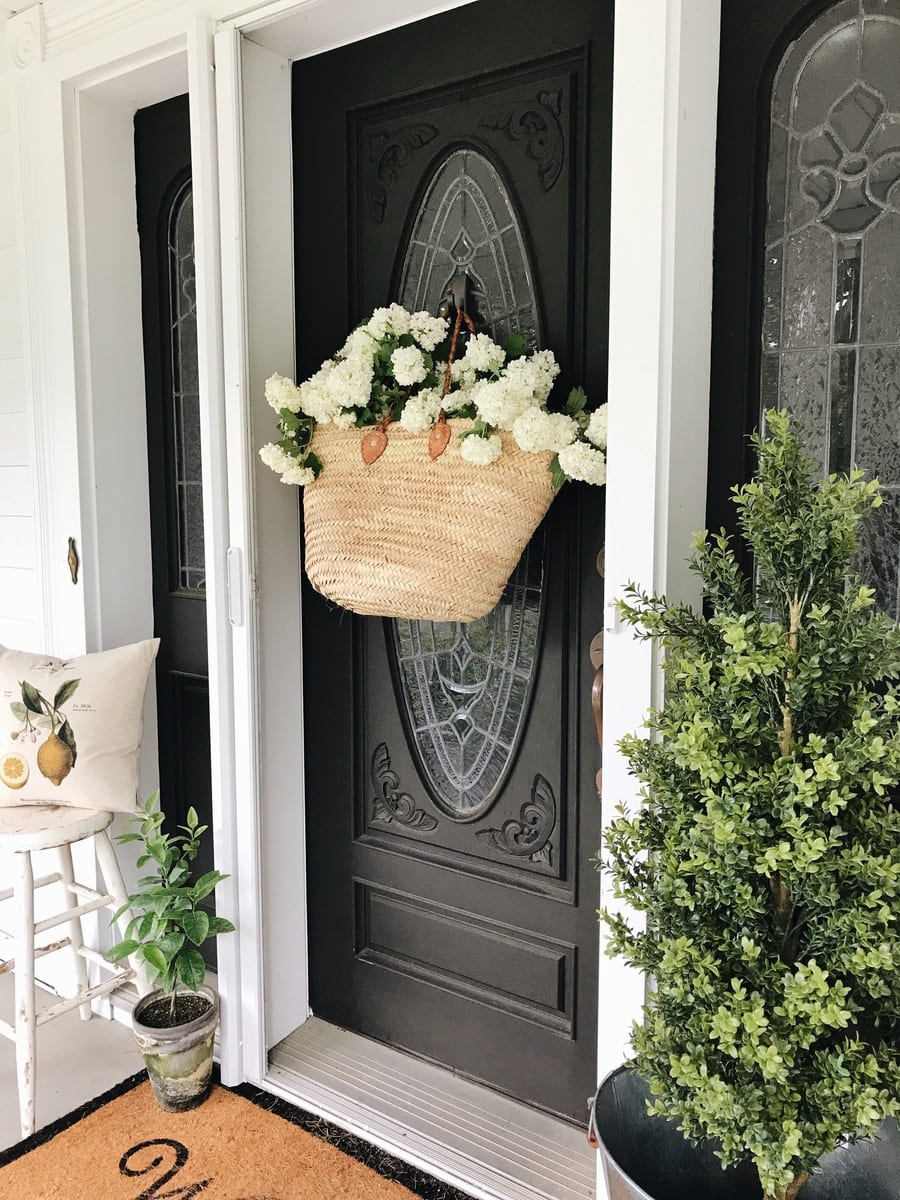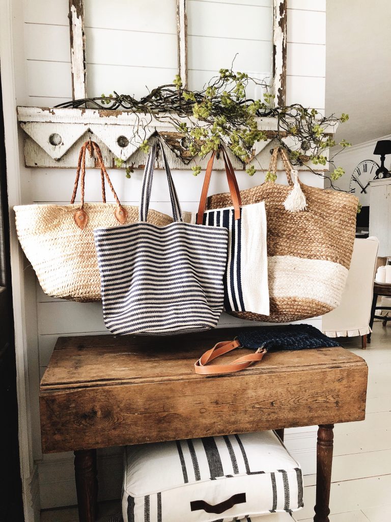 We have used market bags in all areas of our home, high and low. We’ve hung them on the door to make a market bag wreath, under an entryway table filled with blankets, on a coffee table filled with seasonal flowers and stems.