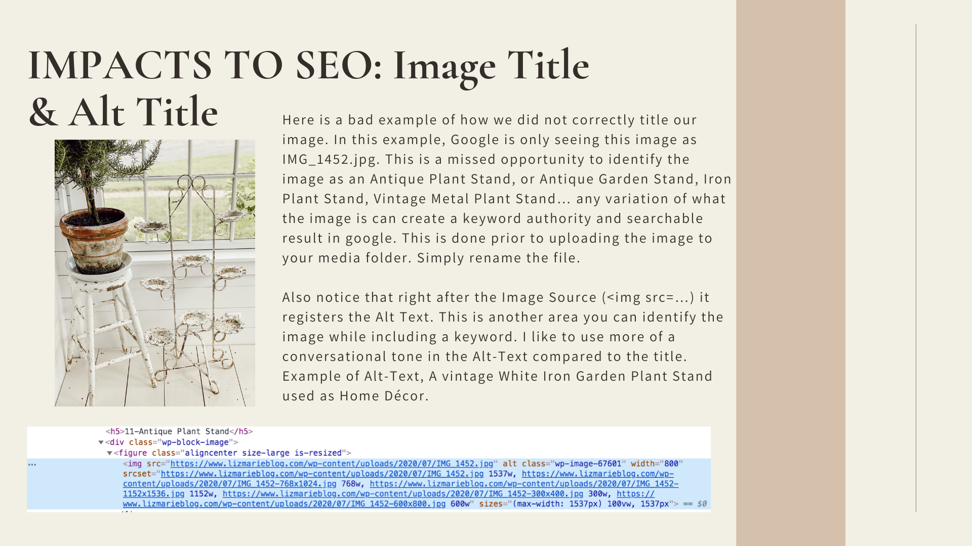 Also notice that right after the Image Source (<img src=…) it registers the Alt Text. This is another area you can identify the image while including a keyword. I like to use more of a conversational tone in the Alt-Text compared to the title. Example of Alt-Text, A vintage White Iron Garden Plant Stand used as Home Décor.