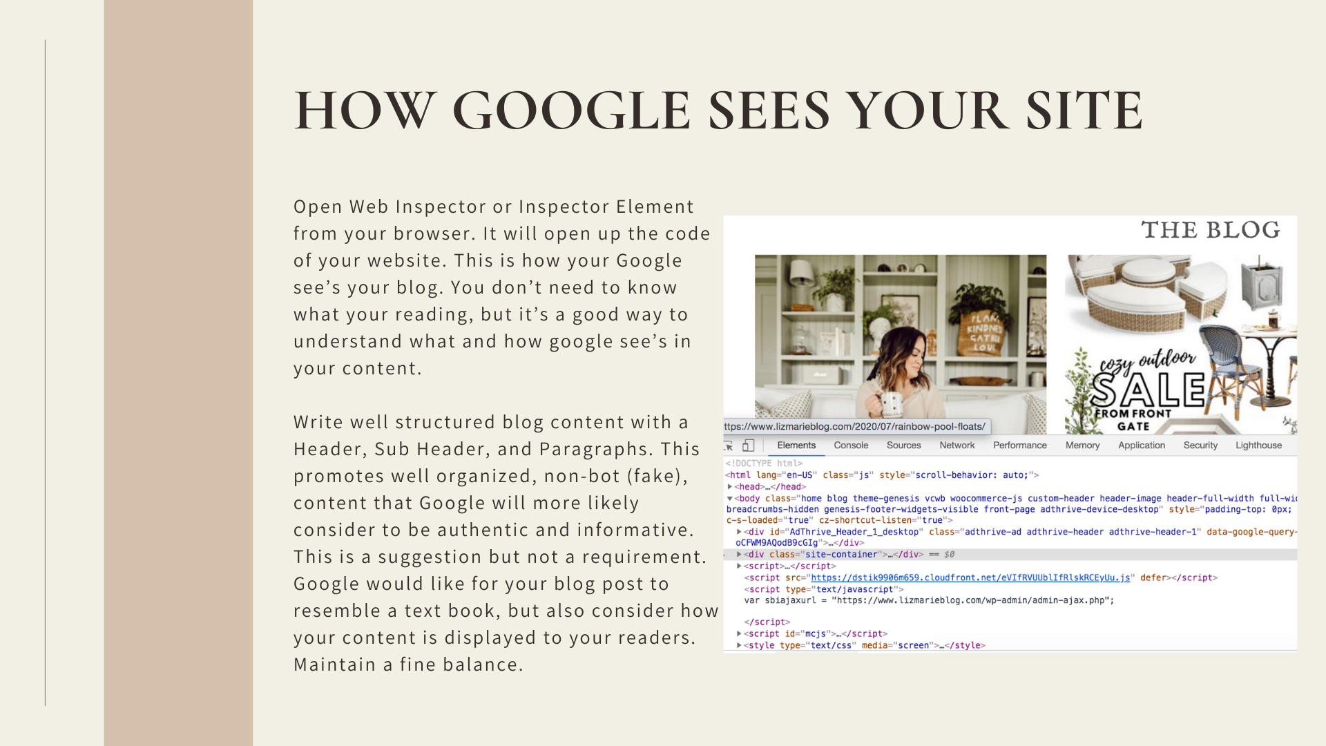 Open Web Inspector or Inspector Element from your browser. It will open up the code of your website. This is how Google sees your blog. You don’t need to know what your reading, but it’s a good way to understand what and how google sees in your content.