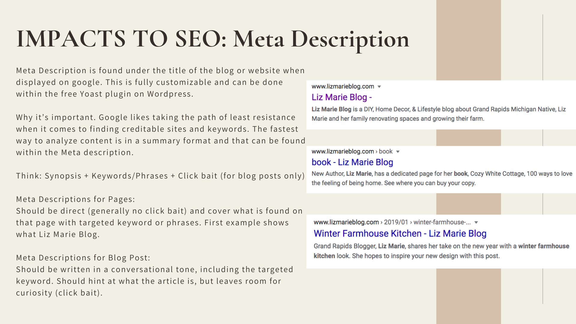 Meta Description is found under the title of the blog or website when displayed on google. This is fully customizable and can be done within the free Yoast plugin on WordPress.