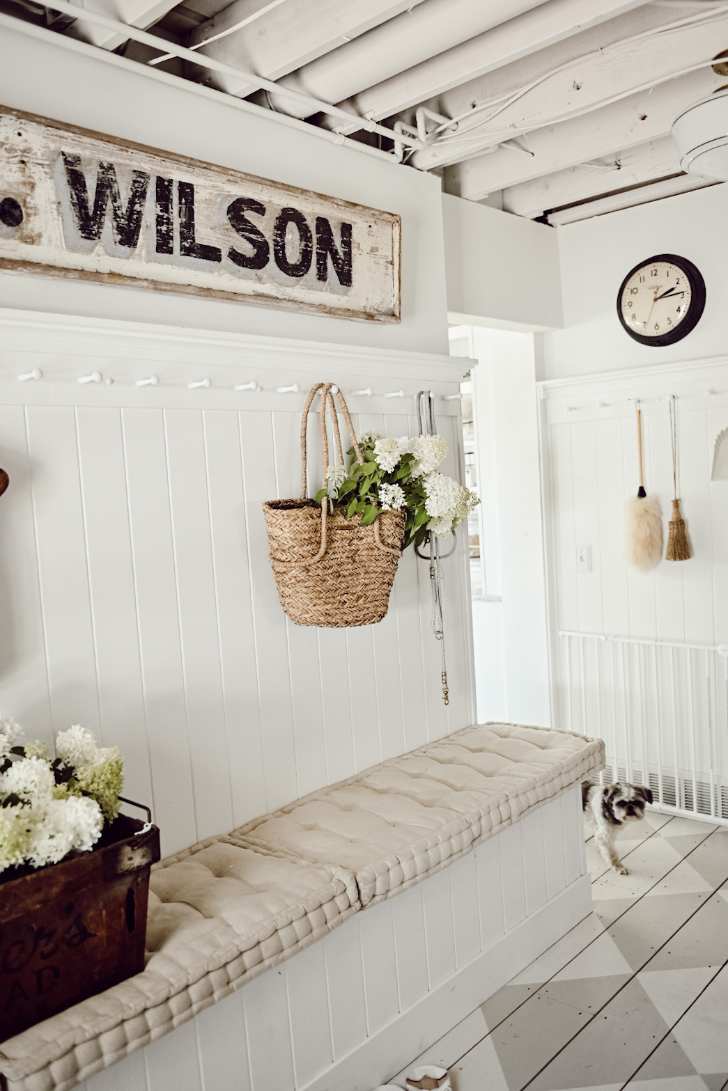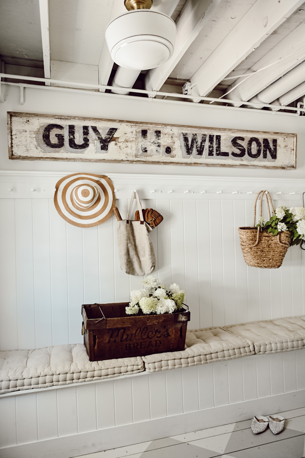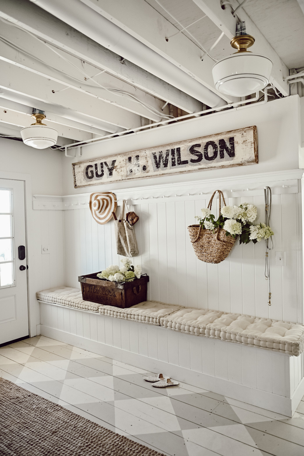 This is our mudroom and I’ve been meaning to hang this antique sign up for forever now. Today I finally wanted to refresh the space, so I had Jose help me hang it up. I found the sign while out antiquing a couple years ago out of state and it’s so long that it needed the perfect wall to go on and this wall in our mudroom was the perfect size for it because I didn’t need to put anything else on the wall beside this long sign.