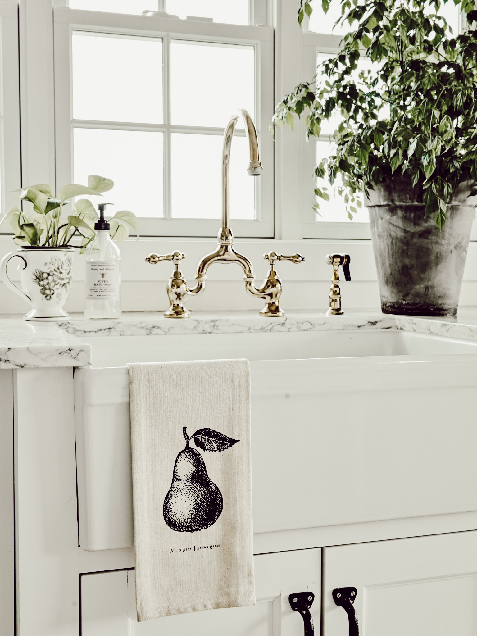 Also just had to throw this in here real quick … My collection with PCB Home has black & white and colored pear items in it. The pears are vintage-inspired botanical sketches that would be the perfect transition from summer to fall. You can shop the collection for tea towels, napkins, placemats, pillows, aprons, tote bags, and more here!