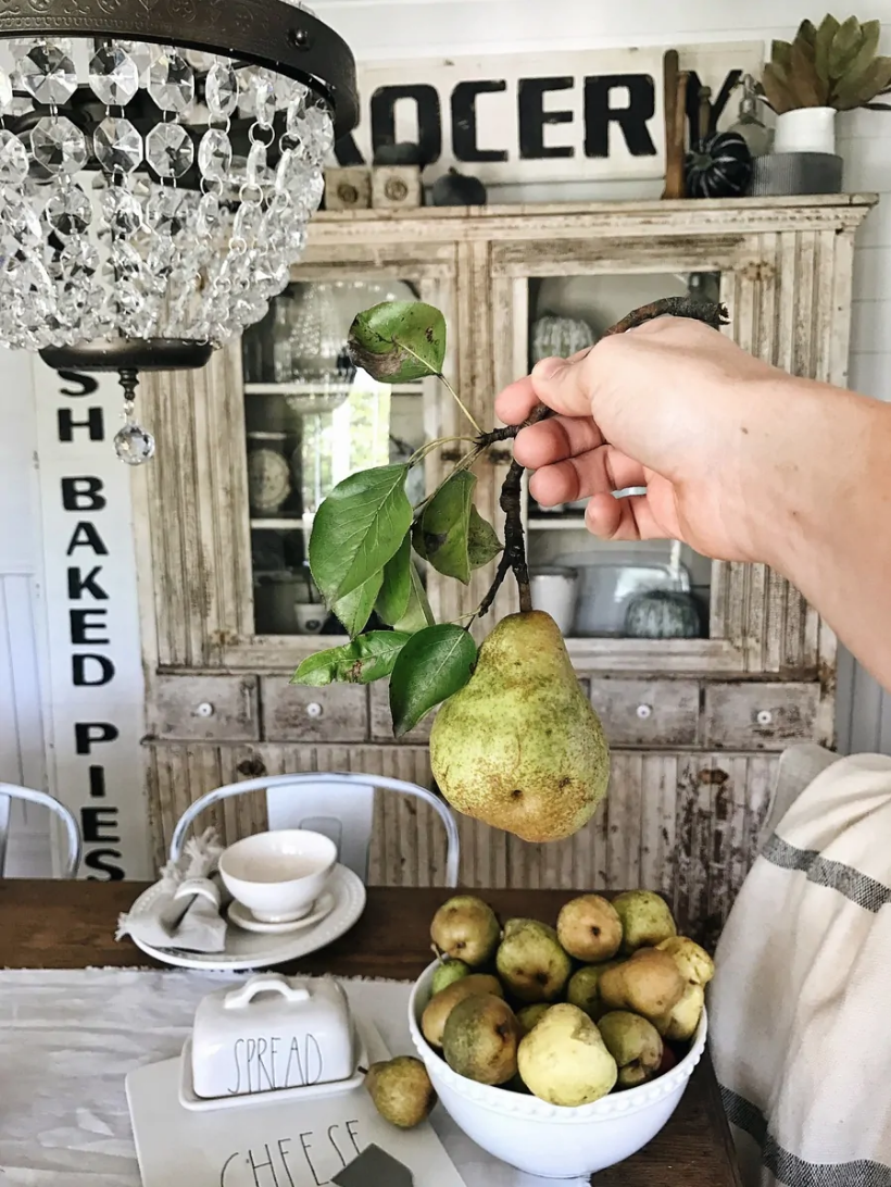 We have a pear tree on the farm! So I love to pick our pears and leave them out in a bowl on the dining table or island. They make the perfect simple dining room decor!