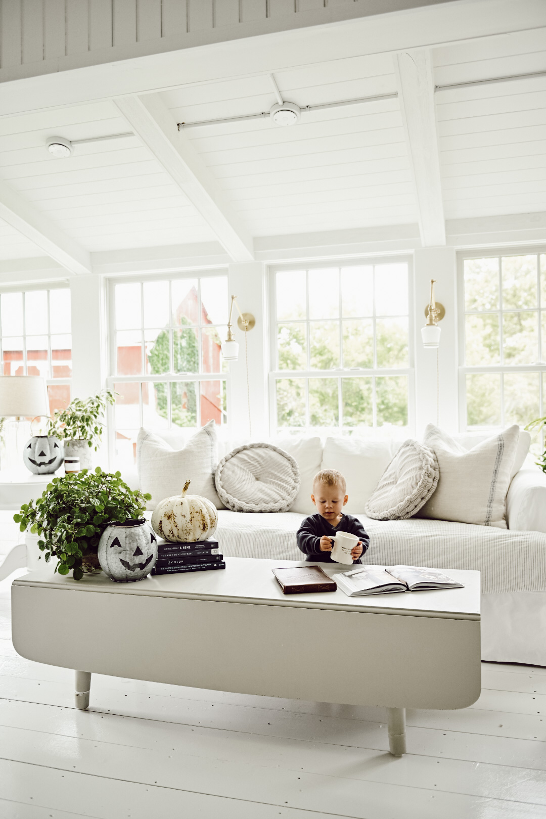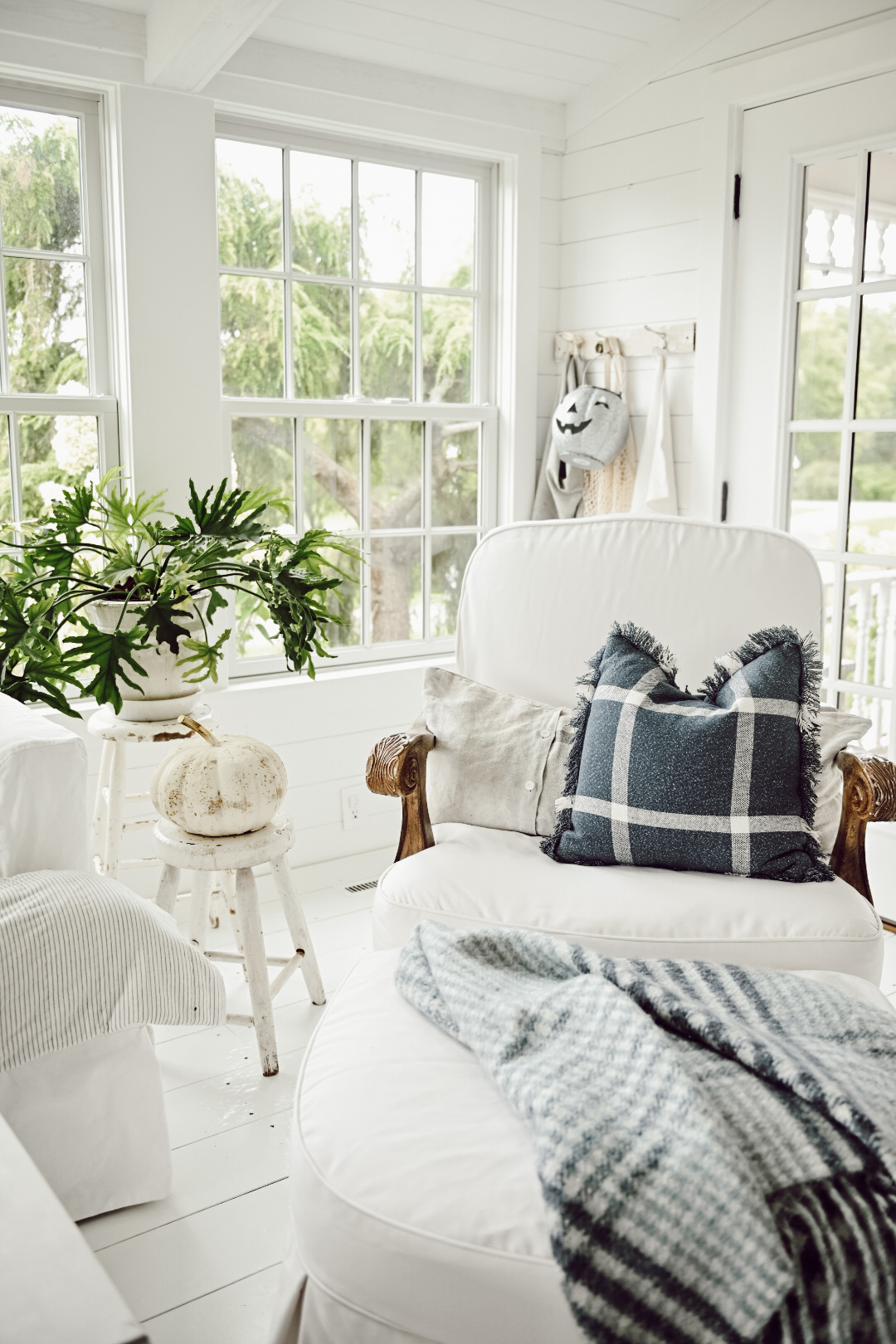 Last week on Instagram I shared that we put a sofa back into our sunroom. It was a switch inspired by Cope & his new found love for snuggling & morning cartoons. This room is far from “done” but we have taken some of our scattered furniture around the house and placed it into this space for now. Today as I was adding some fall into the space I decided to show you a quick few looks using blue tones and a few pumpkins as well. I styled this space a few different ways as you look through the photos by moving some things around and adding/taking away items. I hope that this look inspires you & shows you that you don’t need to go out & purchase a ton of season specific items. You can make it fall by adding textures & a simple real pumpkin and call it a day…