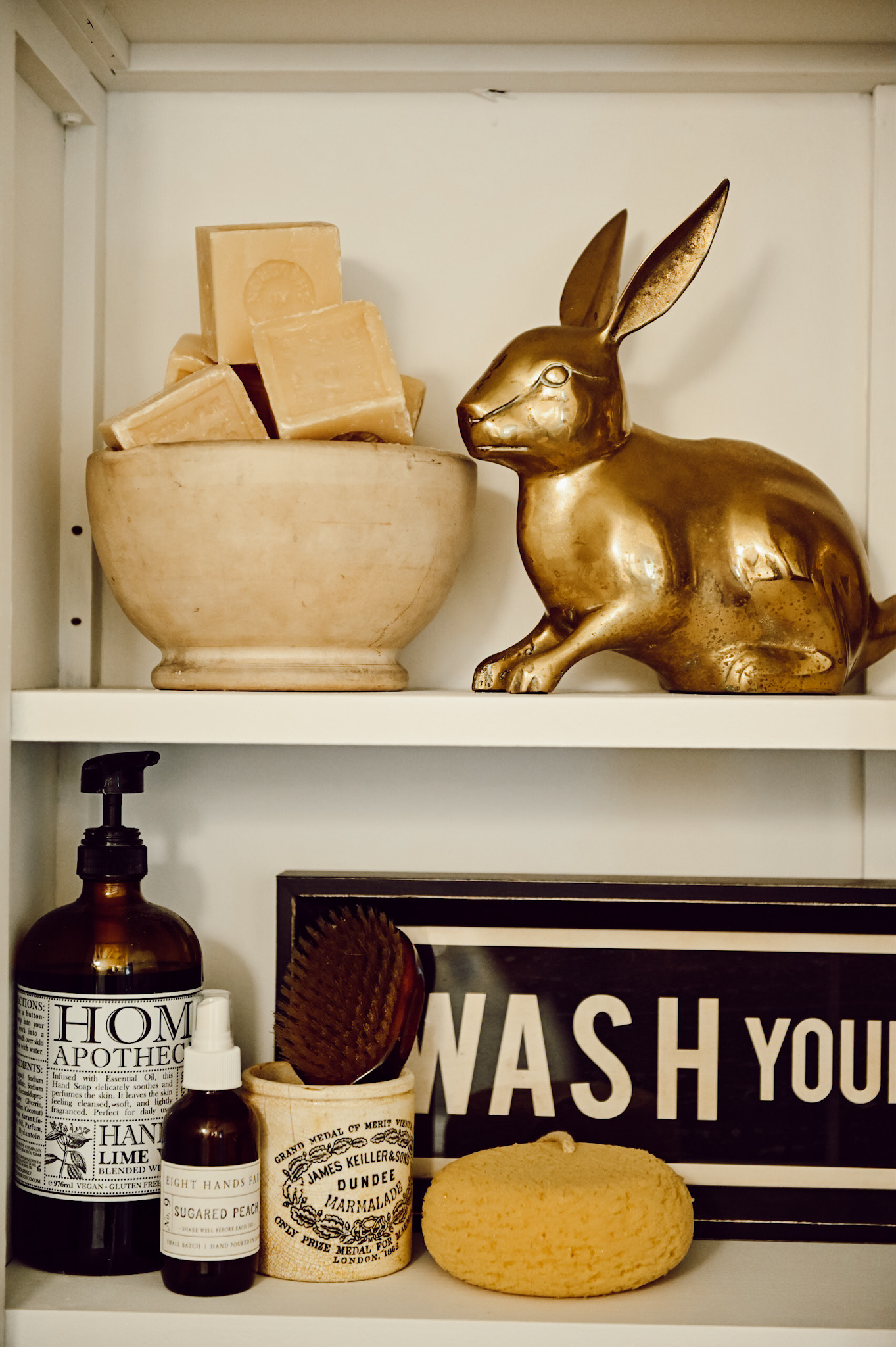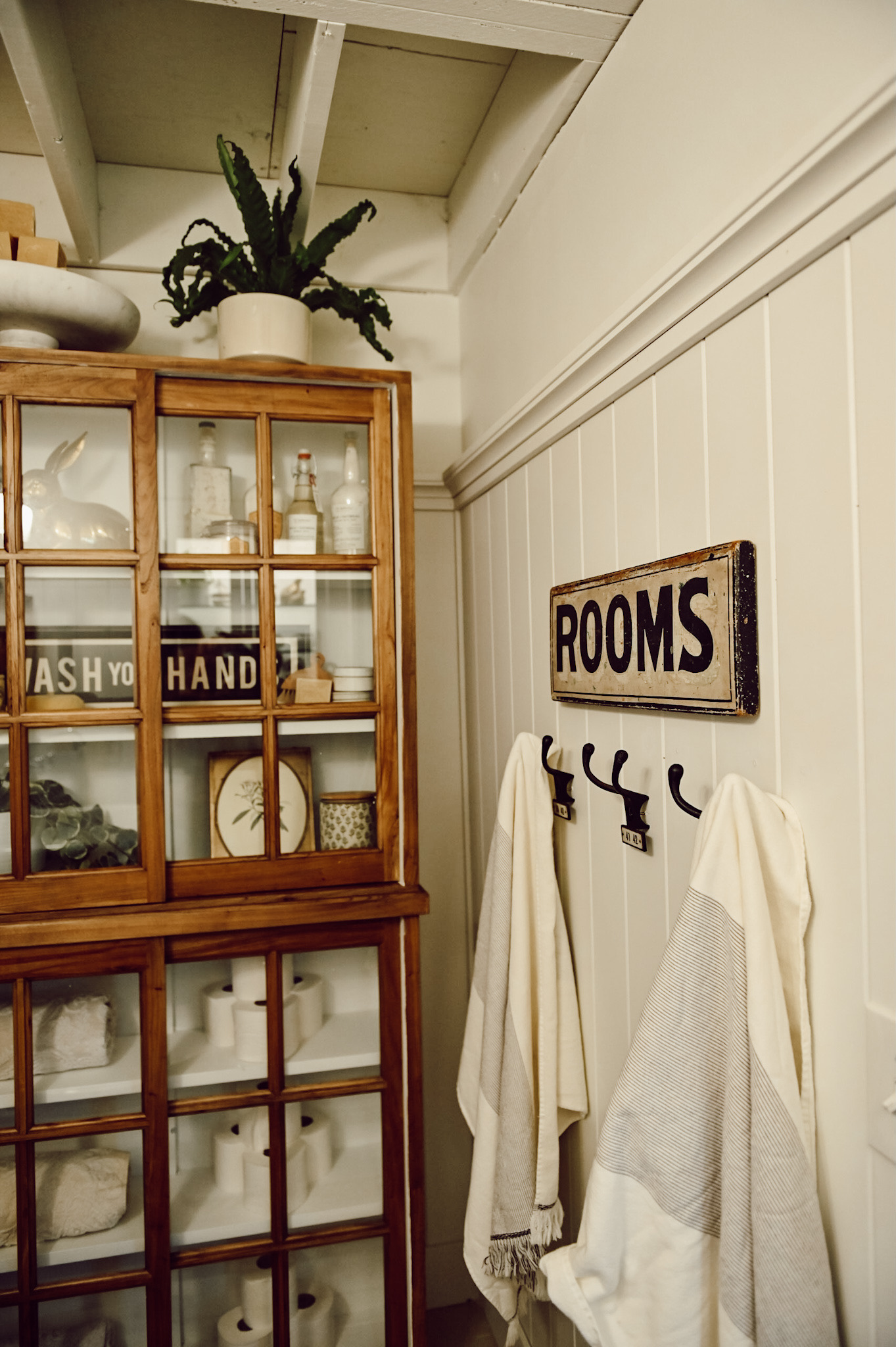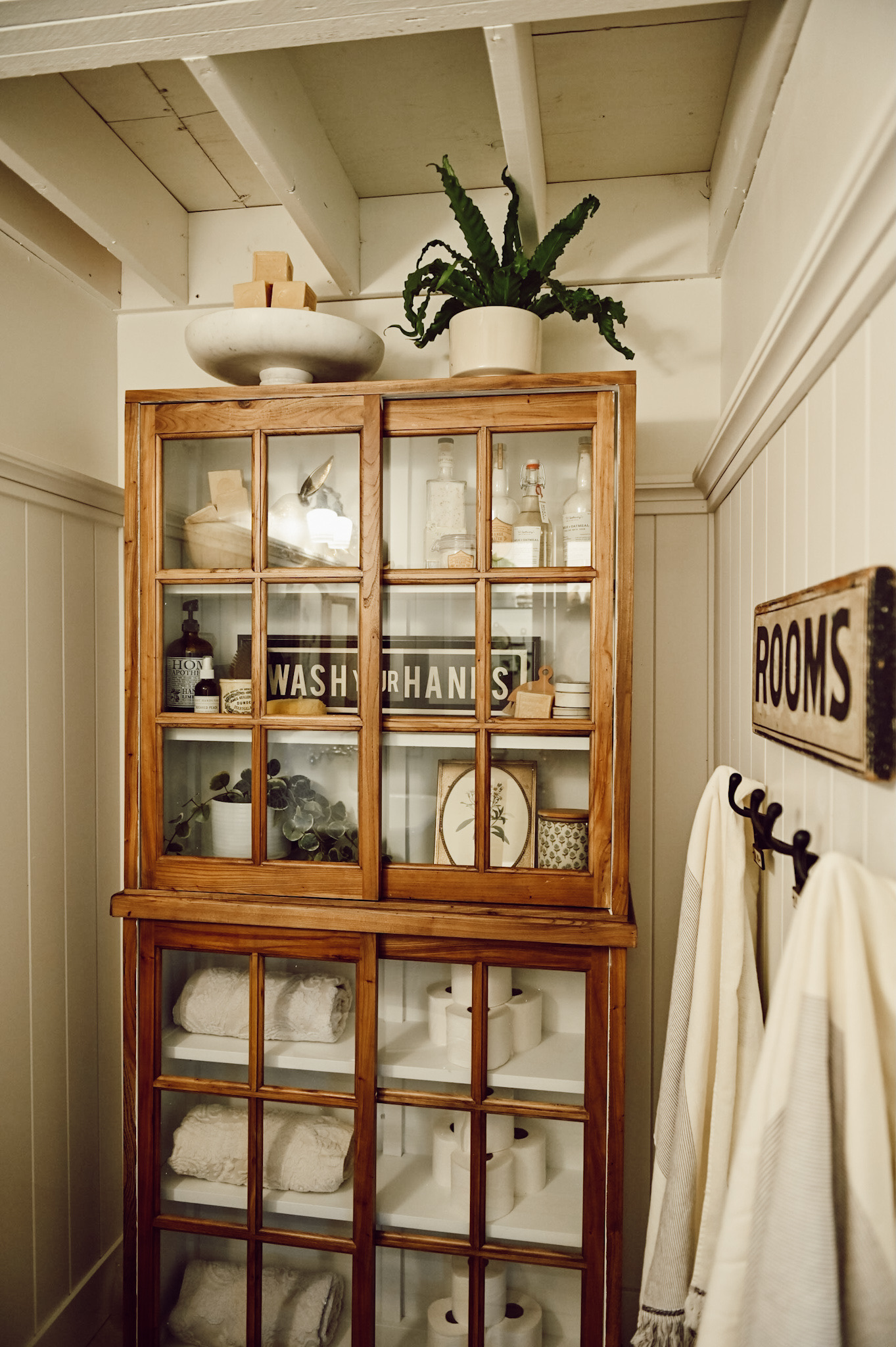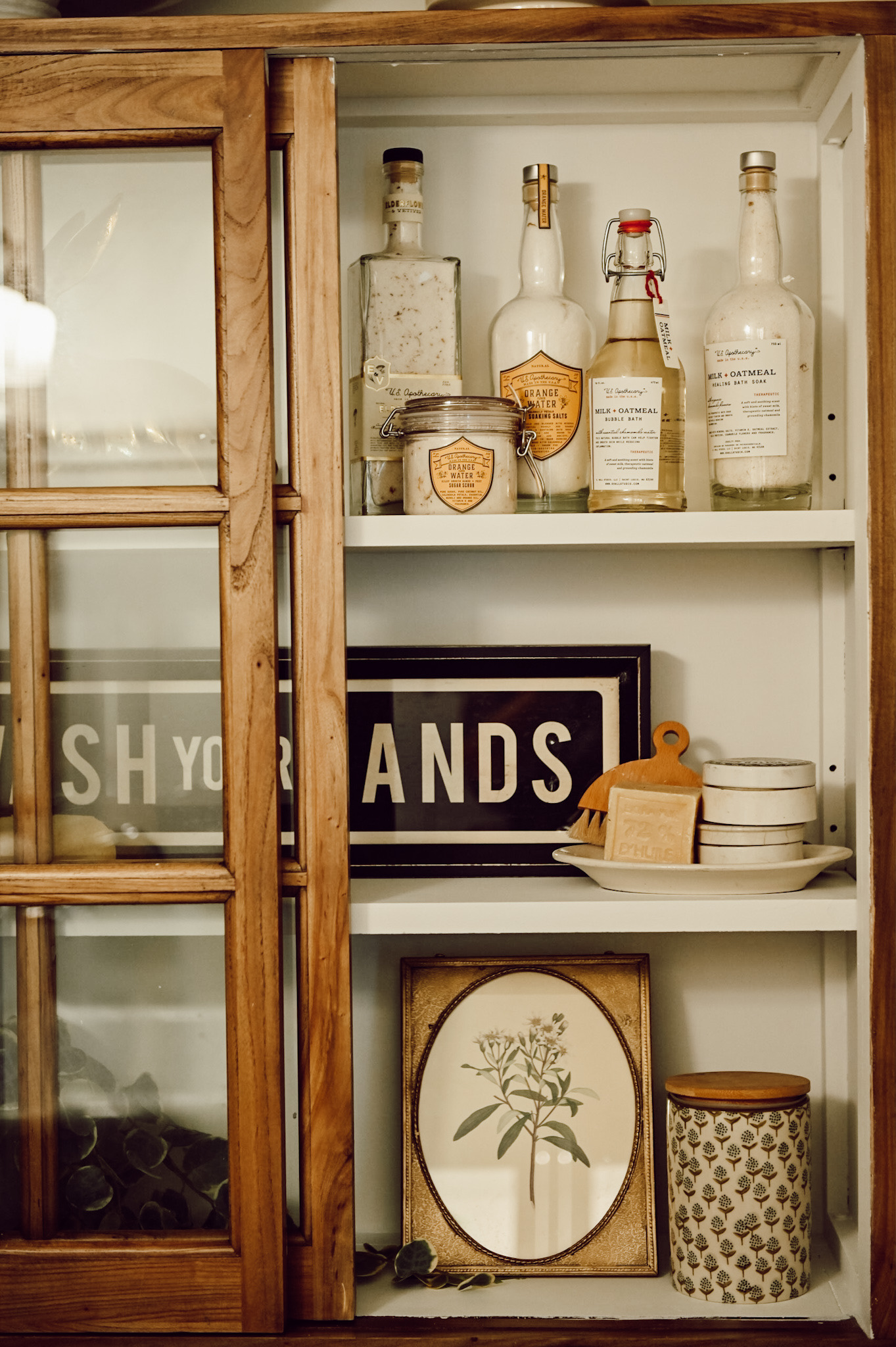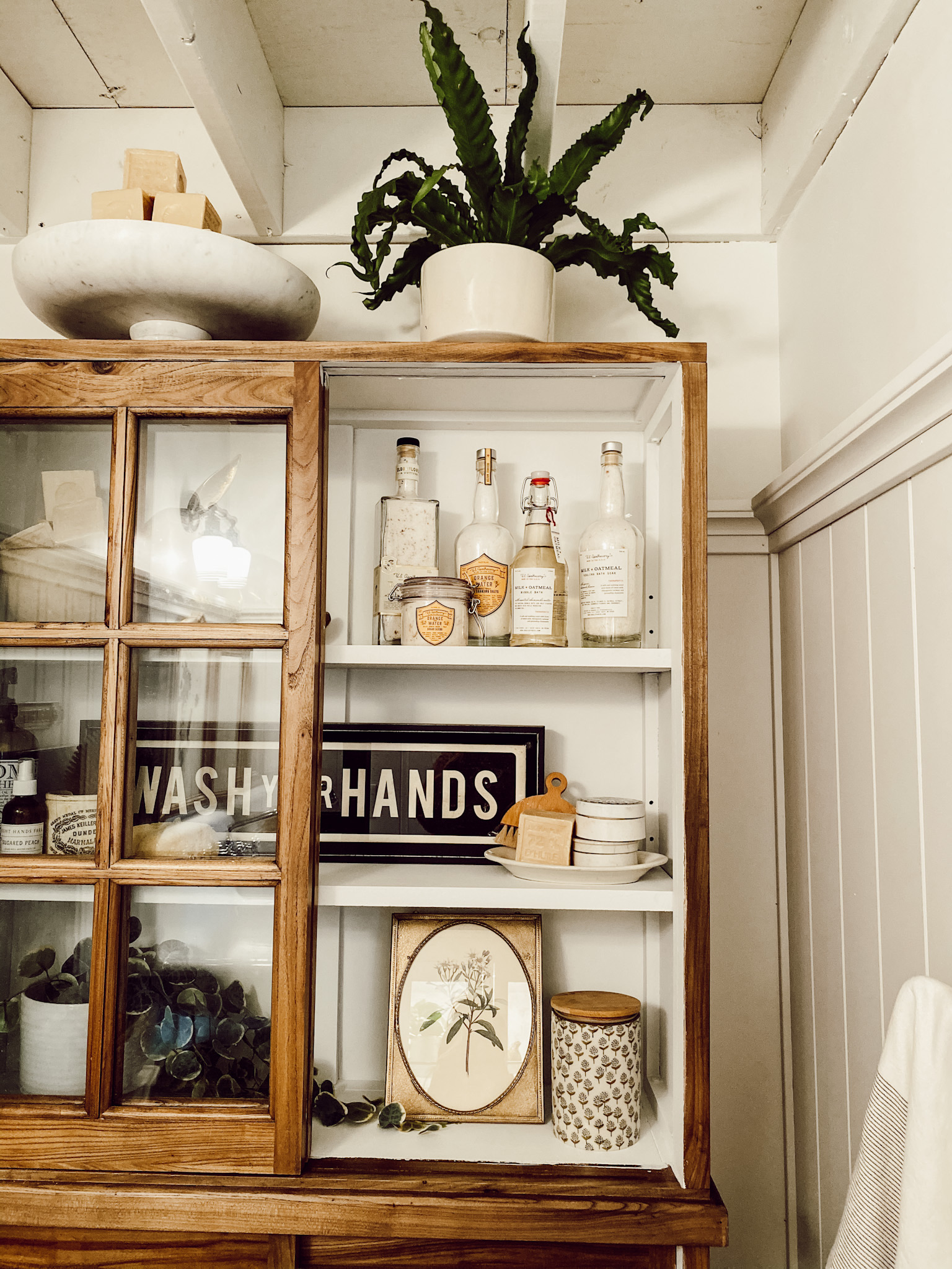 These gorgeous cabinets are really what inspired the change in the bathroom, I thought it would be really fun to switch up the bathroom and style new cabinets in here. I am still keeping the white cabinet but will use it somewhere else in the house! These cabinets are from Wayfair and I loved that they looked like they could be vintage. Unfortunately, they are out of stock already but I’ve reached out to Wayfair to see if I can get a restock date & will let you know asap! I knew I wanted to display a lot of things in these cabinets so I decided to paint the inside white, this is a great way to make your items pop when you style them inside a dark cabinet like this. That step is totally optional but I think it made a huge difference in brightening up this wall!