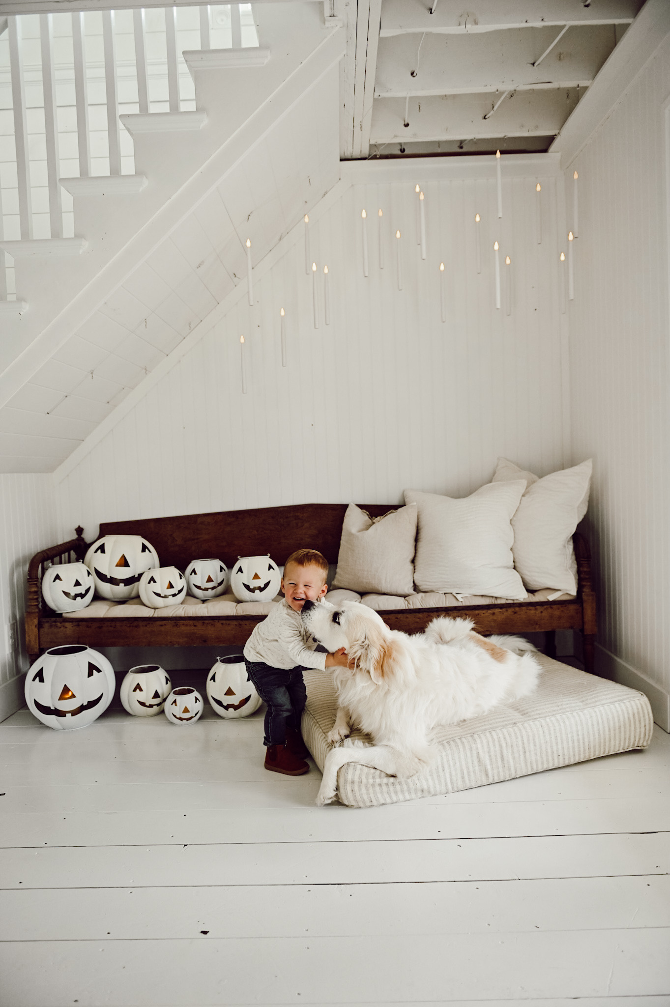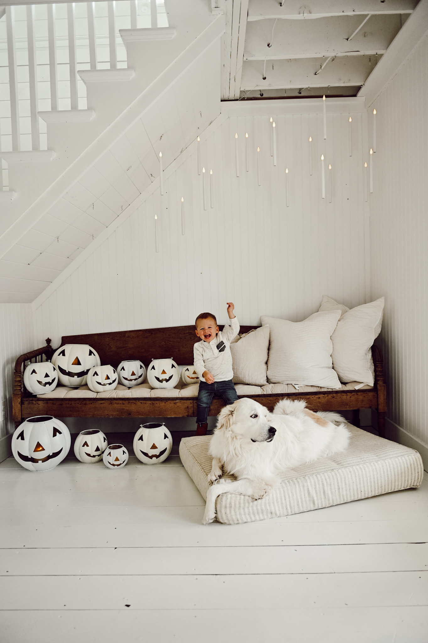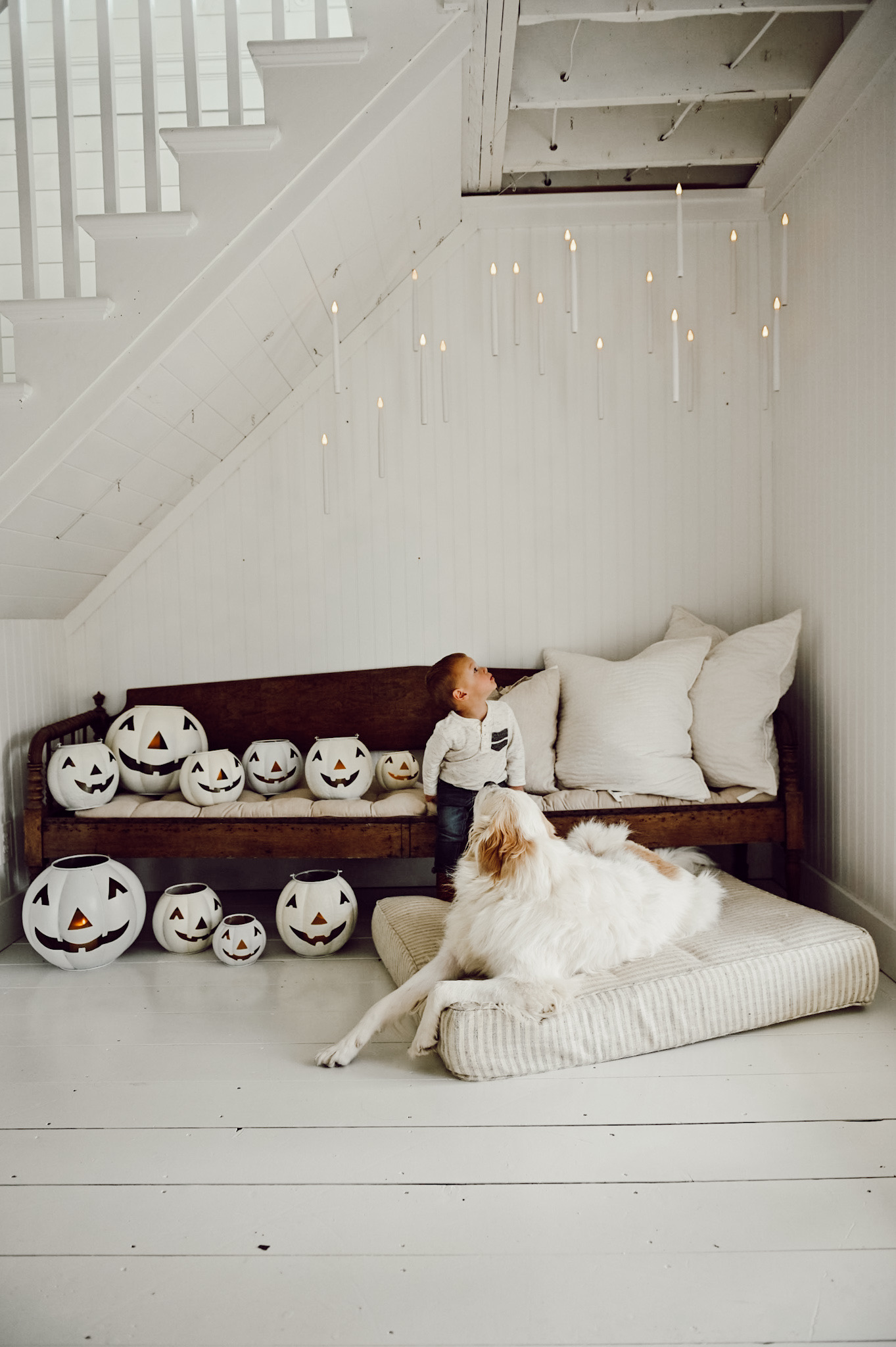 We loved how this floating lights fill-in this little space. Not only is it very Harry Pottery-like, but we also love how it’s just the subtle little touch of Halloween, floating about these little pumpkins on this bench. Cope didn’t see us put this up, so it was fun to surprise him. We brought him to the bench and Winnie joined us. It took a few moments of us pointing up before he found them… and he and Winnie thought they were so captivating.