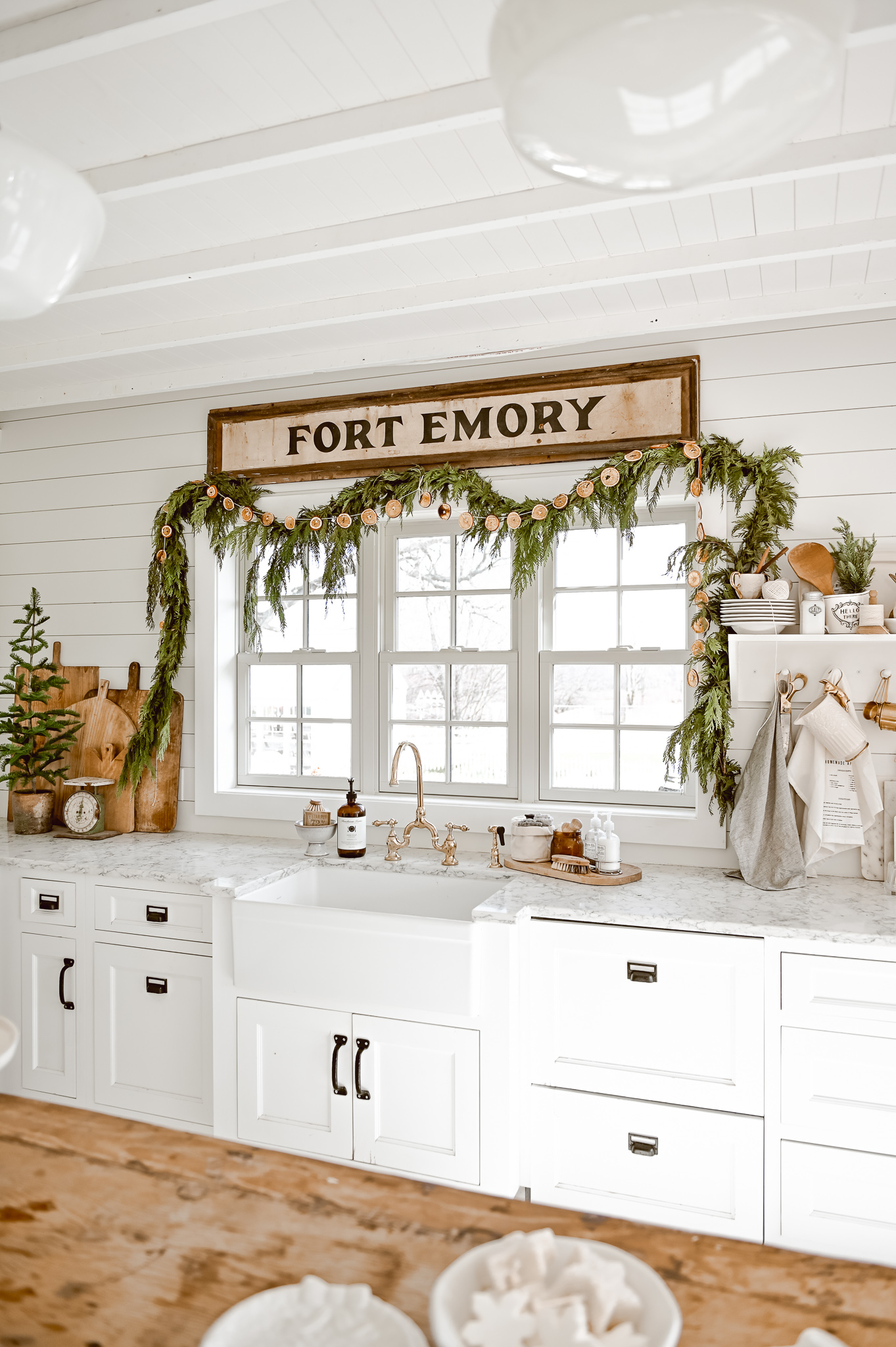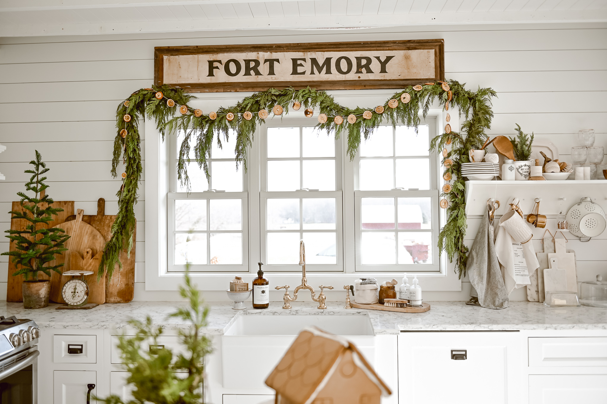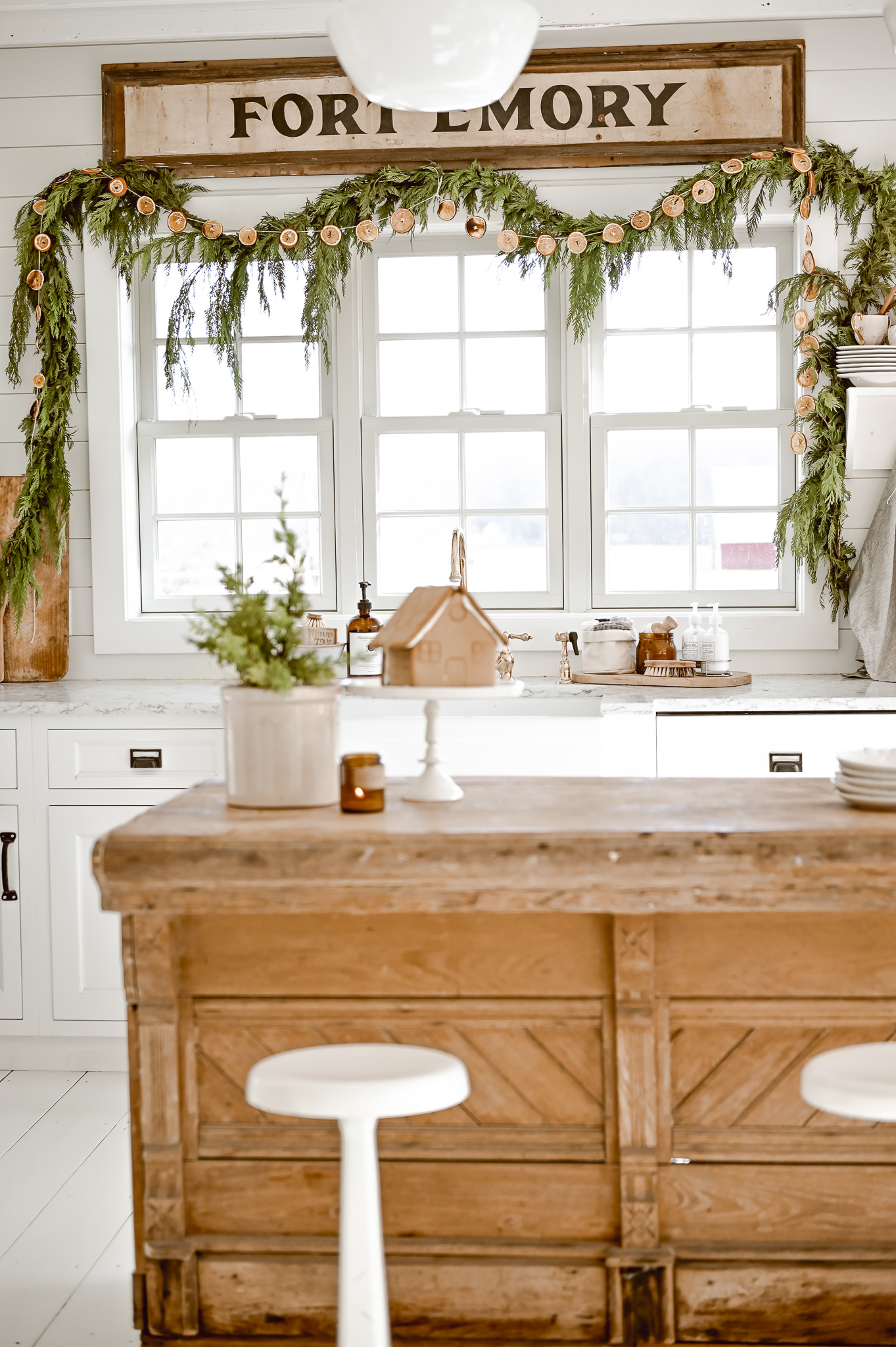 I’ll share the rest of our Christmas kitchen later, but today let’s just focus on that little window of ours. To get this look here is a little rundown of what we did: First we do a base layer with this antique Fort Emory sign. We purchased this sign from one of the lovely antique vendors at my store, The Found Cottage. We center the sign and raised it up off the top of the trim by a few inches.