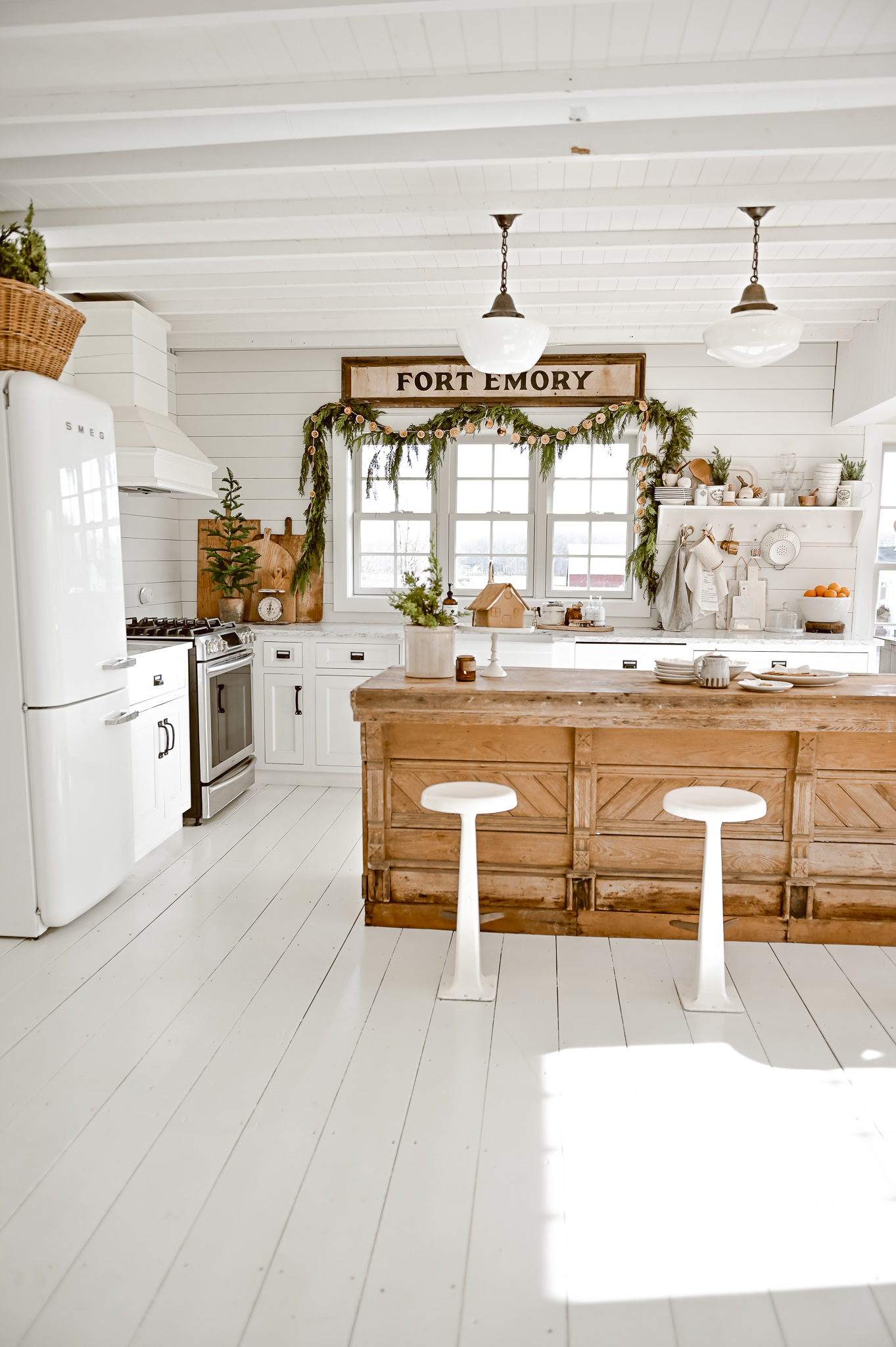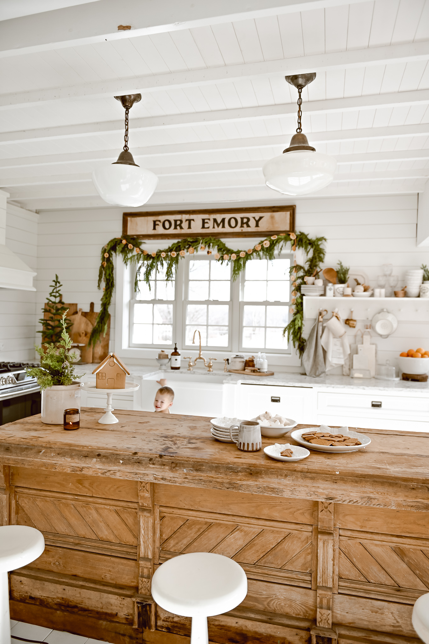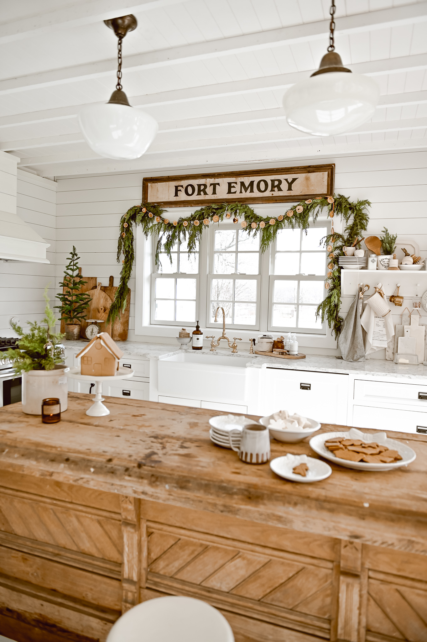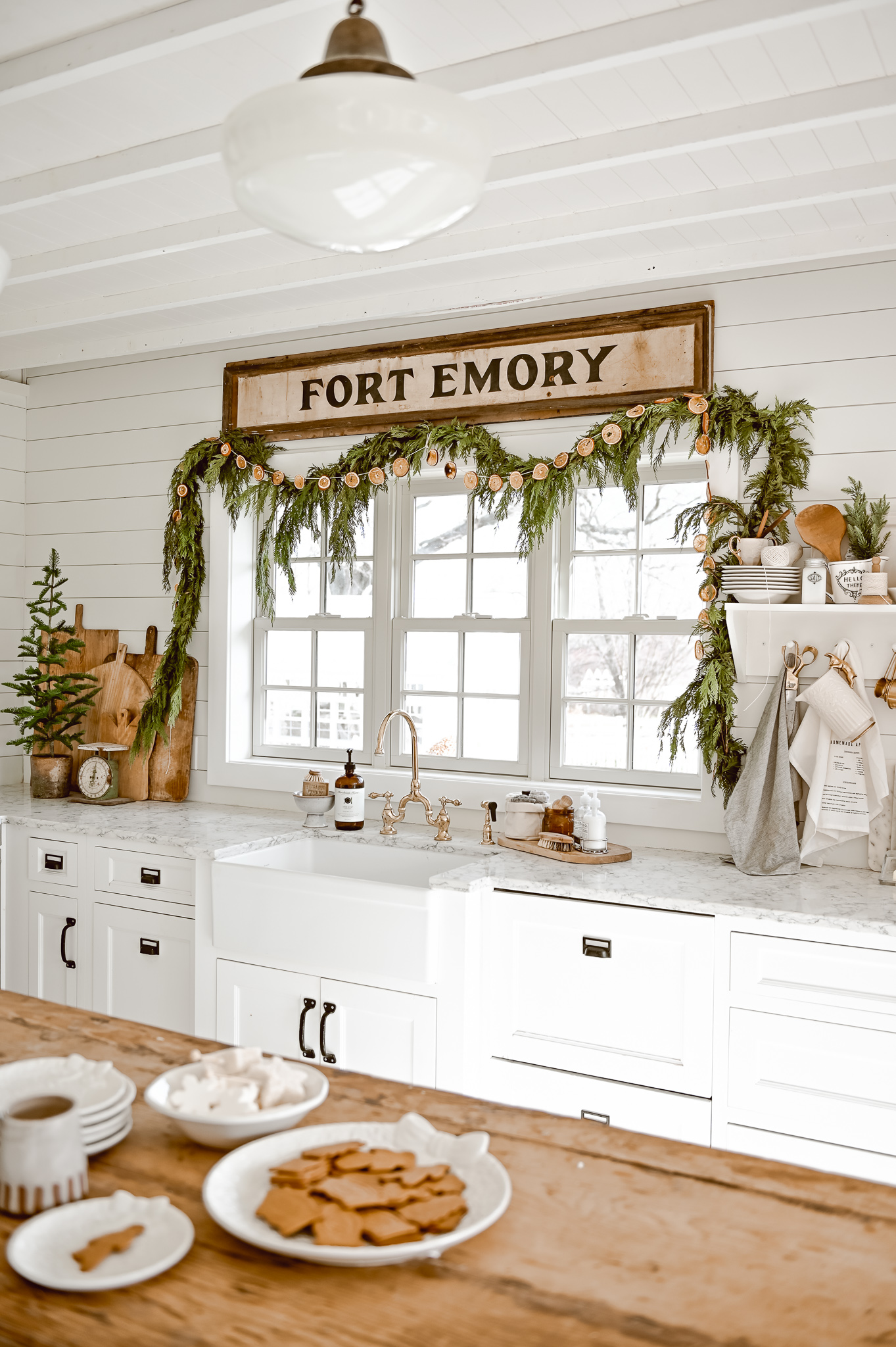 I’ll share the rest of our Christmas kitchen later, but today let’s just focus on that little window of ours. To get this look here is a little rundown of what we did: First we do a base layer with this antique Fort Emory sign. We purchased this sign from one of the lovely antique vendors at my store, The Found Cottage. We center the sign and raised it up off the top of the trim by a few inches.