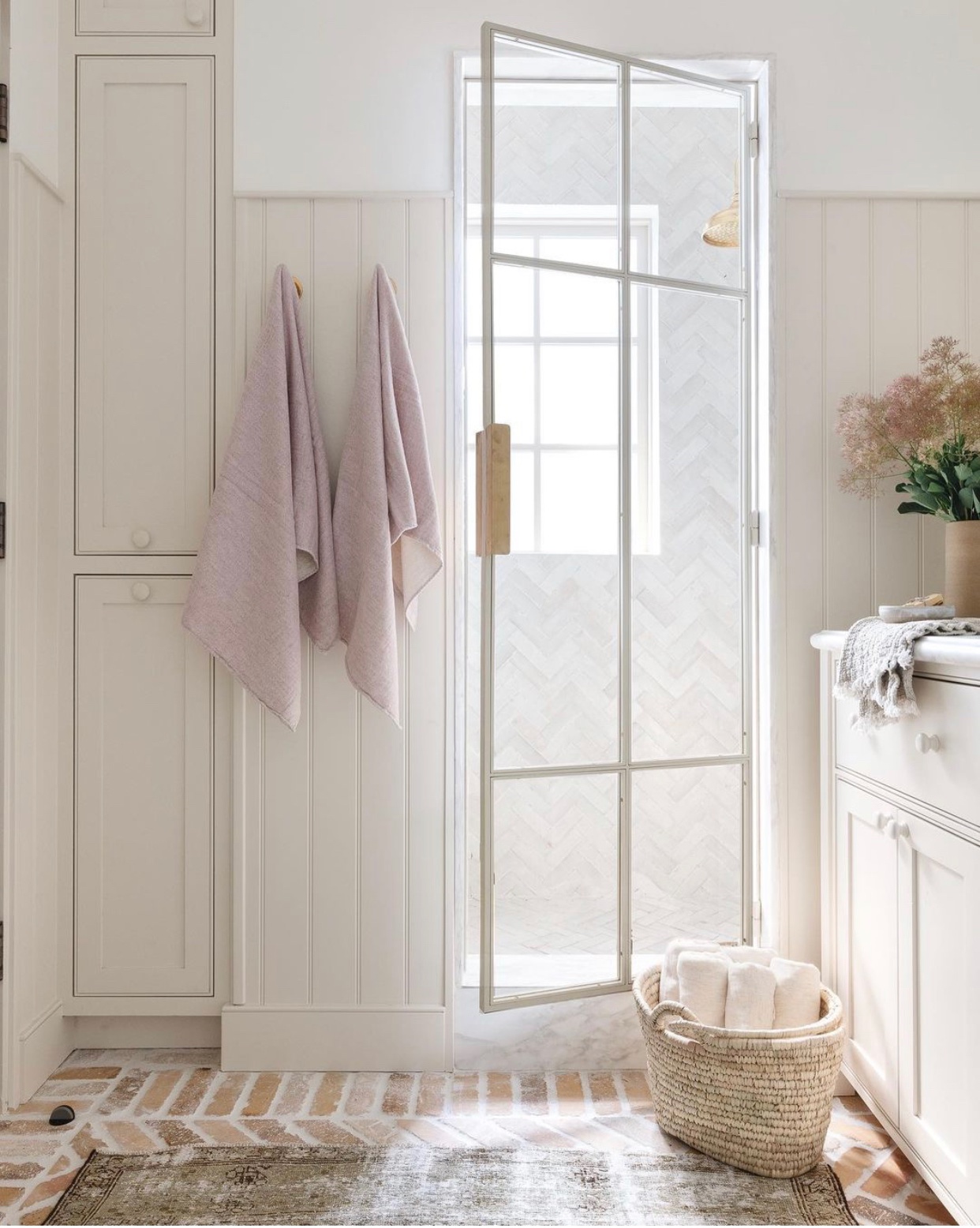 There’s something to be said about adding accents of color to a room. This bathroom by @vivirdesign and @amberinteriors proves just that. The light lilac towels and the dried florals are feminine and also simple. Also peep at those herringbone floors and that beautiful shower door.