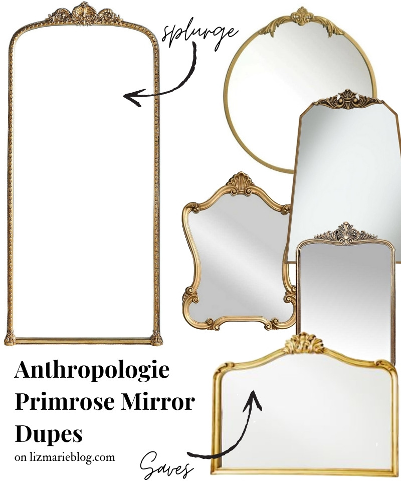 One of the biggest questions that I get is where to find a dupe for the ever-popular Anthropologie Primrose Mirror. The mirror, large and ornate, could be a great accessory to add to any room. I place one on a mantle and it instantly becomes a focal point to the room. However, the mirror is quite pricey. I searched the internet for several splurge and save mirror finds at a fraction of the price.