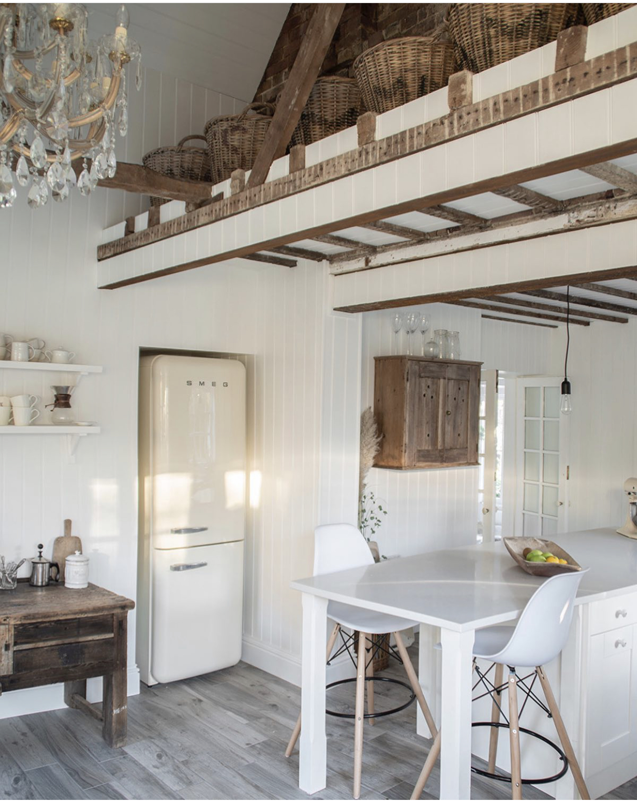 Another cottage kitchen (by @ouroldcountryhouse) but this time a little smaller. I love the baskets in the loft and the touch of glam with the chandelier. It just goes to show that no matter what size your space is you can always manage to make it cozy.