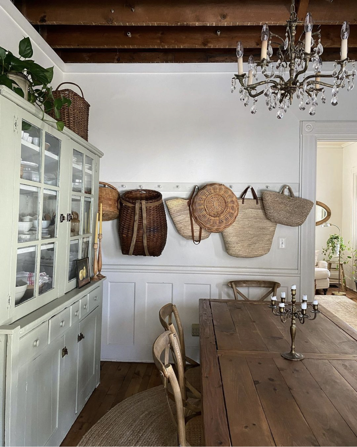 Do you have an abundance of market bags that you collect and never know how to display them? This is a great idea that is simple yet effective. The photo by @unionwillow shows market bags big and small on display in a dining room, and I enjoy how the room looks lived in and functional.