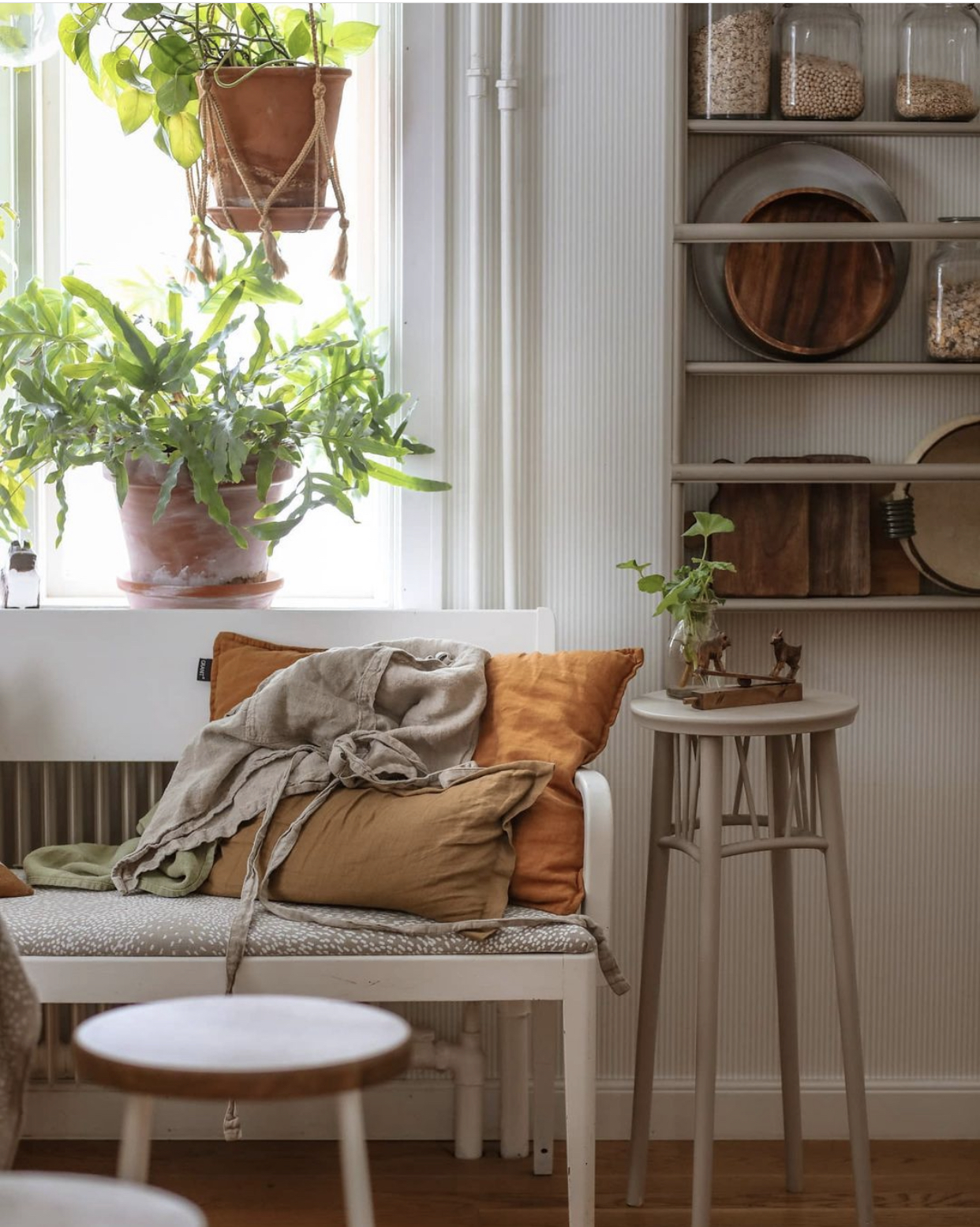 This little sitting area in the kitchen is so nice. The photo (by @froken.frida) is lived in, but also cohesive. I love the open storage unit on the wall.