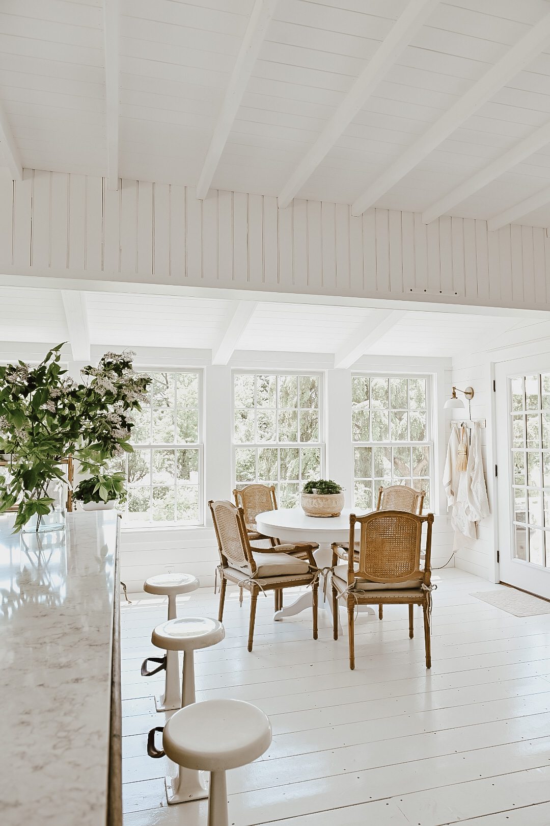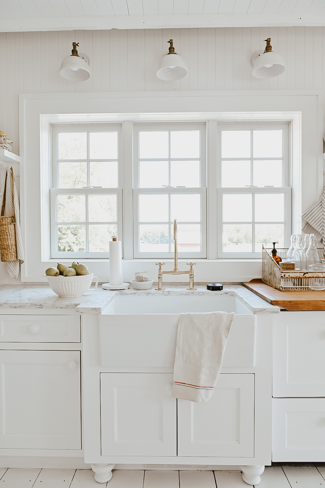 Lastly, we freshened up our kitchen with some smaller details. The the kitchen area specifically we moved from Shiplap to bead-board and updated our window trim. After we got everything trimmed in we updated the kitchen colors to Paint Color: Chantilly Lace by Benjamin Moore. Also a more French cottage/farmhouse style knob on the kitchen cabinets, and we got those Cabinet Knobs: [HERE]. Going further back we added these faux exposed floor joist and added brand new Andersen Windows around the entire kitchen. Check out how much our windows made difference [HERE]. And if you are interested on how we achieved this faux floor joist ceiling, you can check that out [HERE]. We also gave our floors a fresh new paint job a little over a year ago now, and love the new color and how its wearing. You can learn all about how we painted our entire houses floors [HERE]. You can see my sink review & source [HERE].