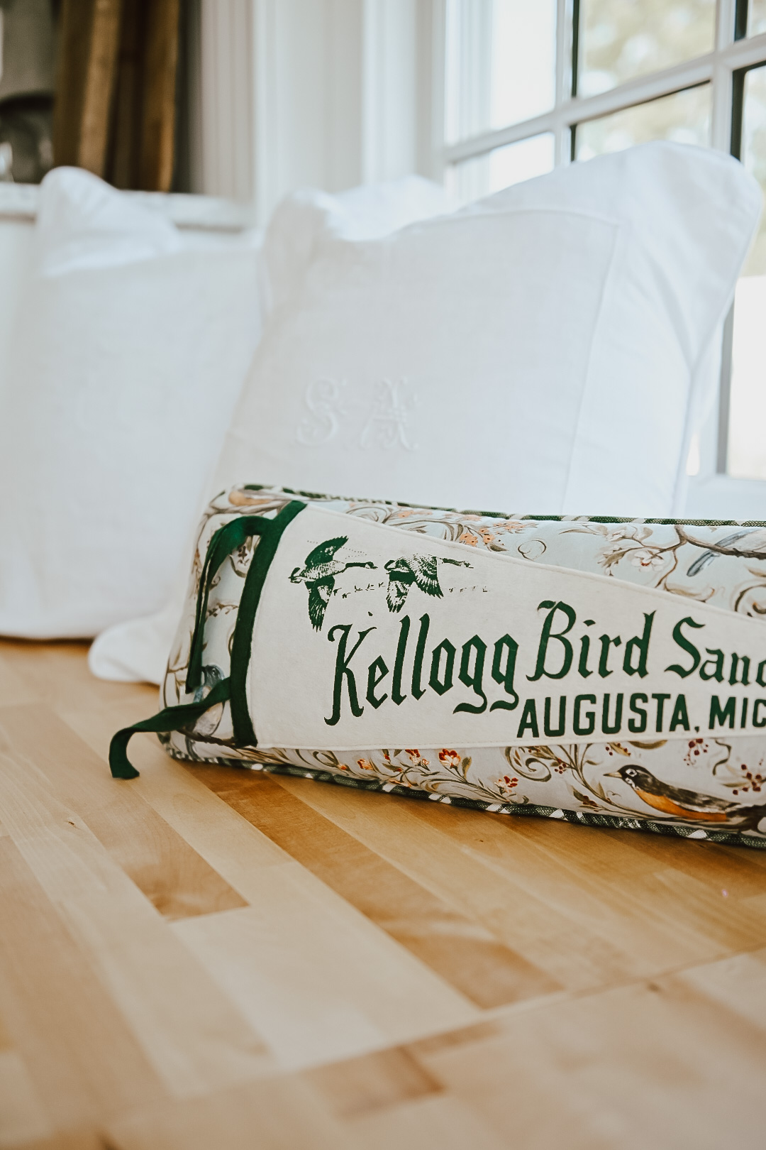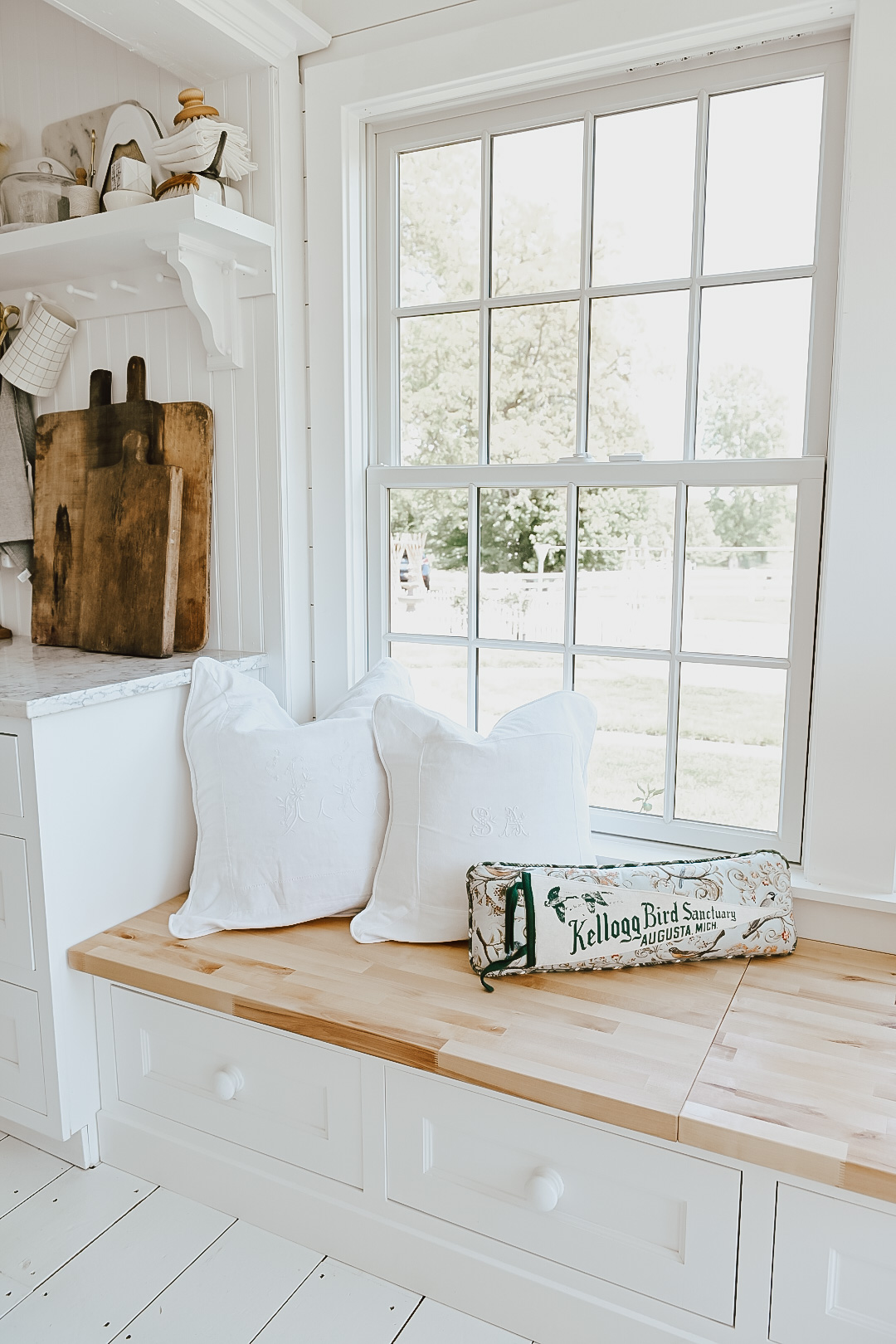 About a month ago now I shared with you that we were putting a window bench back in the kitchen! We decided to redo the top to be a butcher block wood, and I am loving how it turned out! We purchased the butcher block from Home Depot & sealed it with tongue oil. I wanted this space to be more of a bench/plant area so I love the hard surface here more. I will blog this more in depth later.