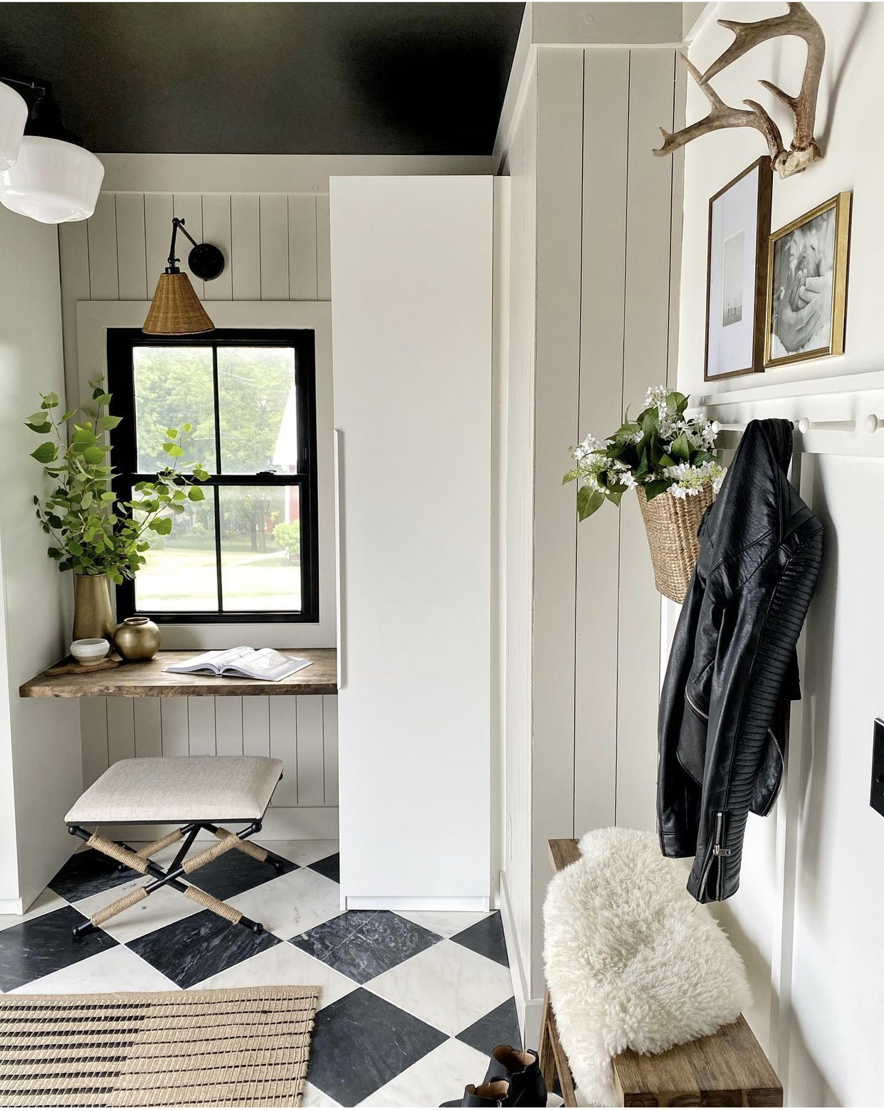 This mudroom image shared by @prvbsthirtyonegirl is so gorgeous! From the dark-painted ceiling to the harlequin tiled flooring and everything in between! This is a cozy room that I am so inspired by!