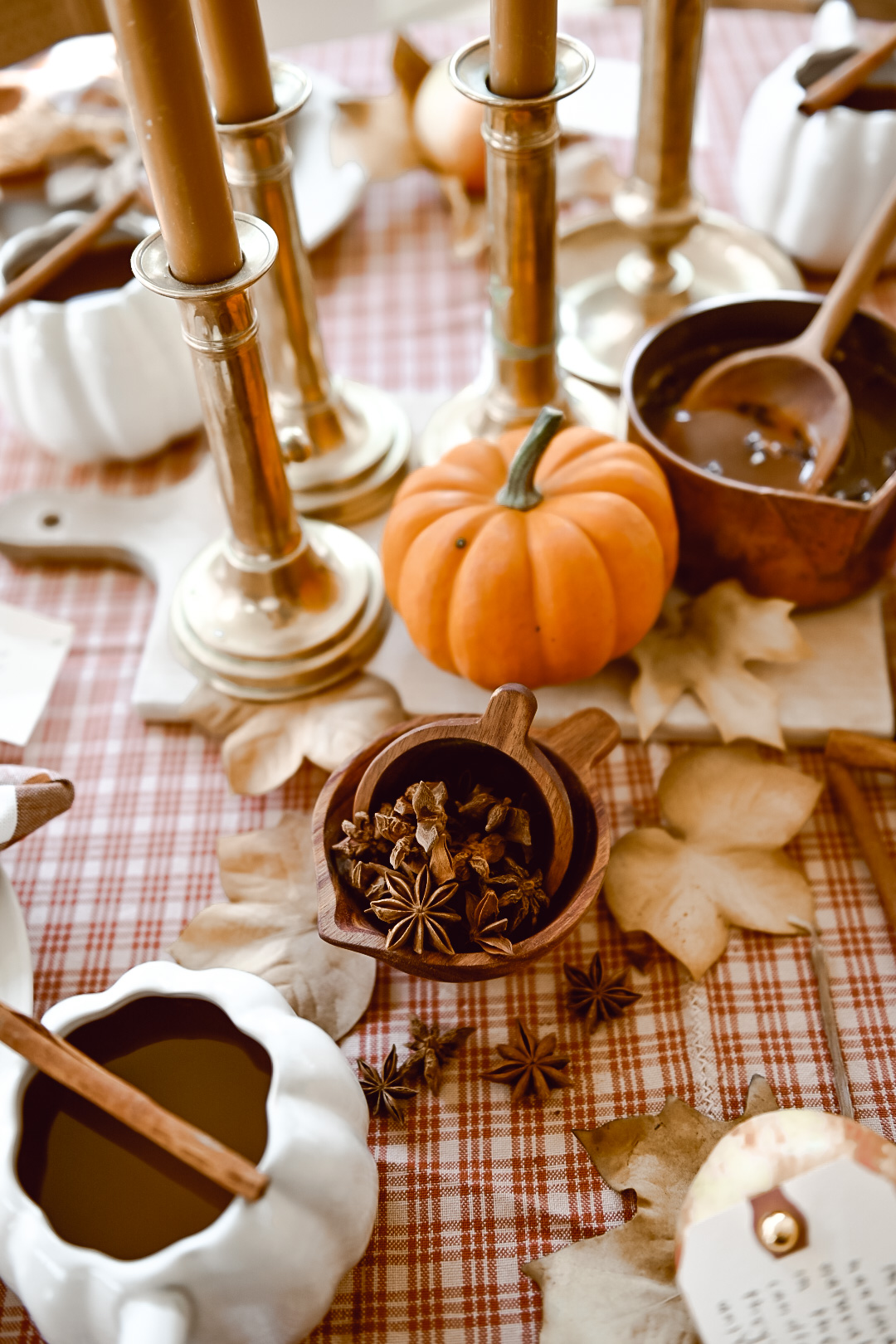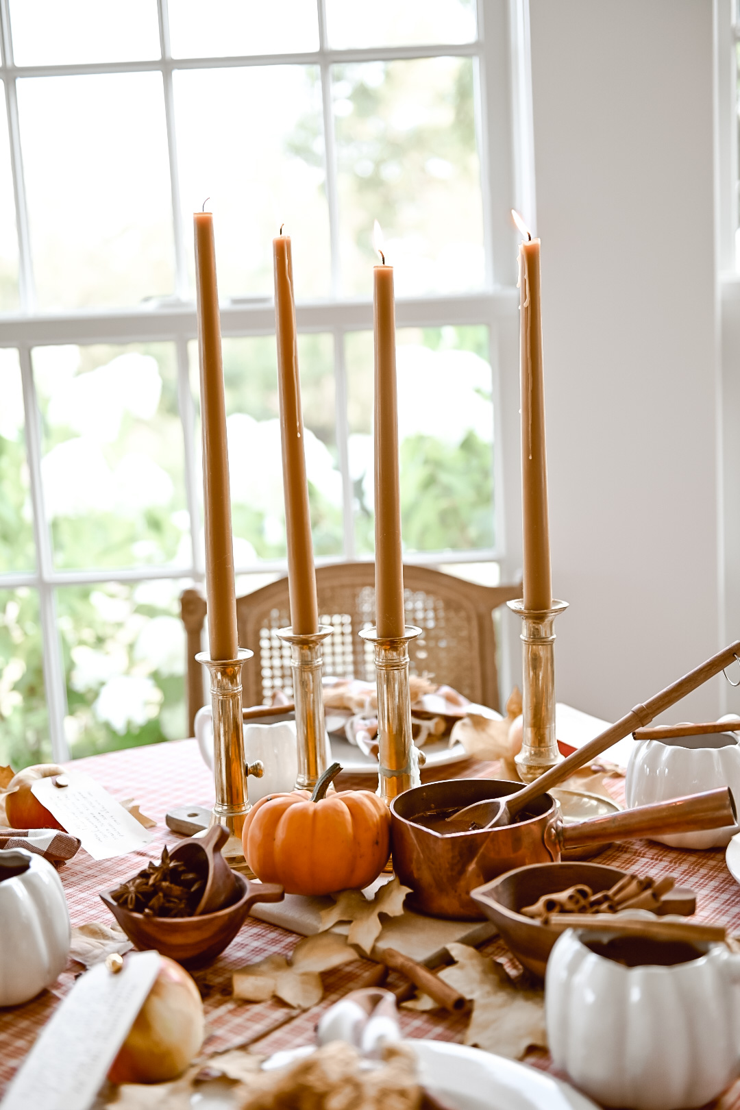 Begin with a base, For fall I prefer to use earth tones. For this table, it’s the rich in color plaid tablecloth. For a more simple tablescape, skip the base altogether and let the texture from your table be the foundation