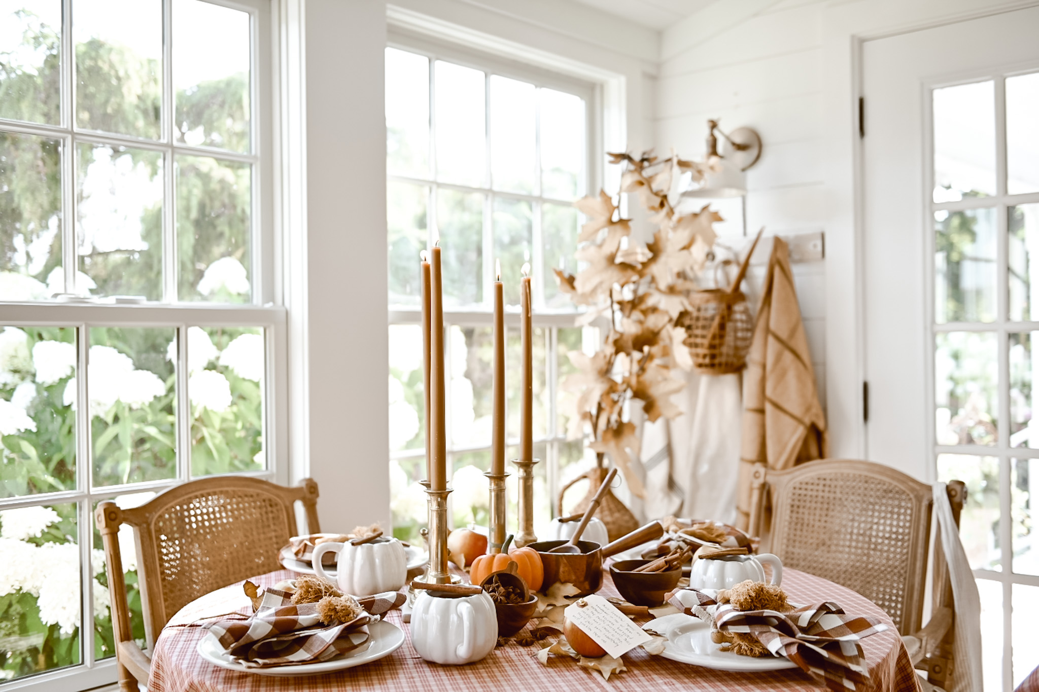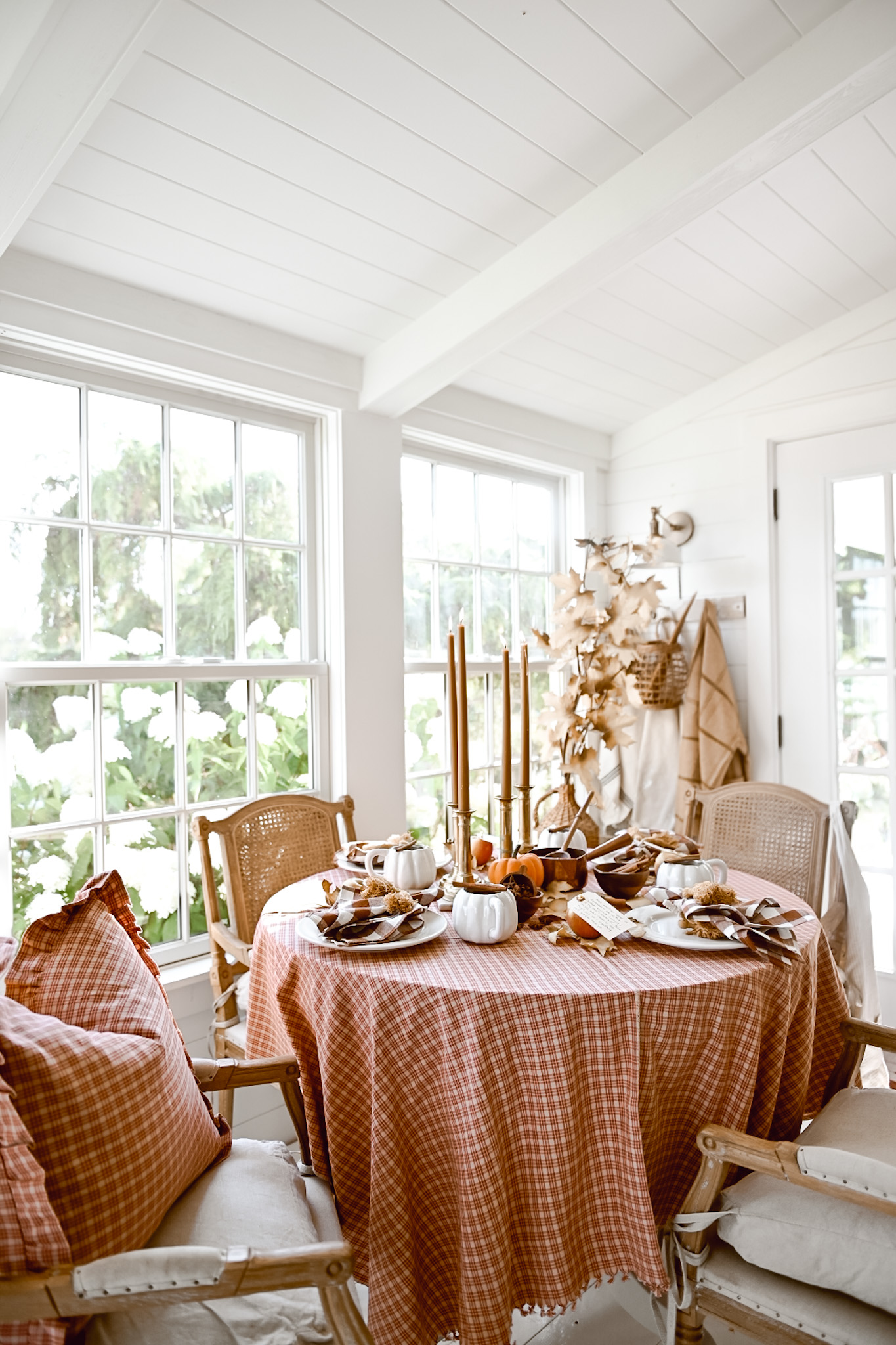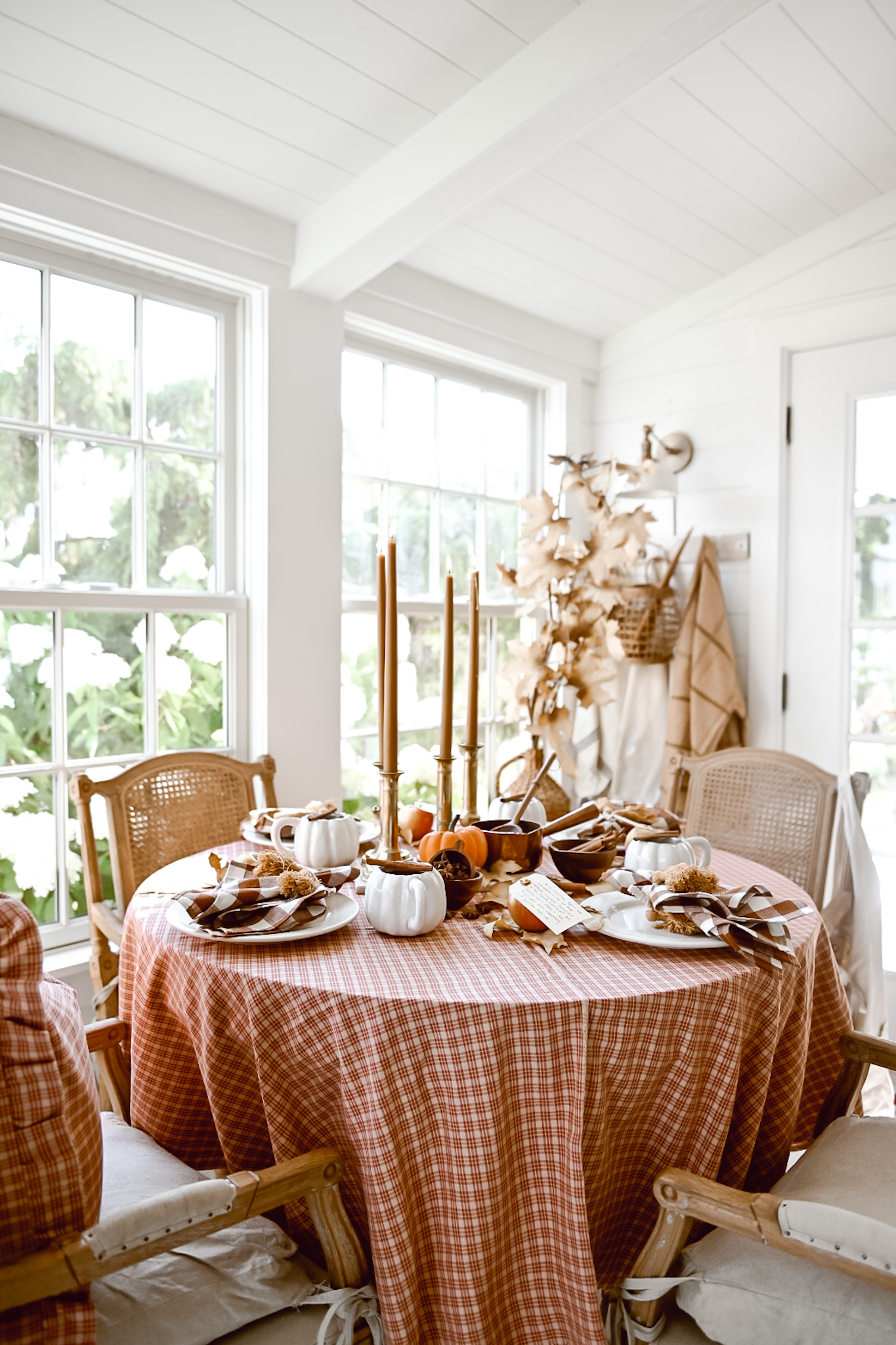 Over the weekend I styled this fun pumpkin and plaid fall table. Because this table is in our sunroom, it’s a great way to incorporate fall into our kitchen. I oftentimes style a casual tablescape featuring pieces from my collections mixed with elements of nature, however, this tablescape is a little more detailed and I am really enjoying it! I received some cozy textiles from Heather Taylor Home, a plaid tablecloth, gingham cloth napkins, and a plaid pillow.